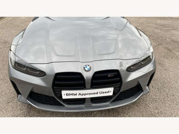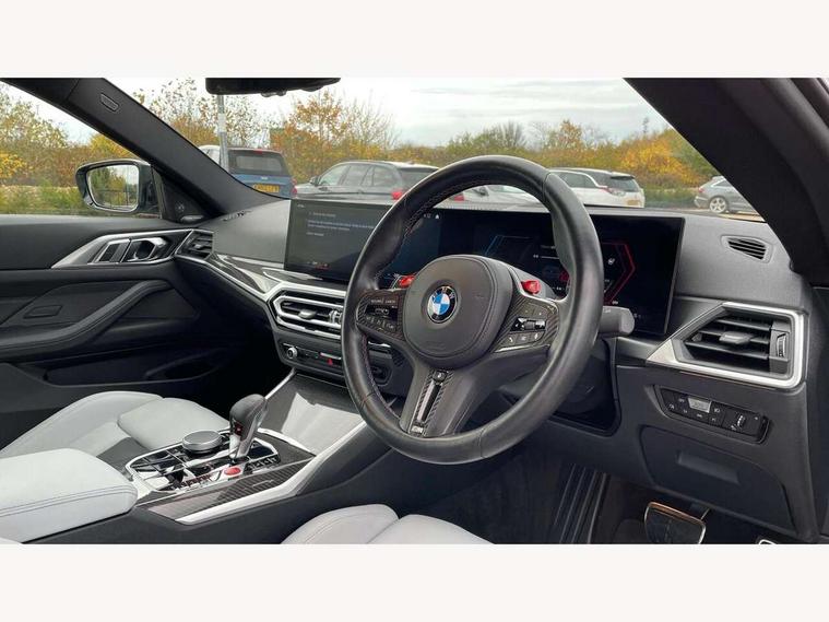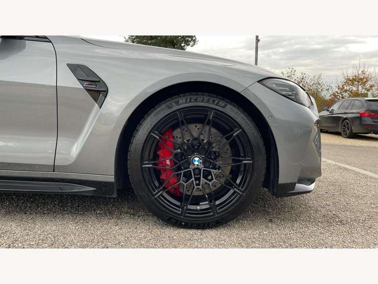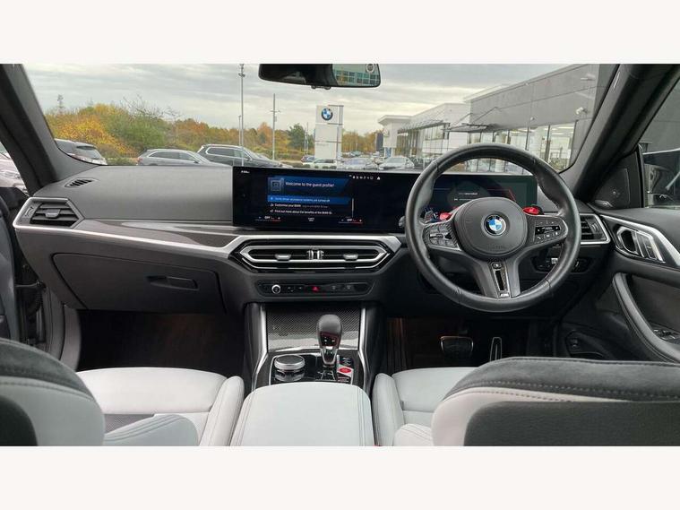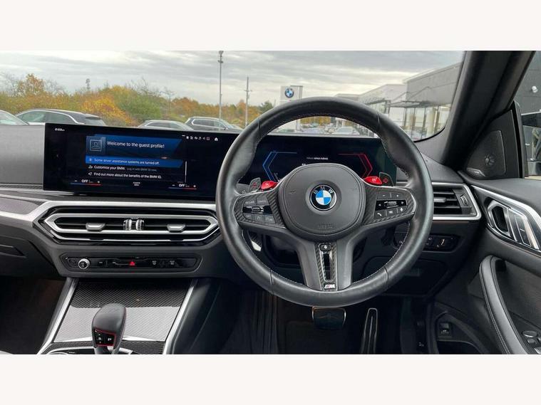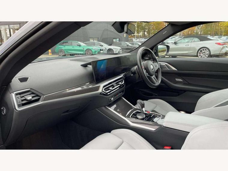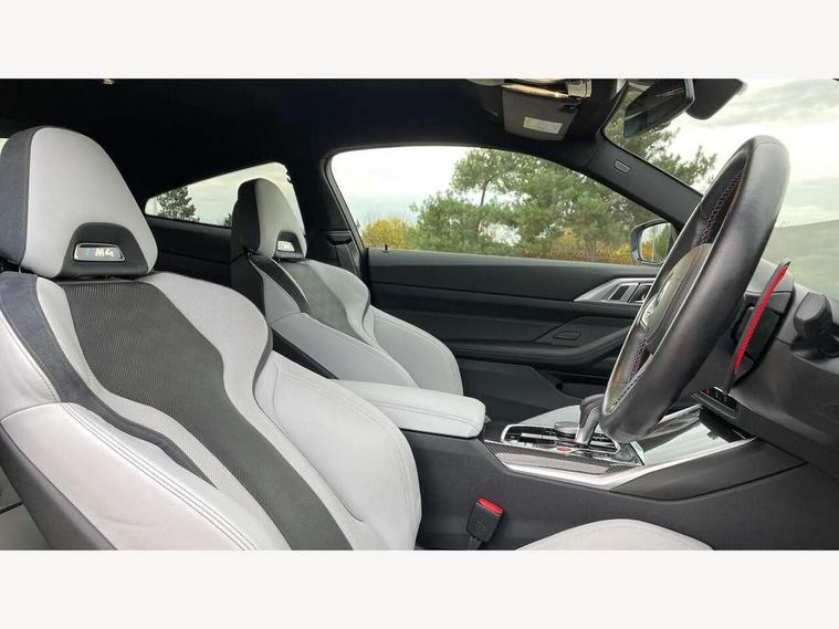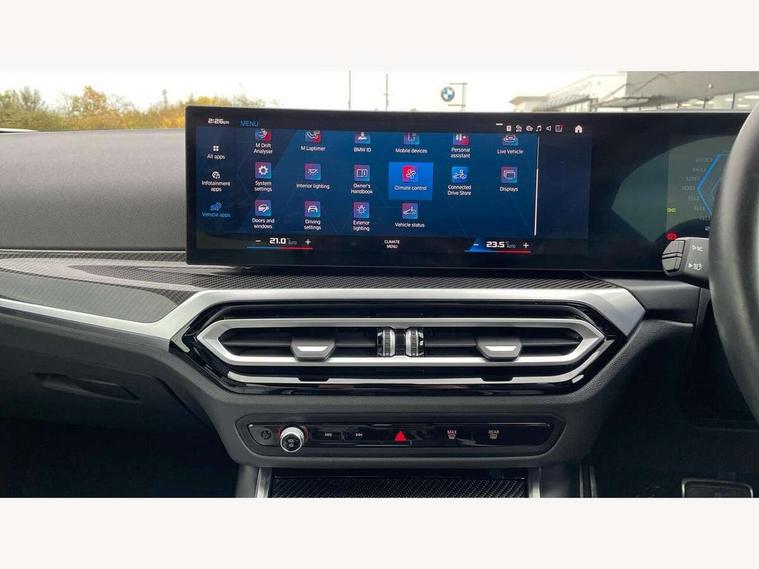 Active guard plus, Automatic start/stop system, BMW ConnectedDrive online services, BMW iDrive controller on centre console, BMW legal emergency call, BMW Live Cockpit Professional sat nav system with 12.3" instrument display and high resolution control display, BMW Teleservices, Brake pad wear indicator warning light, Condition based service, Door/boot open warning light, Driving experience switch, Electric Power Steering (EPS) with Servotronic, Instrument cluster with extended contents, Lights on warning, M drive buttons, Oil sensor for level and grade, warning by check control system, Oil temperature gauge, On board computer, On board diagnostics, Optimum shift indicator, Outside temperature display, Park distance control, Pull away assistant, Run flat indicator, Service interval indicator, Shifting point display, Speed limiter, Variable sport steering, Adaptive M Sport suspension, Double joint spring strut front axle, M Drive Professional including track mode, laptimer, traction control & Drift analyser, M Sport differential, M steptronic sport transmission with drivelogic, Safety battery terminal clamp, 8 programmable favourite buttons, Auxiliary point for auxiliary devices, BMW professional radio/CD/MP3, DAB Digital radio, Harman/Kardon loudspeaker system, Acoustic laminated side glass, Auto dimming driver's door mirror, Auto dimming rear view mirror, Automatic headlights + automatic windscreen wipers, Black chrome exhaust tailpipes, Black model designation badges, BMW high gloss shadow line with extended contents, BMW Individual shadowline lights, Body colour bumpers, Body colour door handles, Carbon fibre reinforced plastic (CFRP) roof, Day time running light, Door mirror integrated indicators, Door sill finishers with aluminium inserts, Dynamic brake lights, Electric adjustable heated door mirrors, Electric folding door mirrors, Follow me home headlights, Front and rear bumper system, Front electric windows with open and close fingertip control, anti trap facility and comfort closing, Headlight beam throw control, Heat protection, sun protection glazing, Heated washer jets, High beam assistant, High gloss black frameless kidney grille with M badge, LED number plate light, LED tail lights with 3D L-shaped LED light design, M designation, Mirror glass aspheric on driver's side, convex on passenger side, Rain sensor, Rear boot, Rear fog lights, Rear reflectors, Reversing light, Shark fin roof aerial, Third brake light, Visible VIN plate, Welcome lighting, 2 cupholders in front centre console, 2 cupholders in rear armrest, 2 rear head restraints, 2 x 12 V Power sockets (luggage compartment and front centre console), 2 x USB Type C ports for charging and data transmission in front centre console, 40:20:40 split folding rear 2 seat bench with loading system, Ambient lighting, Anthracite headlining, Battery in luggage compartment, Carbon fibre centre console incl. cover for cupholders and storage compartment, Carbon fibre decorative steering wheel finishers, Carbon fibre shift paddles, Carbon fibre strip in instrument panel on front passenger side, Centre console armrest with storage compartment, Compartment in front of cupholder, Driver/passenger sunvisors with illuminated vanity mirrors + covers, Electric front seats + driver memory, English handbook, Floor mats in velour, Footwell lighting, Front and rear door exit lights, Front door storage bins with bottle holder, Front interior light, Front isofix attachment + airbag deactivation, Front seat backrest width adjustment, Front seats lumbar support, Front/rear door armrests, Gearshift lever with embossed M badge, Heated front seats, Height adjustable front headrests, Interior mirror lighting, Isofix on 2nd row outer seats, Lockable/illuminated glovebox, Luggage compartment lighting, Multifunction steering wheel, Rake/reach adjustable steering wheel, Single front passenger seat, Storage compartment in rear doors, Storage tray and compartment with cover in centre console, Three zone automatic air conditioning, Toolkit located in luggage compartment, Wireless charging tray, Additional storage compartment pack - M4, Connected package professional - M4, High gloss shadowline exterior trim pack - M4, 4 x 3 point seatbelts, ABS/EBD, Automatic Stability Control (ASC), Brake energy regeneration, Brake fade compensation, Compound structure brake discs, Cornering brake control (CBC), Crash sensor, Curtain airbags, Driver/Front Passenger airbags, Dry braking, Dynamic brake control, Dynamic Stability Control with M Dynamic mode, Dynamic Traction Control - DTC, Electromechanical parking brake, Electronic differential lock control (EDLC), Front and rear head airbags, Front seat side impact airbags, Front seatbelt pretensioners + load limiters, Hill start assist, M Sport seat belts, Seat occupancy detection for driver and passenger side, Seatbelt warning, Side impact protection, Two tone horn, Tyre pressure sensor, Warning triangle and first aid kit, Centre lock switch, Closing system with central locking, Digital key, Electronic immobiliser, Remote central locking, Thatcham cat 1 remote alarm, Vehicle Key with 4 buttons including the integrated key, Galvanic finish to control surrounds, High gloss black interior trim, Tyre repair kit,