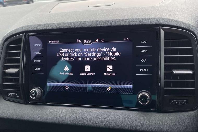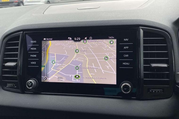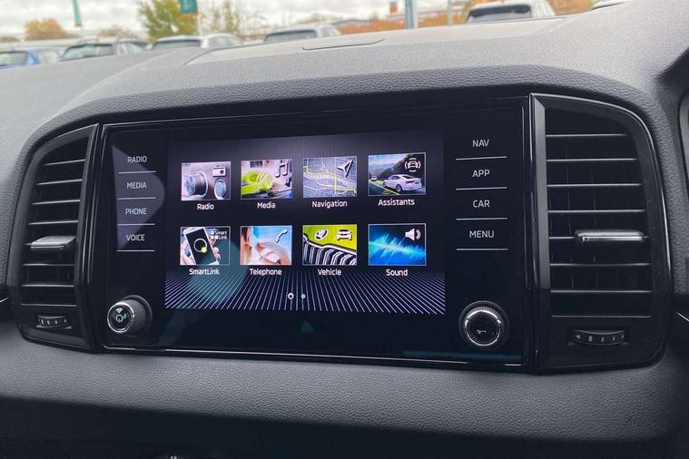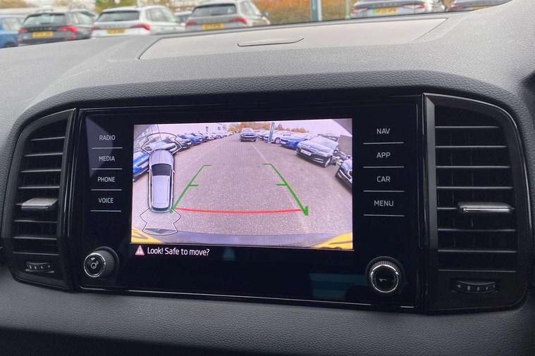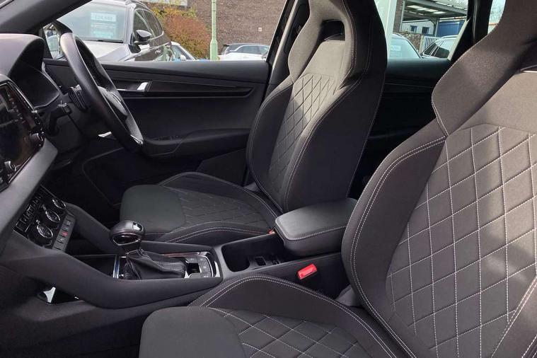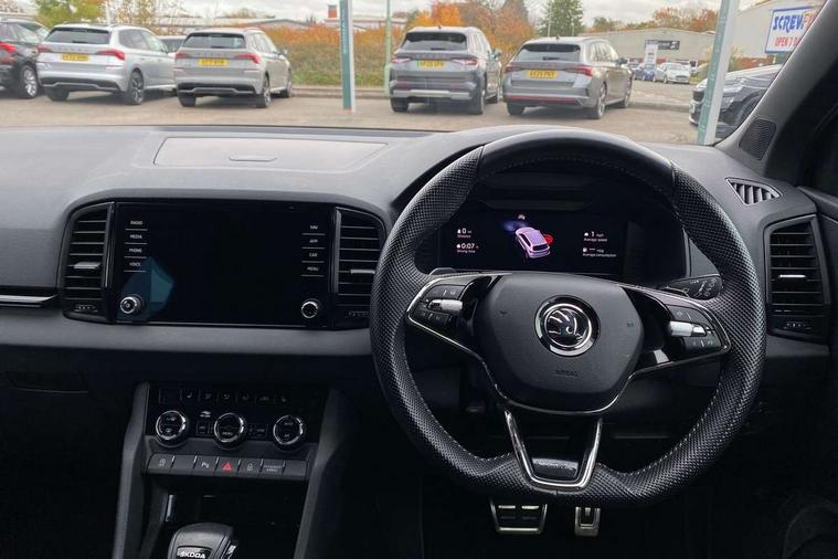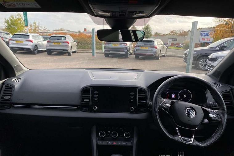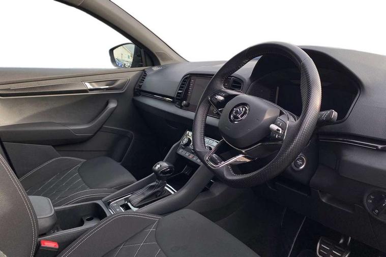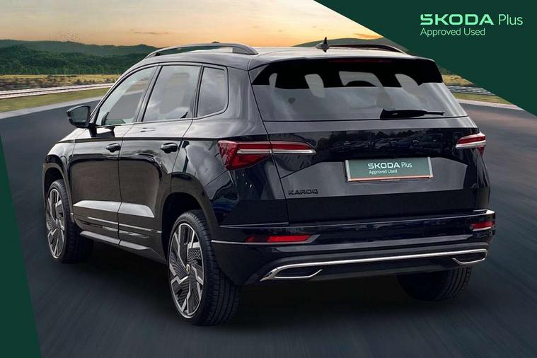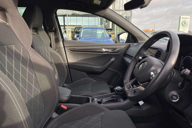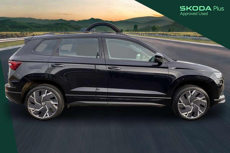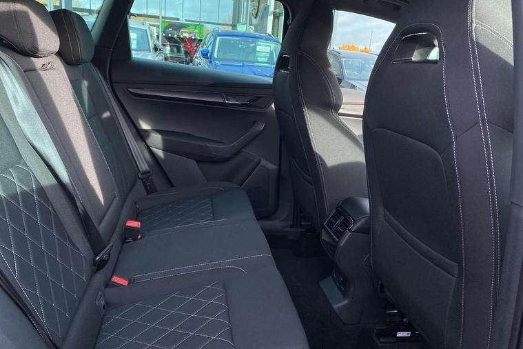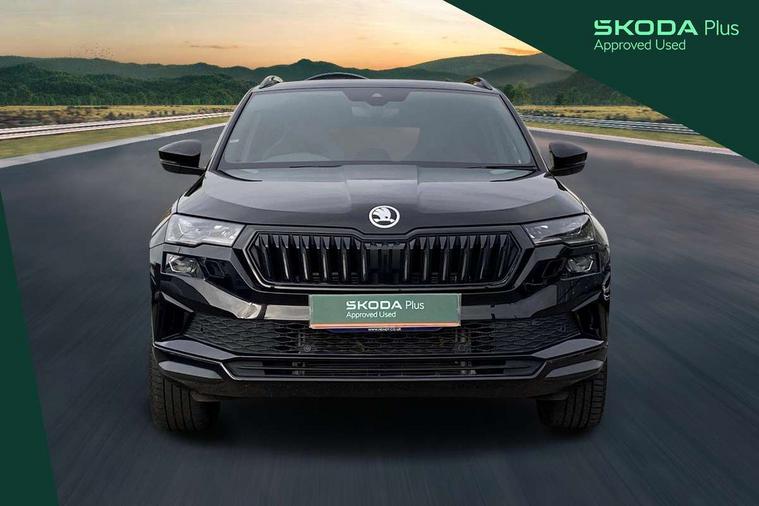 8" Digital display, Care connect, Driver fatigue sensor, Emergency services call system, Outside temperature gauge, Service interval indicator, SmartLink wireless for Apple and wired for Android, Start/stop system with regenerative braking, USB C Port x 2 in front centre console, Virtual pedal with electrically operated boot door, 8 Speakers, DAB radio with Bluetooth, USB connection, Acoustic glass, Aero front windscreen wipers with intermittent function, Auto dimming rear view mirror with light and rain sensors, Black door mirrors, Black electric window control buttons, Black radiator grille, Black roof rails, Body colour door handles, Dynamic headlight range control with cornering light function, Electric front and rear windows with child proof lock, Front door steps with SportLine logo, Heated rear windscreen, LED daytime running lights, LED rear lights with high functionality welcome effect and dynamic indicators, Light assistant (coming/leaving home/tunnel light), Panoramic sliding sunroof, Plastic scuff plates, Privacy glass, Protective door side sills in body colour, Rear diffuser, Rear side wing doors, Rear spoiler, Rear window wiper with washer system and intermittent control, Safety reflectors on front doors, Skoda lettering on tailgate in black, Sportline badge on front fender, Sportline decorative inserts with badging, Sports front and rear bumpers, 1.5 litre bottle holders in driver and front passenger door panels, 12V socket in boot, 12v socket in front centre armrest with storage compartment and rear air vents, 2 Folding hooks and nets in boot, 3 rear height adjustable headrests, 3 seat bench in 2nd row, 3 spoke leather sports multifunction steering wheel and silver stitching with gear shift paddles, 4 foldable roof handles with rear coat hooks, Black floor carpet, Black roof headlining, Chrome inner door handles, Double sided boot floor, Foldable hooks in the boot, Front head restraints, Height adjustable front three point seats belts with tensioners, Height/reach adjust steering wheel, Ice scraper, Illuminated glovebox, Illuminated luggage compartment, Isofix child seat preparation outer rear, Manual lumbar support for front seats, Pen holder, Pollen filter, Rear boot cover, Rear reading lights, Rear seats fixed folding and divided 60:40, Rubbish bin door, Safety vest holder, Single front passenger seat, Storage box in upper central dashboard closed, Sunvisors with illuminated vanity mirrors, Textile floor mats, Ticket holder, Titan black interior ceiling, Welcome animation with sportline logo, Light Pack - Karoq, Parking pack - Karoq, Automatic door unlocking in case of crash, Automatic fuel cut off in case of crash, Child locks on rear doors, Driver airbag, Electronic parking brake with auto hold function, Emergency rear braking signal, ESC including ABS, MSR, ASR, EDS, HBA, DSR, RBS, MKB and traction control, Front side airbags, Hill hold control, Knee airbags, Passenger airbag with switch-off function, Pedestrian monitor, Seatbelt reminder signalisation and pretensioner for all seats, Three point seatbelts rear, Two tone horn, Tyre pressure display, Tyre pressure monitor, Alarm with interior monitoring, back up horn and tilt sensor with safe function, Electronic engine immobiliser, Keyless entry and start/stop, Remote central locking with 2 remote folding keys, Black air vent surround, Black centre console, Satin black dashboard, Satin black door trim, 19" Sagitarius anthracite alloy wheels with matt black aero inserts, Anti-theft wheel bolts protection, Matt black aero hub caps, Storage on wheel cover, Tool kit,