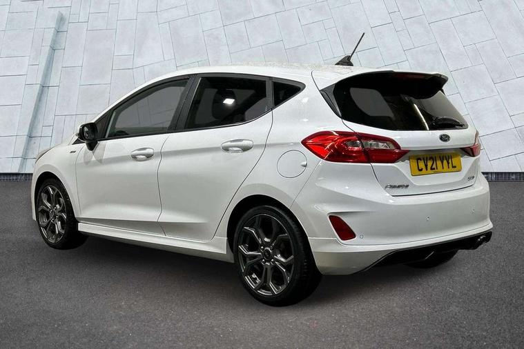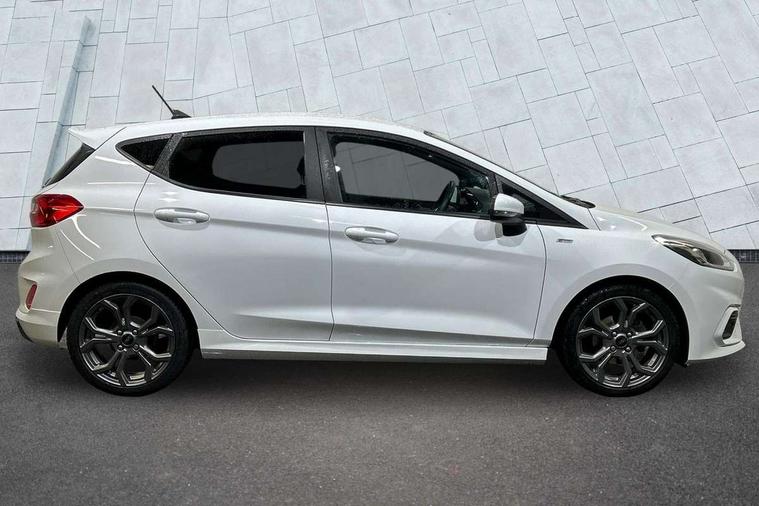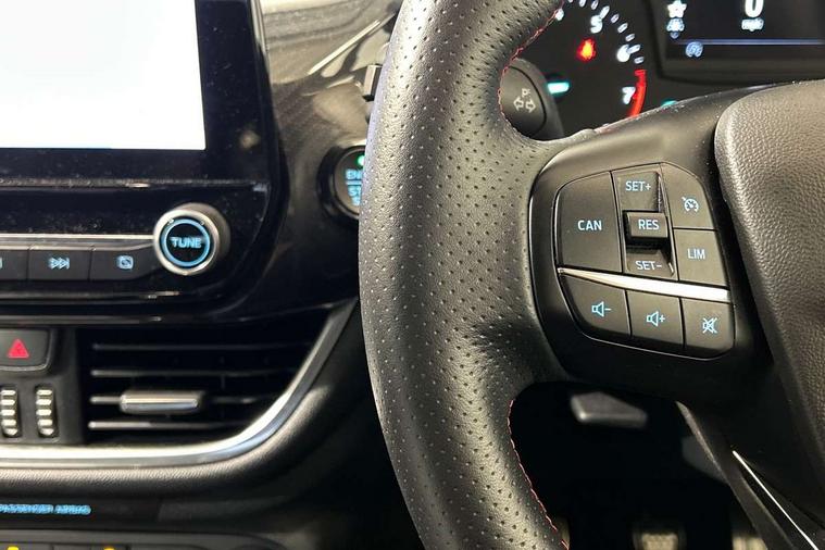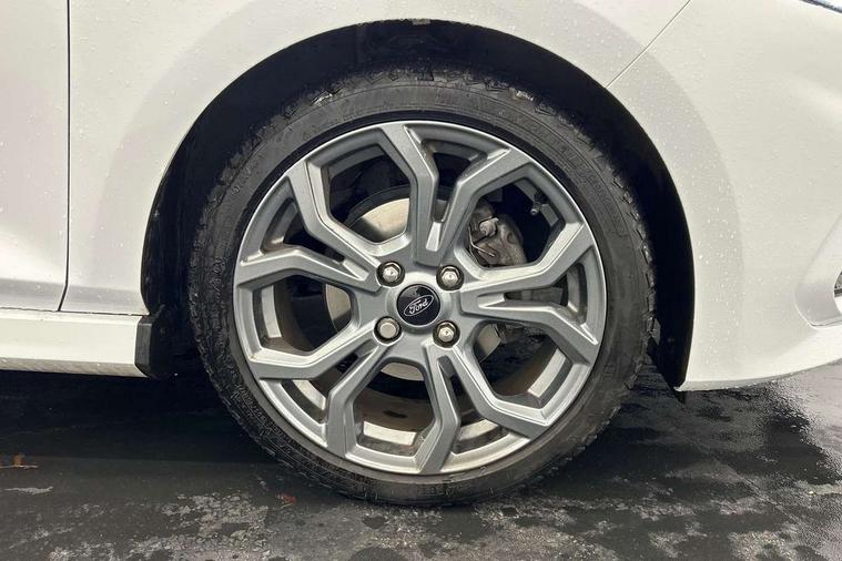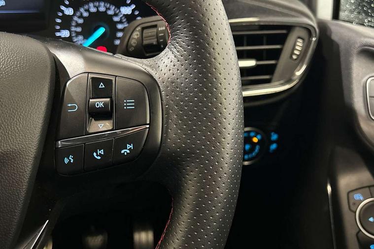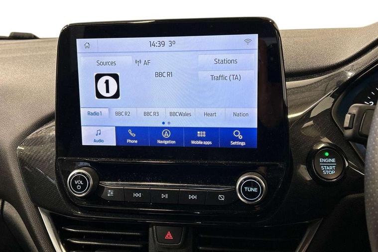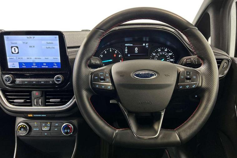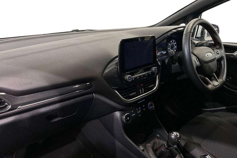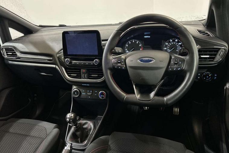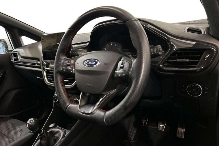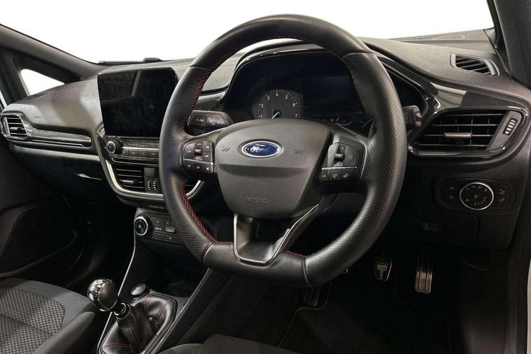 NCAP Pack - Fiesta, 17" 5 spoke alloy wheels with rock metallic finish, Keyless start with 'Ford Power' starter button, MyKey system, Remote central locking & engine immobiliser, Thatcham Cat.1 alarm, 2 USB ports, Auxiliary input socket, DAB Digital radio, Steering wheel mounted controls, 3 point seatbelts on all rear seats, ABS+EBA, Curtain airbags, Driver and passenger airbags, Drivers knee airbag, Electronic stability control with hill start assist, Front passenger airbag deactivation, Front side airbags, Seatbelt warning, Two tone horn, Tyre pressure monitoring system, Body colour bumpers, Body colour door handles, Body colour large rear spoiler, Body coloured electrically operated and heated door mirrors with side indicators, Cornering front fog lights, Electric front windows/one touch facility, Electric rear windows, LED Night signature to rear lights, Quickclear heated windscreen, Rain sensing wipers and auto dimming rear view mirror, Rear privacy glass, Rear wiper, Unique ST-Line upper grille & full bodystyling kit with ST-Line wing badges, 3 spoke flat bottomed leather steering wheel, 60/40 split folding rear seat, Adjustable head restraints, Black headlining, Boot carpet, Centre console with opening armrest, 2x cupholders, 12v and USB, Chrome inner door handles, Cloth upholstery, Footwell illumination, Front floor mats in velour, Front map reading lights, Front seatback pockets, Illuminated glovebox, Leather gaiter, Load area light, Manual 2 way passenger seat adjust, Manual 4-way driver seat adjust, Manual air conditioning, Overhead console with sunglasses holder, Pollen filter, Rake/reach adjustable steering wheel, Sensico wrapped steering wheel, Sports front seats, Bluetooth system, Electric power steering, Ford easy fuel, Ford SYNC 3 Navigation system incl 8" touchscreen, 7 speakers, FordPass connect, Apple carplay, android auto, voice control and emergency assistance, Rear parking distance sensors, Selectable drive modes (Normal, Sport, Track), Trip computer, Sports suspension,