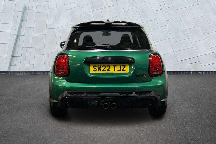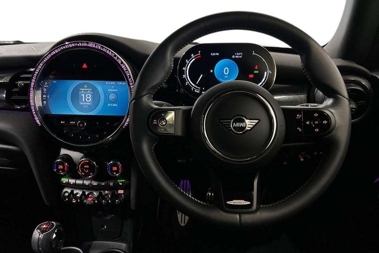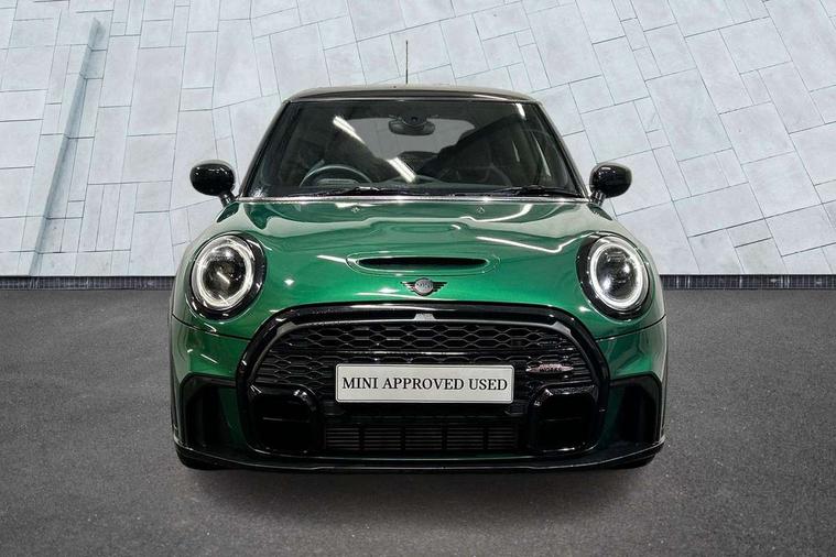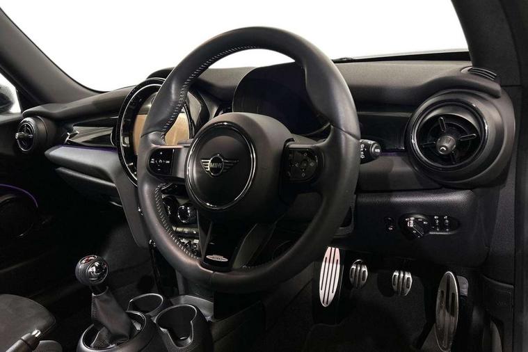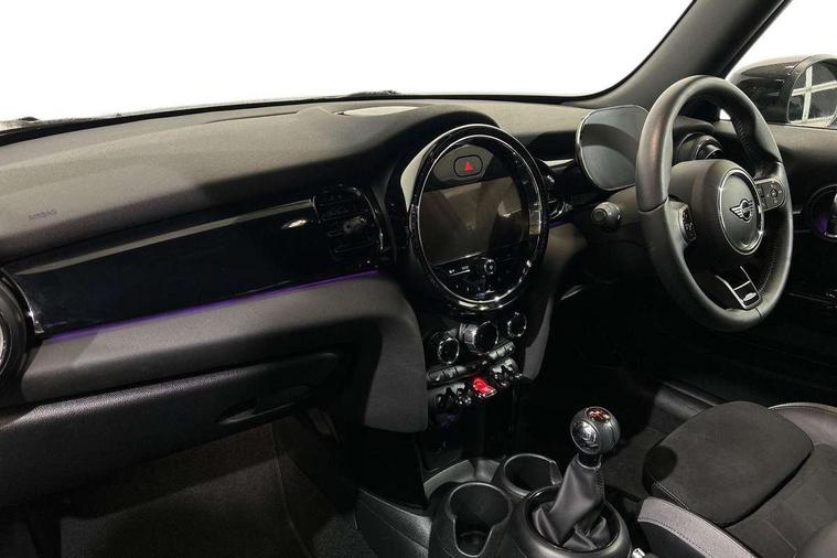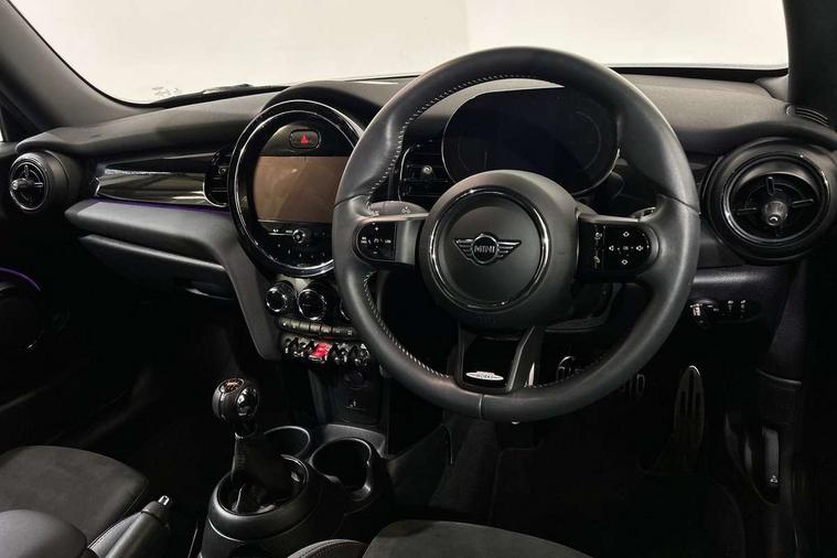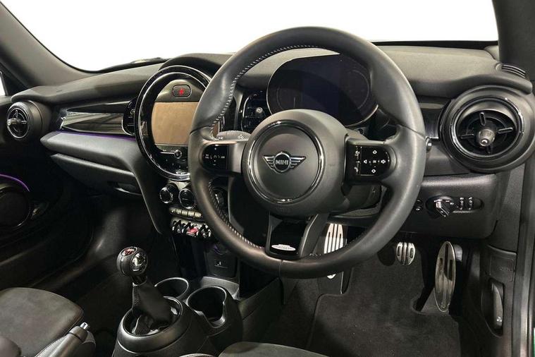 Apple CarPlay, Automatic start/stop function with brake energy recuperation, Compatible mobile phone bluetooth with audio streaming, Cruise control with brake assist, Electro-mechanical speed dependant steering assistance, Flexible car sharing preparation, Instrument cluster, MINI Driving Modes - centre toggle switch to control driving setting (sport, mid and green), Mini E-call, MINI TeleServices, On board computer, Rear park distance control, Service interval indicator, 6 Speed manual transmission including gear change indicator display, Double Vanos system, Fully variable valve control, High precision injection, Intelligent adaptive suspension, Performance Control, 8.8" touchscreen with LED ring, FM tuner and DAB digital radio, 3rd brake light, Automatic headlight activation switch, Bonnet scoop, Dynamic brake lights, Electric front windows, Heated rear window, Heated windscreen washer jets, JCW Aerodynamic kit - Front and rear bumpers with sporty JCW styling and part-painted side sills with MINI John Cooper Works door sill finishers, John Cooper Works rear spoiler, LED headlight with closed ring and daytime driving lights, Metal door sill strips with Cooper S, Model logo Cooper S on right of tailgate, Radiator grille chrome border with honeycomb structure including S Badge, Rain sensor window wipers, Rear fog lights, Rear LED lights with union jack design, Rear window wiper, Side scuttle panel with integrated indicator, Sun/heat protection glass, Two central exhaust tailpipes with chrome finisher, White indicator lenses, 12V Accessory socket in centre console, 2 seat bench in 2nd row, 4 lashing eyes in luggage compartment, 60/40 split folding rear seat, Anthracite headliner including grab handles and clothes hooks, Carbon black colour line - Knee roll and door armrest, Chrome interior highlights, Cupholders, Front and rear isofix with front passenger airbag deactivation, Front floor mats in velour, Glove compartment, Height and length steering column adjustment, Interior lighting with 12 different colours across the dashboard, underneath door bezel with illuminated laser-engraved design on central display, JCW Sport seats with integrated headrests, adjustable thigh support and John Cooper Works logo, Leatherette gearshift lever and handbrake gaiters, LED reading lights, vanity mirror lights, front foot well light and spotlight on front seats, Manual air conditioning, Mechanical seat adjustment - forward/back & backrest for front seats and driver seat height adjust, Multifunction steering wheel, Passenger seat height adjuster, Single front passenger seat, Storage compartments in doors, Storage pocket on back of front seats, Sunvisors with vanity mirrors, Walknappa leather steering wheel with grey seam and John Cooper Works badge on Piano Black lower steering wheel spoke, Piano black exterior pack - Mini Hatchback Cooper S, 3 point seatbelts on all four seats, 6 Airbags - front, side, head and seat belt tensioners, Anti-lock braking system (ABS), DSC - Dynamic Stability Control, Front and rear disc brakes, Two tone horn, Tyre pressure monitoring system, Alarm system with tilt sensor, monitoring doors, bonnet interior and tailgate, Electronic vehicle immobiliser, Start/stop toggle with keyless go, Piano black interior trim, Tool kit,