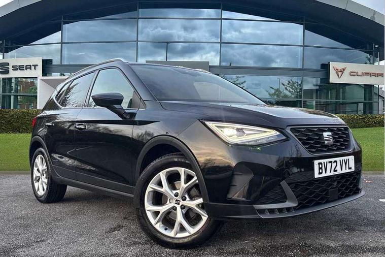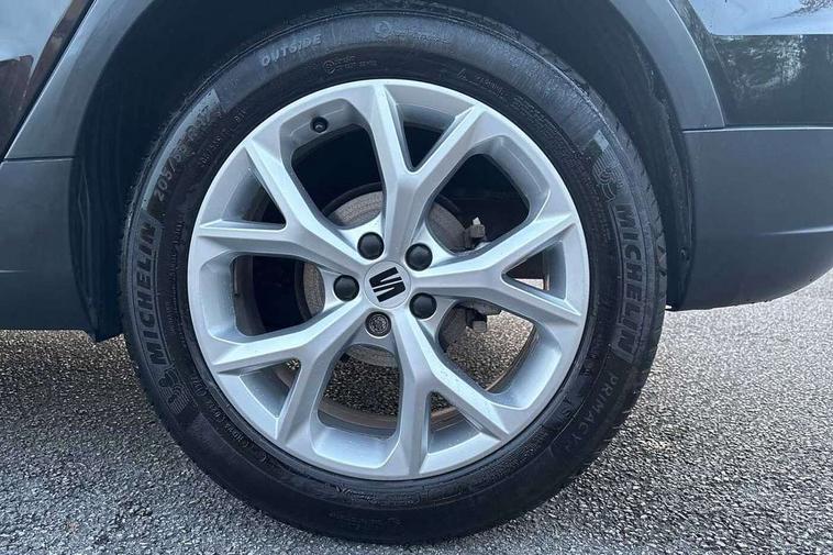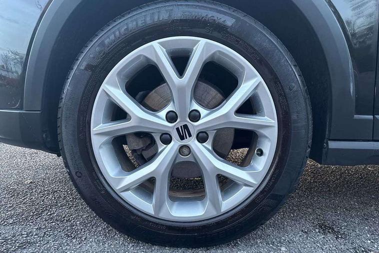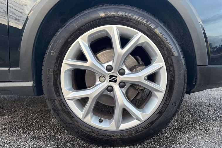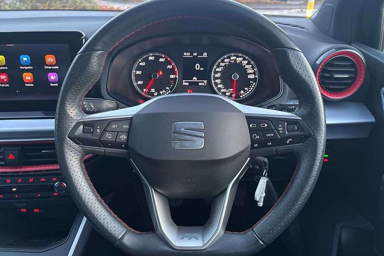 'Lights On' Reminder warning buzzer, 8" Digital cockpit, Digital clock, E-call, Electric speed sensitive power steering, Full Link Smartphone Integration with Mirror Link, Apple Car Play, Google Android Auto with USB Type C cable for Apple and Android compatibility, Lane keeping system, Low fuel warning light, Outside temperature display, Rear parking sensor, RPM counter, Seat connect with safety, service, remote and online, SEAT Drive profile - Four different models normal-sport-eco-individual, steering response, throttle response, Trip computer, Wireless phone charger, 9.2" colour touchscreen with navigation system, voice control and USB port (type c), Bluetooth interface for hands free and audio streaming, DAB digital radio and AM/FM radio, Steering wheel mounted audio controls, Anti theft roof antenna, Auto dimming interior rear view mirror, Automatic activation of hazard warning lights, Body coloured bumpers, Body coloured door handle inserts, Chrome roof rails and window surrounds, Dark tinted rear windows, Electric front/rear windows, Electrically adjustable, heated and folding door mirrors, Front fog lights with cornering function and rear fog light, FULL LED automatic headlights with dynamic headlight range control, coming and leaving home, LED daytime running lights, LED rear tail lights and licence plate lights, Protective side mouldings, Rain sensing wipers, Rear side wing doors, Rear spoiler, Rear window wash/wipe, Roof colour door mirrors, Third brake light, Twin exhaust pipe styling hidden exhaust pipe, Visible VIN plate, Windshield wiper with intermittent control and potentiometer, 2 cupholders, 3 seat bench in 2nd row, 60/40 split folding rear seat, Aircare filter, Black interior roof, Cloth upholstery, Double boot floor, Driver sunvisor with covered mirror + card holder, Dual zone climate control, Front courtesy light with 2x front and 2x rear reading lights, Front sport seats, Gear shift indicator, Height adjustable front seats, Height/reach adjustable steering column, Illuminated boot, Instrument lighting with brightness control, Interior ambient lighting, Interior light in footwell, central console and door panel, ISOFIX points in outer rear seats with top tether anchorage points, Passenger sunvisor with vanity mirror, Perforated flat bottomed leather steering wheel/gear knob/handbrake with red stitching and FR logo, Single front passenger seat, Two front and three rear height adjustable headrests, Interior chrome pack - Arona, 3 point seatbelts on all rear seats, ABS, Active front headrests, Child locks on rear doors, Driver and front passenger airbags with front passenger airbag de activation, front side and curtain airbags, Electronic stability control, Emergency Brake Assist (EBA) and front assist, Front and rear seatbelt reminder, Hill hold control, Multi-Collision braking, Tiredness recognition system, Traction control, Tyre pressure monitoring system, Alarm with back-up horn, Electronic engine immobiliser, Locking wheel bolts, Remote central locking + deadlocks, Tow away protection, Titan black dashboard, 17" Dynamic alloy wheels,