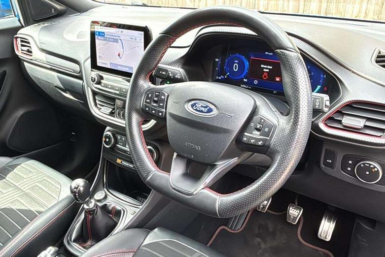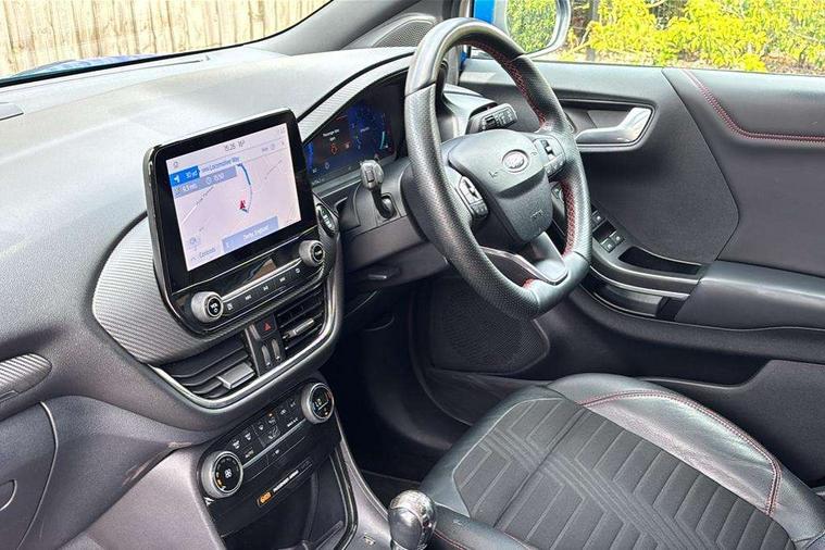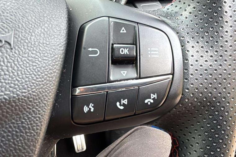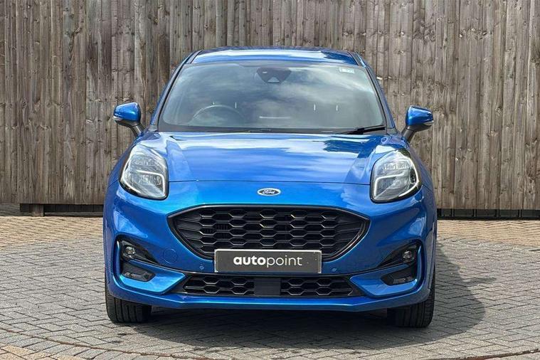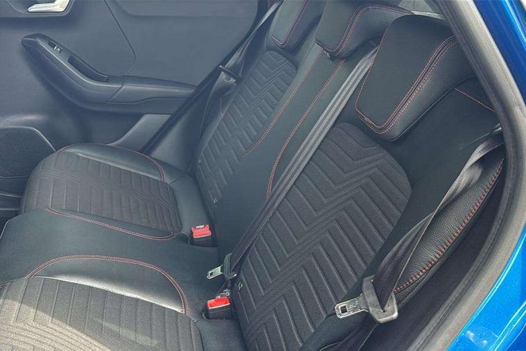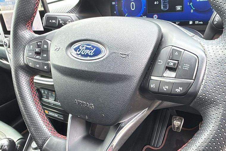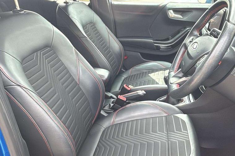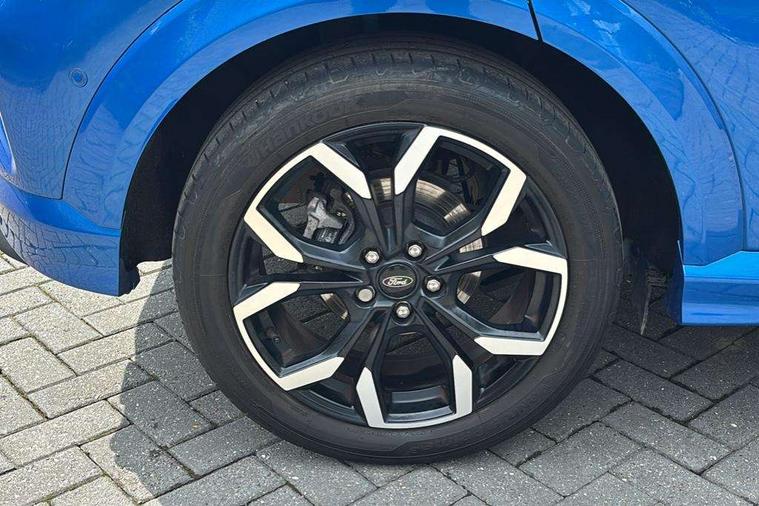 Ford easy fuel, Full digital 12.3" instrument cluster, Lane keeping aid with lane departure warning, Power assist steering, Power liftgate hands free including keyless start + entry, motion sensing key fob, Rear parking sensor, Selectable drive modes(Normal, sport, Eco, trail, slippery), Wireless charging pad, Automatic headlights with rain sensing wipers and auto high beam, Body coloured door mirrors, Fixed LED headlamps, Front fog lights with cornering lights and LED rear lamps, Power foldable heated door mirrors with puddle lamps, Privacy glass to side rear windows and tailgate glass, Quickclear heated windscreen, ST-Line body kit with large rear spoiler wth sports suspension, Alloy sports pedals, Casual partial leather upholstery with salerno bolster, Centre console with armrest and stowage, Driver and passenger seat lumbar and height adjust, EATC - Electronic Auto Temperature control, Ford megabox extended bootspace, Front and rear floor mats, Front and rear head restraints, ST-Line flat bottomed sensico leather steering wheel with leather handbrake and aluminium gear knob, B&O Premium Audio system + Ford SYNC 3 navigation pack - Puma, Driver assistance pack - Puma, 3 rear seatbelts, Electronic stability control (ESC) and hill start assist, Pre-collision assist with autonomous emergency braking, pedestrian/cyclist detection & post-collision braking, Tyre pressure monitoring system (TPMS), Thatcham alarm, Carbon look interior deco spears, 18" 5 spoke matt black machined finish alloy wheels, Tyre inflation kit,