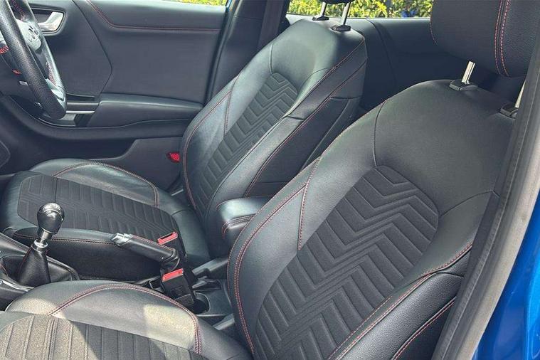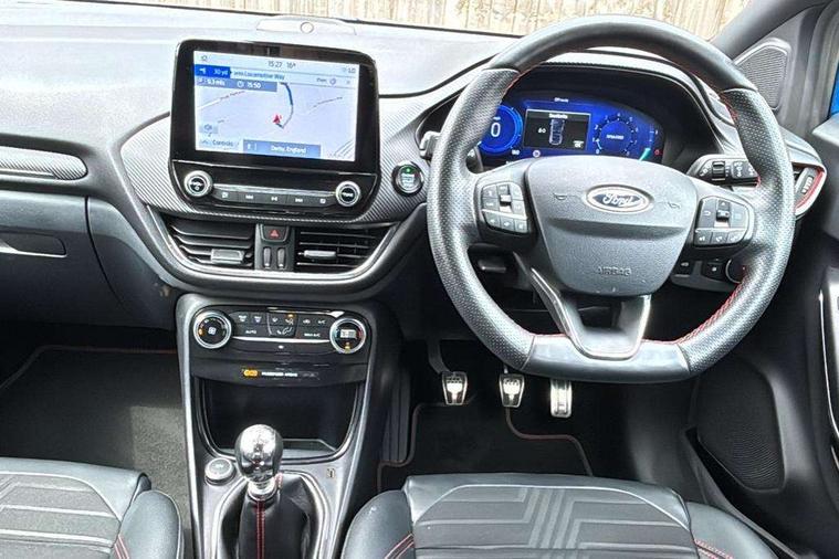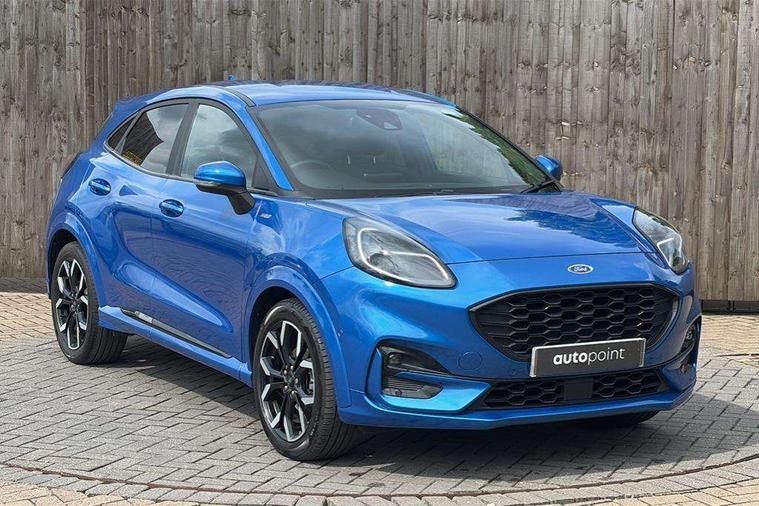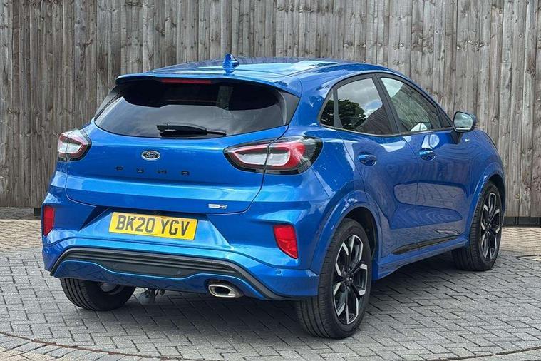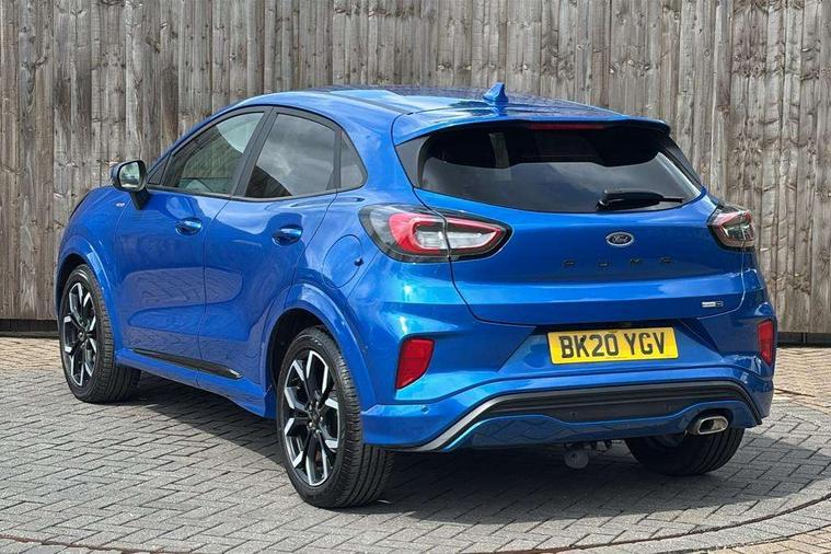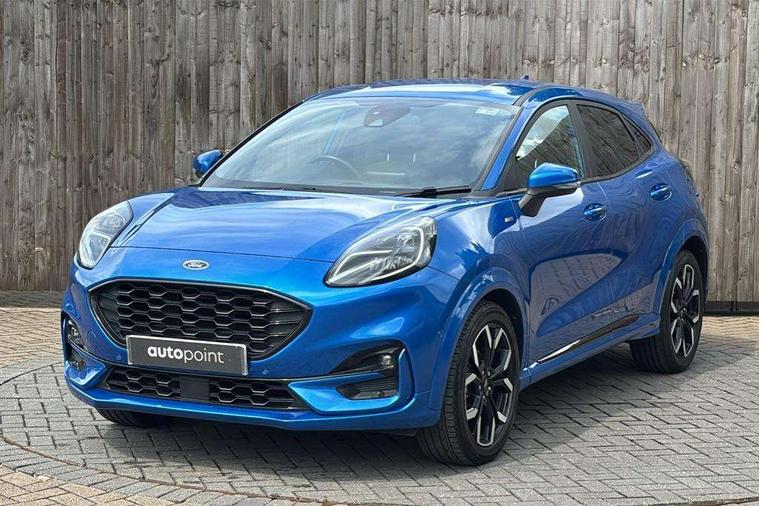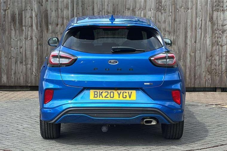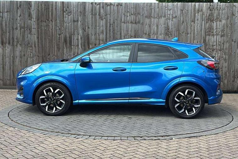 Ford easy fuel, Full digital 12.3" instrument cluster, Lane keeping aid with lane departure warning, Power assist steering, Power liftgate hands free including keyless start + entry, motion sensing key fob, Rear parking sensor, Selectable drive modes(Normal, sport, Eco, trail, slippery), Wireless charging pad, Automatic headlights with rain sensing wipers and auto high beam, Body coloured door mirrors, Fixed LED headlamps, Front fog lights with cornering lights and LED rear lamps, Power foldable heated door mirrors with puddle lamps, Privacy glass to side rear windows and tailgate glass, Quickclear heated windscreen, ST-Line body kit with large rear spoiler wth sports suspension, Alloy sports pedals, Casual partial leather upholstery with salerno bolster, Centre console with armrest and stowage, Driver and passenger seat lumbar and height adjust, EATC - Electronic Auto Temperature control, Ford megabox extended bootspace, Front and rear floor mats, Front and rear head restraints, ST-Line flat bottomed sensico leather steering wheel with leather handbrake and aluminium gear knob, B&O Premium Audio system + Ford SYNC 3 navigation pack - Puma, Driver assistance pack - Puma, 3 rear seatbelts, Electronic stability control (ESC) and hill start assist, Pre-collision assist with autonomous emergency braking, pedestrian/cyclist detection & post-collision braking, Tyre pressure monitoring system (TPMS), Thatcham alarm, Carbon look interior deco spears, 18" 5 spoke matt black machined finish alloy wheels, Tyre inflation kit,