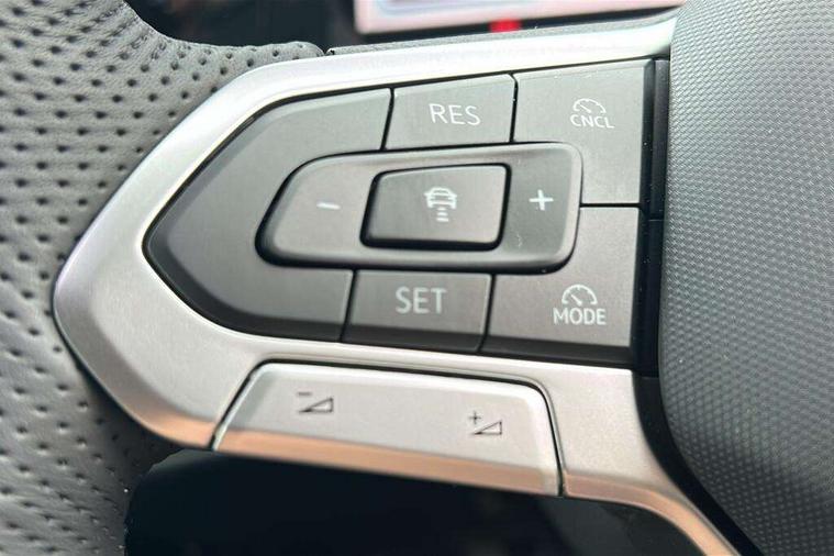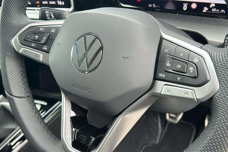 Activated carbon canister, Adaptive cruise control (ACC), Advanced driver attention and drowsiness monitor, Dynamic road sign display, Dynamic steering, E-Sim card for online connectivity, eCall emergency call system, Multi-color Digital cockpit pro, selection of different info profile possible, Multifunction front facing camera for distance control, Navigation system, Oncoming vehicle braking when turning including swerve support, Preparation for light assist system, Speed limiter, Speedo, rev counter, electronic odometer, trip, service interval display, exterior temperature and fuel gauge, Traffic jam assist, Voice enhancer and voice control, Warning signal and warning light for front and rear seatbelts not fastened, We connect plus preparation, We connect preparation, Wireless app connect, Petrol Particulate Filter, Start-stop system with battery regeneration (recuperation - energy recovery during braking), XDS electronic differential lock for improved traction and handling, 2 USB C ports in front, 2 USB charging sockets on the centre console in the rear charging capacity upto 45W, Comfort telephony + wireless charging, without wireless aerial connection, Digital radio reception (DAB), Diversity antenna for FM reception, Gaming platform via car app, Infotainment system with 12.9" display, Mobile phone interface with inductive charging feature, 3rd brake light, Auto headlights, Automatic headlamp activation with Coming home and Leaving home feature, Body colored bumpers in R-Line style, Body colour door handles, Exterior ambient lighting with illuminated door handles, Exterior mirrors convex on the left and aspherical on the right, Front and rear electric windows, Heat insulating windshield made of laminated glass, LED daytime running lights, Rear exhaust tailpipe, Rear fog light on one side and reversing lights on both sides, Rear side wing doors, Rear windscreen washer and wiper with interval delay, Remote electrically foldable door mirrors, puddle lights and reverse activated passenger's door mirror, Welcome light with surround lighting, 12V socket in front centre console, 12V socket in luggage compartment, 3 rear head restraints, 3 seat bench in 2nd row, Ambient lighting with 30 colour including LED light unit in front footwell with selectable light colour, Brushed stainless steel pedals, Carpet mats, front and rear, Chrome plated radiator grille inserts, air vent surrounds and light switch surrounds, Front centre armrest, Integrated front head restraints, ISOFIX anchors for child seats on outer rear bench seats and on front passanger seat compatible for i-Size, Leather gearshift handle, Luggage compartment lighting, Premium sports seats in front, Rear cupholder and loadthough, Single front passenger seat, Soul black instrument panel, Split folding backrest with centre armrest and unsplit rear seat bench, Storm grey roof lining, Sun visors with illuminated vanity mirrors, 3 point height adj front seatbelts + pretensioners, 3 rear three point seatbelts, ABS, Autonomous emergency braking front assist with pedestrian and cyclist monitoring, Child locks on rear doors, Driver and front passenger airbag with front passenger airbag deactivation, Electronic parking brake with auto hold, ESC (Electronic Stability Control), Extended pedestrian protection measures, Rear disc brakes, Two tone horn, Tyre pressure loss indicator, Volkswagen roadside assistance, Anti theft wheel bolts, Preparation for alcohol interlock, Decorative inserts carbon grey for dashboard and front door trim panels,