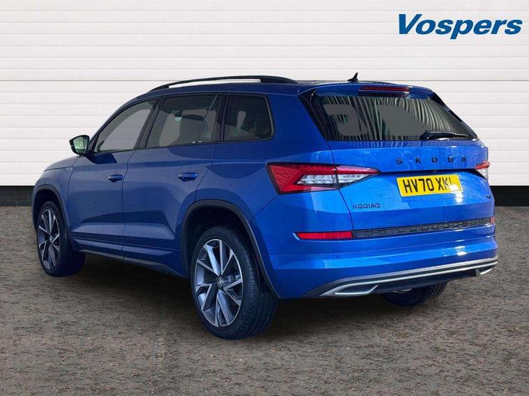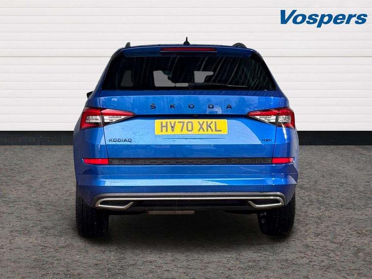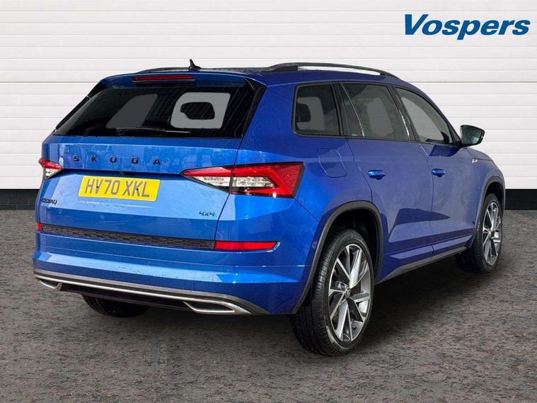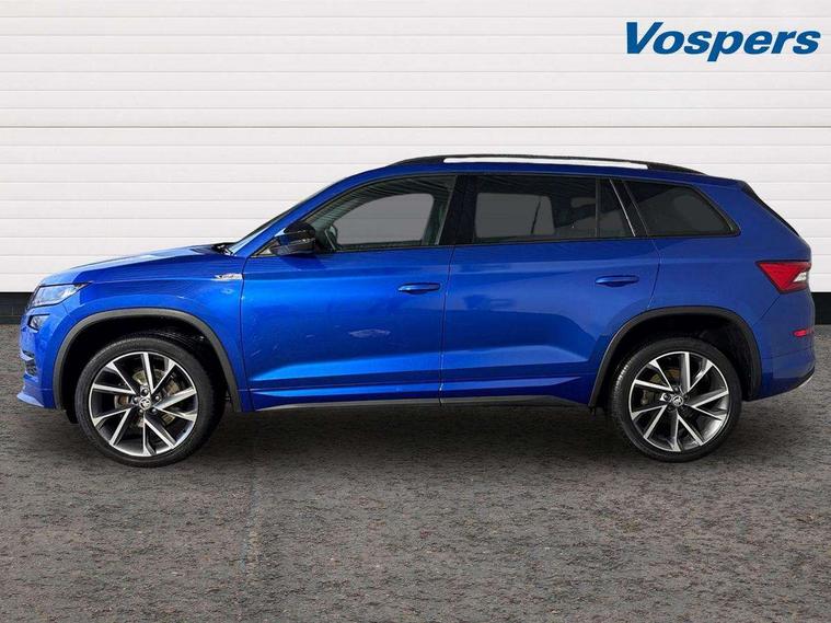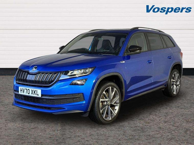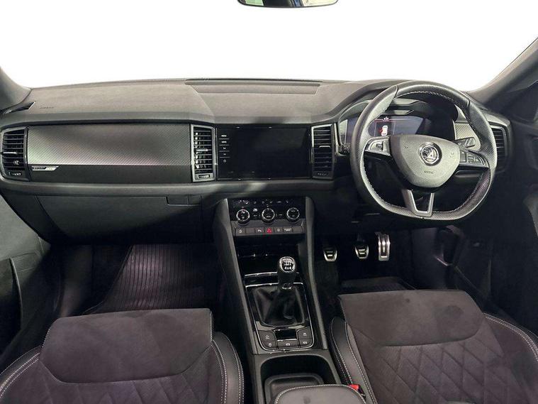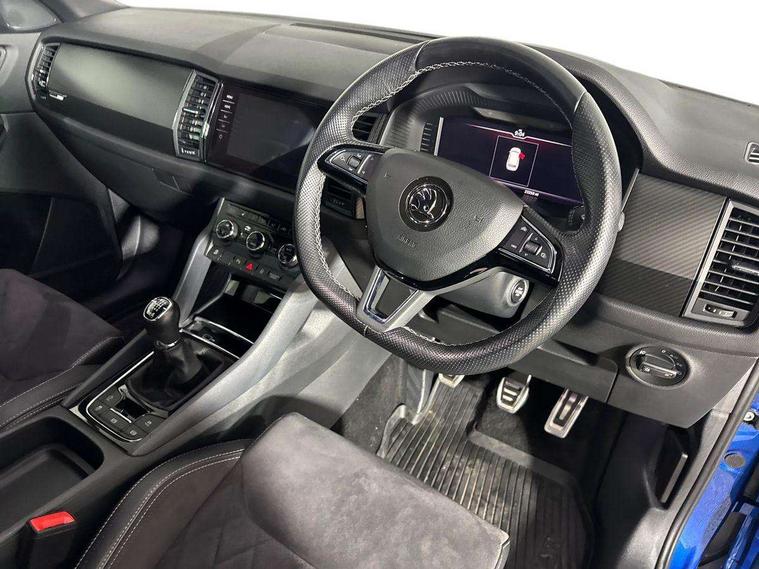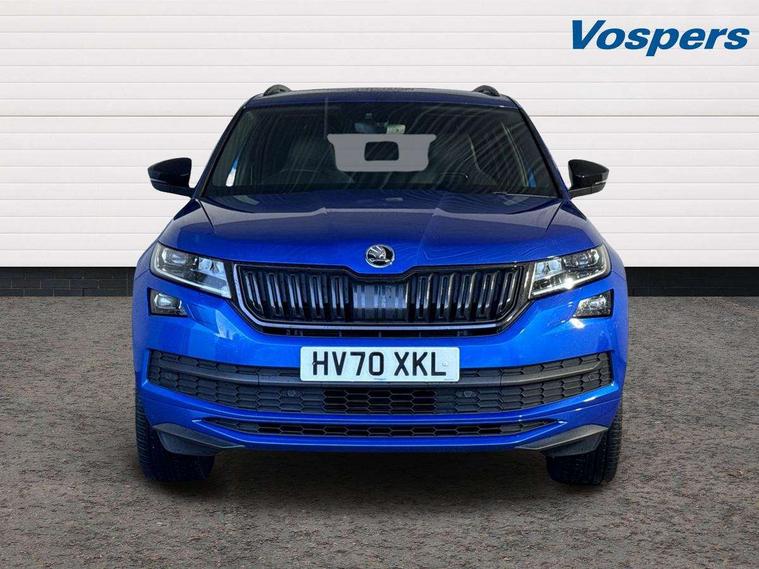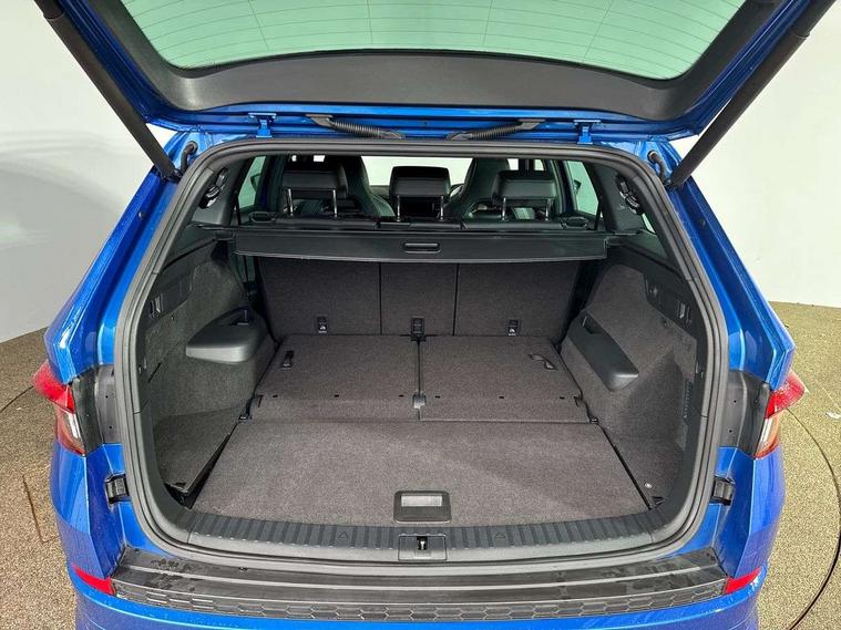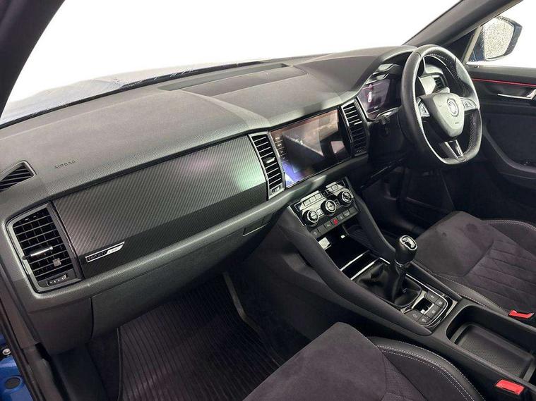 Bluetooth system, Colour multifunction trip computer, Columbus satellite navigation with 9.2" touch screen and integrated Wi-Fi + WLAN, Digital voice enhancement, ECO Stop/start function, Exterior temperature indicator, Map care, Progressive power assisted steering, SmartLink plus, Speed limiter, Sports dials, Tailgate unlocking from outside, Bolero Radio, DAB Digital radio, DVD System, USB and SD card connectivity, Aero front windscreen wipers with intermittent function, Aero rear window wiper, Auto dimming rear view mirror, Automatic activation of hazard warning lights, Black electric window control buttons, Black roof rails and door mirrors with radiator grille and window surrounds, Black wheel arch surrounds, Body colour bumpers, Body colour door handles, Chrome exhaust tailpipe, Electric front and rear windows, Electrically adjustable/heated/foldable and auto dimming door mirrors with memory function, Front door steps with SportLine logo, Full LED Headlights with adaptive front light system and LED daytime running lights, Headlight washers, Heated rear window, LED front fog lights with static cornering light function, LED rear fog light, LED third brake light in rear spoiler, Light assistant (coming home/tunnel light), Rain and light sensors, Rear diffuser, Rear spoiler, Safety reflectors on front and rear doors, Sportline badge on front fender, Sports front and rear bumpers, Sunset privacy glass, Tailgate lettering in Black, Without engine designation, 12V socket in boot, 2 rails with 2 hooks including 4 hooks for net programme, 3 spoke leather sport multi-function steering wheel in paddles with silver stitching, 4 foldable roof handles with rear coat hooks, 4 lashing points on luggage floor, 60:40 foldable rear seat with sliding adjustment and backrest angle adjustment, Alcantara door panels, Alcantara upholstery with Sports seats with silver stitching, Aluminium pedals, Black roof headlining, Bottle holders in door panel in the 1.5 litre front and 1 litre rear, Cargo storage compartments, Centre console with open storage box, cup holder and 12V socket, Chrome headlight control button, Chrome interior door handles, Coat hooks on B pillar, Covered storage compartment on driver side, Front and rear door armrest with black adductor trim, Front centre armrest with storage compartment, Front courtesy lights, Gear shift lever with chrome frame and black gloss insert, Height adjustable front headrests, Height adjustable rear headrests, Illuminated and cooled glovebox, Illuminated luggage compartment, Isofix system on outer rear seats, Manually adjustable steering column, Net programme in boot (1x horizontal Net, 2x vertical Nets), Overhead glasses storage compartment, Pollen filter, Rear centre armrest with cupholders, Roll up luggage compartment cover with intermediate position, Small Bags on the inner sides of the front backrests, Small pockets on the inner side of the front backrests, Storage compartment in lower middle Instrument panel, illuminated with closing, Three rear height adjustable headrests, Ticket holder on A Pillar, Umbrella in door panel, LED Interior Light pack - Kodiaq Scout/Sport Line/VRS/Laurin + Klement, Auto door release and activation of warning lights in the event of an accident, Driver and passenger airbags, Electronic parking brake with hill hold control, Emergency rear braking signal, ESC (incl. ABS+MSR+ASR+EDS+HBA+DSR+RBS+MKB), Front and rear three point safety belt on all seats, Front assist includes AEB city/urban, Front side airbags, Fuel cut off safety device, Head and knee airbags, Passenger airbag deactivate switch, Rear disc brakes, Safety vest holder in door, Seat belt reminder for all seats, Two tone horn, Tyre pressure monitor, Warning lights in front doors, Alarm with interior monitoring and tilt sensor with safe function, Immobiliser, Keyless entry and start system (KESSY), Remote central locking, Carbon finish dashboard and door inserts, Chrome air vent surrounds, Sportline plaque on the dashboard, 20" Vega Anthracite alloy wheels with anti-theft wheel bolts,