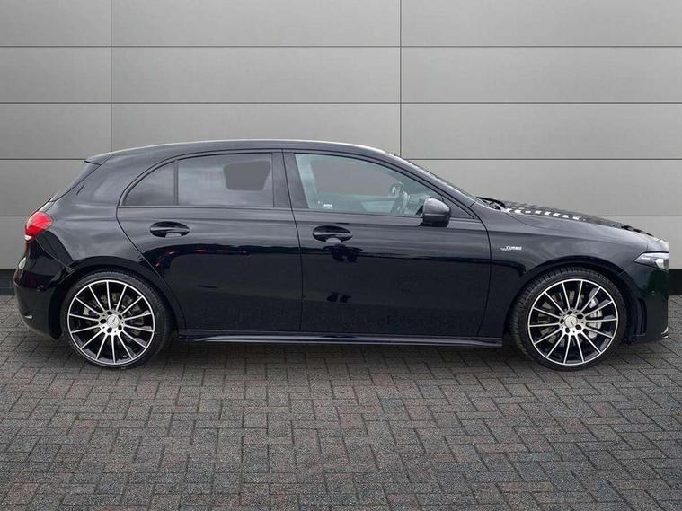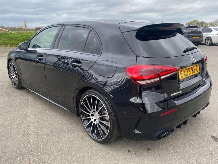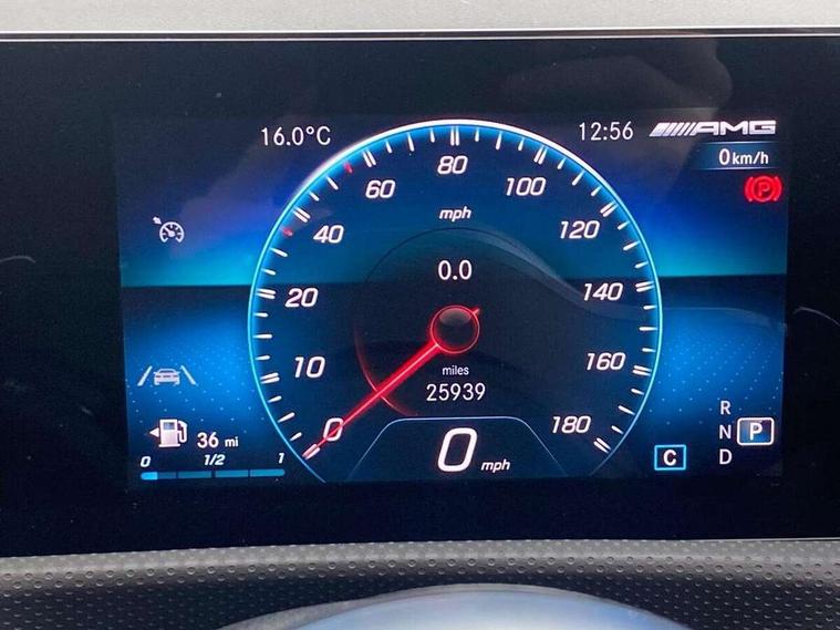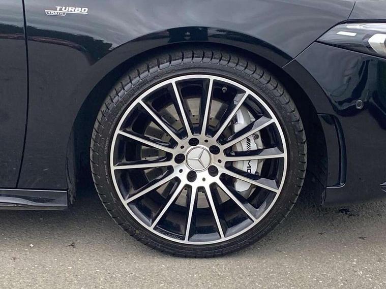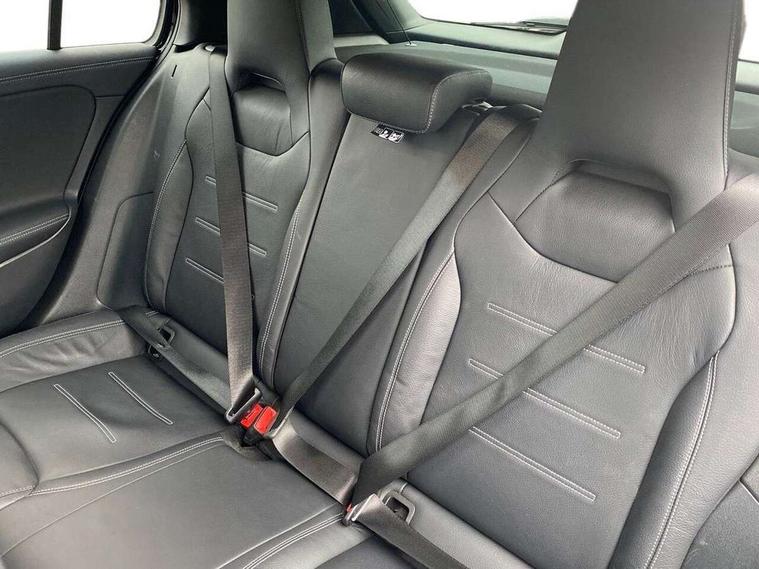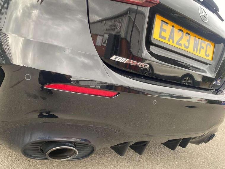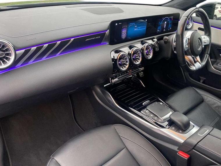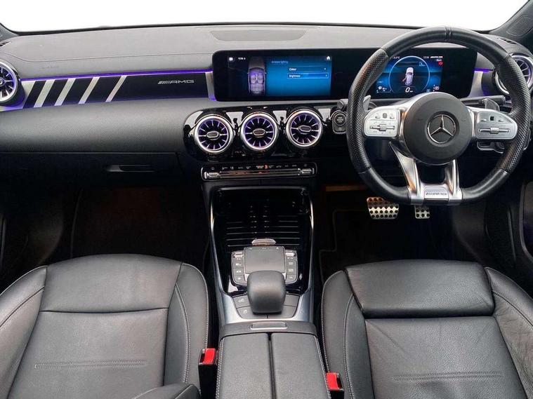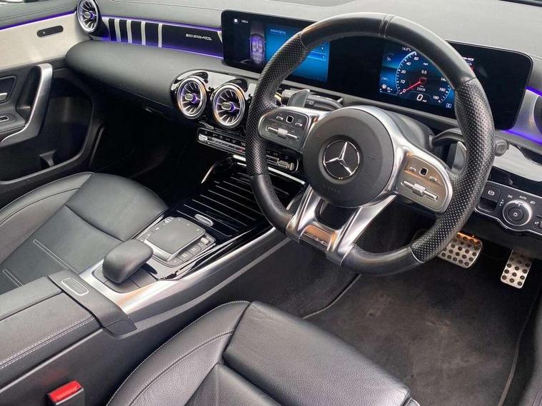Ultrasonic sensors positioned in the front and rear bumpers, 10.25" media display, 180 degree rear view camera with parking guidelines, 7" colour screen in instrument panel, Active parking assist with visual and audible warning of detected obstacles, Attention assist, Brake pad wear indicator warning light, Car wash mode, Cruise control + speed limiter, Direct steering, Dual bluetooth interfaces, DYNAMIC SELECT with driving programs (Slippery, Comfort, Sport, Sport+ and Individual), ECO start/stop function, Fluid level warning indicator for fuel, oil, coolant and washer fluid, Hard-disk navigation, Hey Mercedes Voice activation, Lamp failure indicator, Lane keeping system, Mercedes me connect including emergency call system, accident recovery, breakdown management and maintenance, Mercedes me remote services, Outside temperature gauge, Owners manual in English, Pre-installation for car sharing, Preinstallation for Mercedes Benz link, Service indicator (ASSYST), Smartphone integration with Apple CarPlay and Android auto, Speed sensitive power steering, Trip computer, AMG performance suspension, Rear axle multi-link, 2 USB ports (type C) in rear stowage compartment and one in front of center console, 6 speakers, DAB Digital radio, MBUX multimedia system with DAB digital radio and touchpad including satellite navigation, Mercedes-Benz sound system - 100W, 4 Electric Front and Rear windows, Adaptive brake lights, AMG bodystyling - Front apron with splitter in chrome, rear apron with chrome trim and chrome visible trim elements in tailpipe, AMG Front apron with flics as air deflector elements on the outer air intakes, AMG radiator grille with twin blade lamella and AMG Lettering, AMG Rear apron with specific diffuser look with four vertical fins and two round chrome plated tailpipe trim elements with a diameter of 90 mm, AMG spoiler lip on roof, AMG Sports exhaust system with two round tailpipes attached in rear apron, Automatic headlights, Black weather strip, Body colour bumpers, Body colour door handles, Body colour side skirt, Body coloured door mirrors, Electric adjustable and heated door mirrors with integrated LED side indicators, Front wings wheel arches with TURBO 4MATIC lettering, Headlamp assist automatic headlamp activation, Heated glass rear windscreen + timer control, High gloss black beltline, LED High level third brake light, LED high performance headlamps with integrated LED daytime running lights, LED tail lamp, Privacy glass, Radio aerial, Rain sensing windscreen wipers with two sensitivity settings, Rear fog lights, Rear side wing doors, Rear wiper, Trim elements on louvres in outer air inlets in high gloss black, Wider wheel arches for AMG wheels, Window line trim strip in high gloss black, 3 seat bench in 2nd row, 40:20:40 split folding rear seats, AMG Performance steering wheel in nappa leather, Auto Mercedes-Benz child seat recognition sensor, Black air vents with surround in silver chrome, Black roof lining, Brushed stainless steel sports pedals with rubber studs, Controller on centre console with chrome surround, Floor mats with stitched edging and AMG lettering, Front centre armrest with storage compartment, Front door sills with AMG lettering, Front seat backs luggage nets, Front seat cushion length adjustment, Heated front seats, Height/reach adjustable steering column, Interior lighting - 64 colour Ambient lighting, Interior mirror with reading lamps in black and frameless, ISOFIX and top tether child seat fixing points in two outer rear seats, Manual height adjustable front seats, Rear head restraints, Seat occupancy sensor for front passenger seat, Silver coloured aluminium gear shift paddles on steering wheel, Single front passenger seat, Sports seats with integrated headrests, Stowage compartment in centre console with retractable cover, Sunvisors with illuminated vanity mirrors, Touchpad on center console, Twin front cupholders, Two zone thermotronic luxury automatic climate control, AMG night pack - A Class, Light and sight pack - A Class, Mirror package - A Class, Seat comfort pack - A Class, 3 rear 3 point seatbelts, ABS with Brake Assist, Active bonnet, Active brake assist includes forward collision warning system with autonomous braking, Adaptive brake assist with hold function and hill start assist, Black seatbelts, Childproof locks manually operated for rear doors and electrically operated for rear power windows, Crash responsive emergency lighting, Driver and passenger head and side airbags, Drivers knee airbag, Dual stage driver/passenger airbags, Electronic parking brake, ESP curve dynamic assist, ESP with ASR, Front and rear seatbelt reminder, Front brake calipers with AMG lettering, Perforated front brake discs, Tyre pressure monitoring system, Warning triangle and first aid kit, Window airbags, Alarm system/interior protection/immobiliser, Keyless Go, Remote central locking and crash sensor with emergency opening function, Urban guard vehicle protection system with immobiliser and interior protection, Light aluminium with longitudinal grain interior trim, 19" AMG multi-spoke high gloss black painted light alloy wheels with high sheen finish, Summer tyres, Tirefit sealant kit,