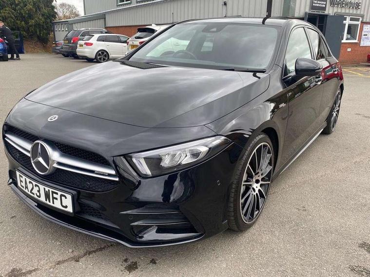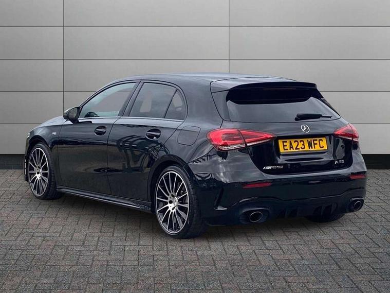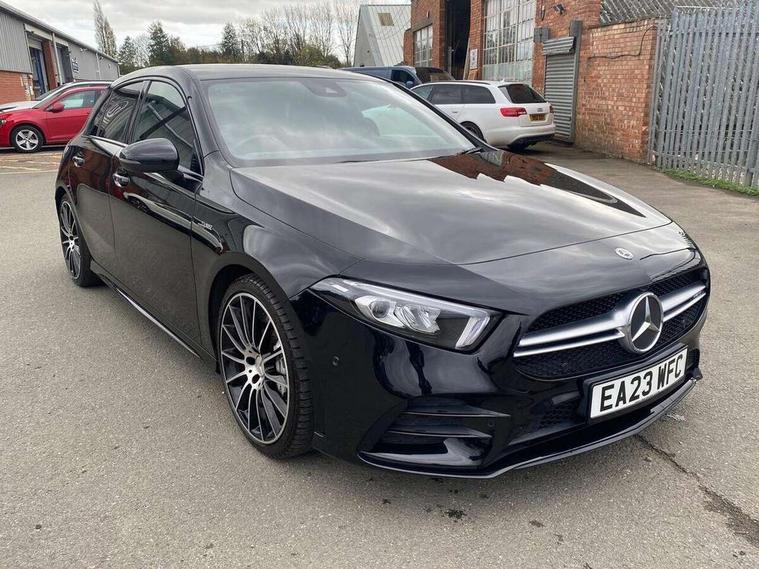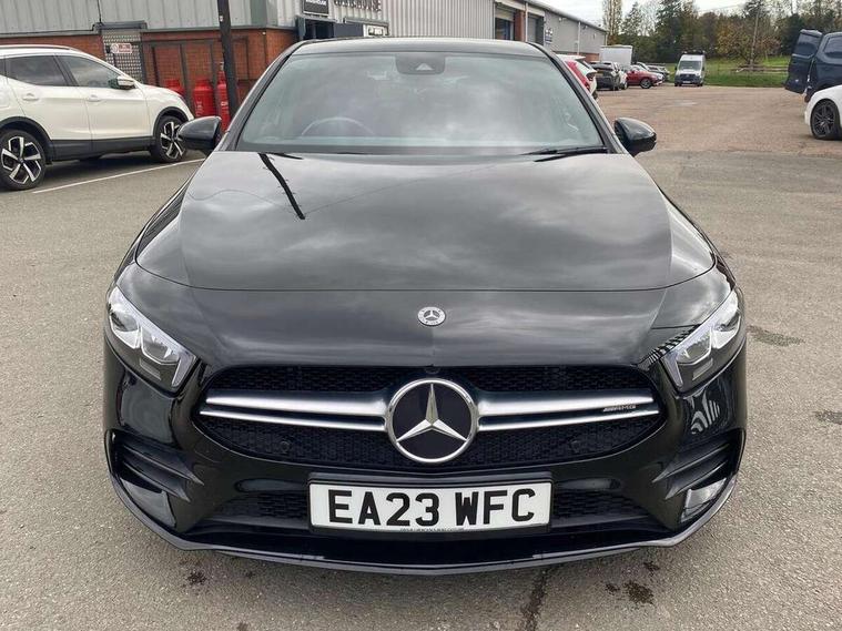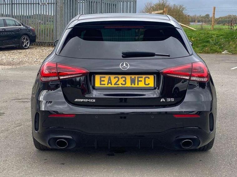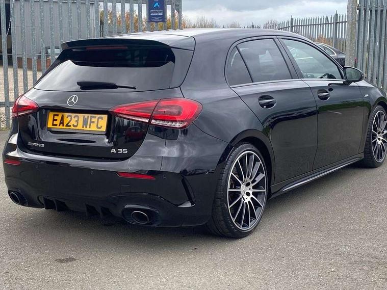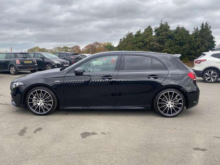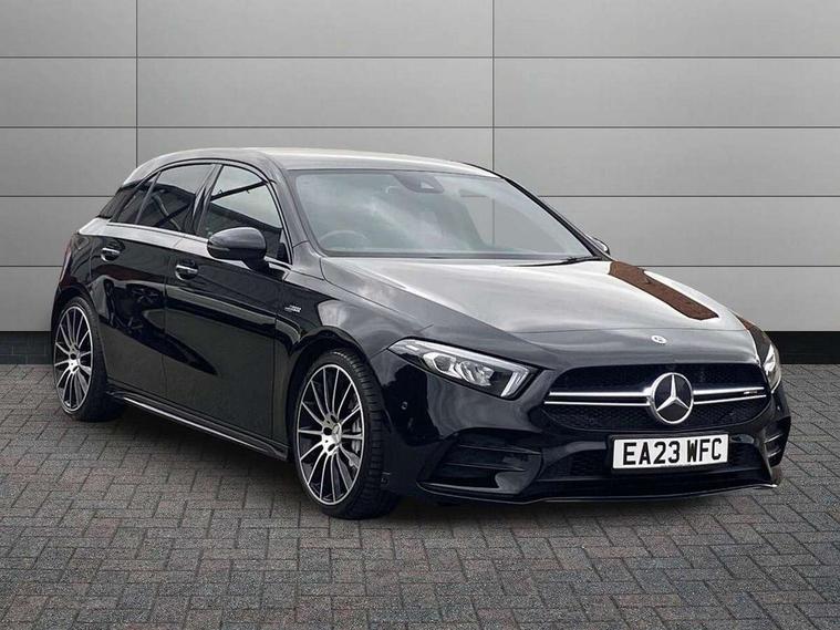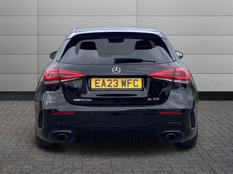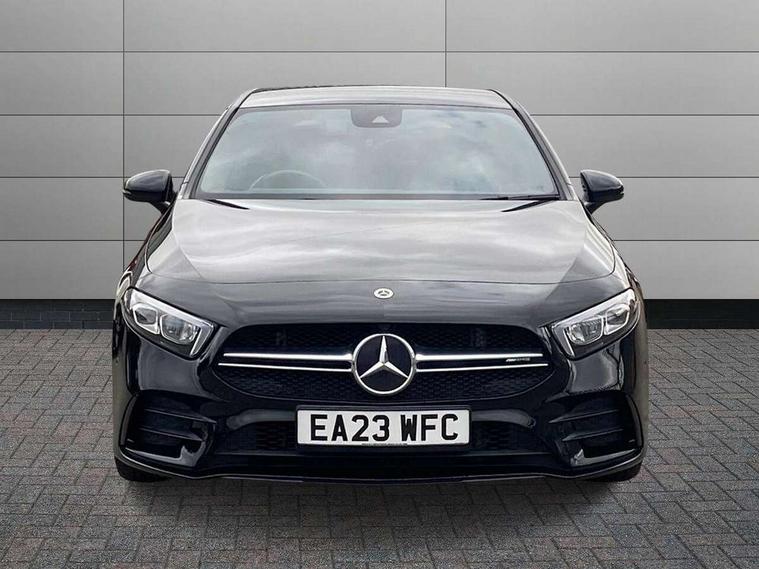 Ultrasonic sensors positioned in the front and rear bumpers, 10.25" media display, 180 degree rear view camera with parking guidelines, 7" colour screen in instrument panel, Active parking assist with visual and audible warning of detected obstacles, Attention assist, Brake pad wear indicator warning light, Car wash mode, Cruise control + speed limiter, Direct steering, Dual bluetooth interfaces, DYNAMIC SELECT with driving programs (Slippery, Comfort, Sport, Sport+ and Individual), ECO start/stop function, Fluid level warning indicator for fuel, oil, coolant and washer fluid, Hard-disk navigation, Hey Mercedes Voice activation, Lamp failure indicator, Lane keeping system, Mercedes me connect including emergency call system, accident recovery, breakdown management and maintenance, Mercedes me remote services, Outside temperature gauge, Owners manual in English, Pre-installation for car sharing, Preinstallation for Mercedes Benz link, Service indicator (ASSYST), Smartphone integration with Apple CarPlay and Android auto, Speed sensitive power steering, Trip computer, AMG performance suspension, Rear axle multi-link, 2 USB ports (type C) in rear stowage compartment and one in front of center console, 6 speakers, DAB Digital radio, MBUX multimedia system with DAB digital radio and touchpad including satellite navigation, Mercedes-Benz sound system - 100W, 4 Electric Front and Rear windows, Adaptive brake lights, AMG bodystyling - Front apron with splitter in chrome, rear apron with chrome trim and chrome visible trim elements in tailpipe, AMG Front apron with flics as air deflector elements on the outer air intakes, AMG radiator grille with twin blade lamella and AMG Lettering, AMG Rear apron with specific diffuser look with four vertical fins and two round chrome plated tailpipe trim elements with a diameter of 90 mm, AMG spoiler lip on roof, AMG Sports exhaust system with two round tailpipes attached in rear apron, Automatic headlights, Black weather strip, Body colour bumpers, Body colour door handles, Body colour side skirt, Body coloured door mirrors, Electric adjustable and heated door mirrors with integrated LED side indicators, Front wings wheel arches with TURBO 4MATIC lettering, Headlamp assist automatic headlamp activation, Heated glass rear windscreen + timer control, High gloss black beltline, LED High level third brake light, LED high performance headlamps with integrated LED daytime running lights, LED tail lamp, Privacy glass, Radio aerial, Rain sensing windscreen wipers with two sensitivity settings, Rear fog lights, Rear side wing doors, Rear wiper, Trim elements on louvres in outer air inlets in high gloss black, Wider wheel arches for AMG wheels, Window line trim strip in high gloss black, 3 seat bench in 2nd row, 40:20:40 split folding rear seats, AMG Performance steering wheel in nappa leather, Auto Mercedes-Benz child seat recognition sensor, Black air vents with surround in silver chrome, Black roof lining, Brushed stainless steel sports pedals with rubber studs, Controller on centre console with chrome surround, Floor mats with stitched edging and AMG lettering, Front centre armrest with storage compartment, Front door sills with AMG lettering, Front seat backs luggage nets, Front seat cushion length adjustment, Heated front seats, Height/reach adjustable steering column, Interior lighting - 64 colour Ambient lighting, Interior mirror with reading lamps in black and frameless, ISOFIX and top tether child seat fixing points in two outer rear seats, Manual height adjustable front seats, Rear head restraints, Seat occupancy sensor for front passenger seat, Silver coloured aluminium gear shift paddles on steering wheel, Single front passenger seat, Sports seats with integrated headrests, Stowage compartment in centre console with retractable cover, Sunvisors with illuminated vanity mirrors, Touchpad on center console, Twin front cupholders, Two zone thermotronic luxury automatic climate control, AMG night pack - A Class, Light and sight pack - A Class, Mirror package - A Class, Seat comfort pack - A Class, 3 rear 3 point seatbelts, ABS with Brake Assist, Active bonnet, Active brake assist includes forward collision warning system with autonomous braking, Adaptive brake assist with hold function and hill start assist, Black seatbelts, Childproof locks manually operated for rear doors and electrically operated for rear power windows, Crash responsive emergency lighting, Driver and passenger head and side airbags, Drivers knee airbag, Dual stage driver/passenger airbags, Electronic parking brake, ESP curve dynamic assist, ESP with ASR, Front and rear seatbelt reminder, Front brake calipers with AMG lettering, Perforated front brake discs, Tyre pressure monitoring system, Warning triangle and first aid kit, Window airbags, Alarm system/interior protection/immobiliser, Keyless Go, Remote central locking and crash sensor with emergency opening function, Urban guard vehicle protection system with immobiliser and interior protection, Light aluminium with longitudinal grain interior trim, 19" AMG multi-spoke high gloss black painted light alloy wheels with high sheen finish, Summer tyres, Tirefit sealant kit,