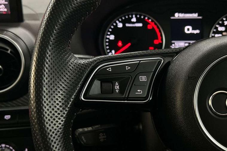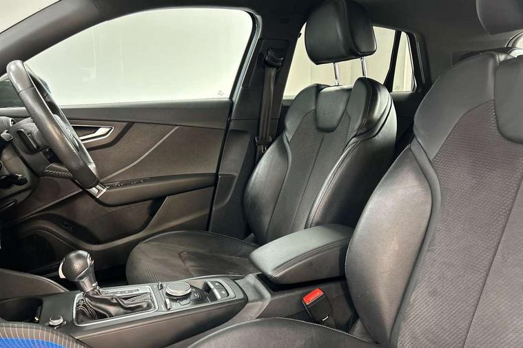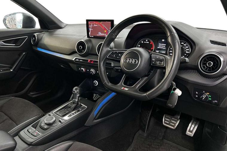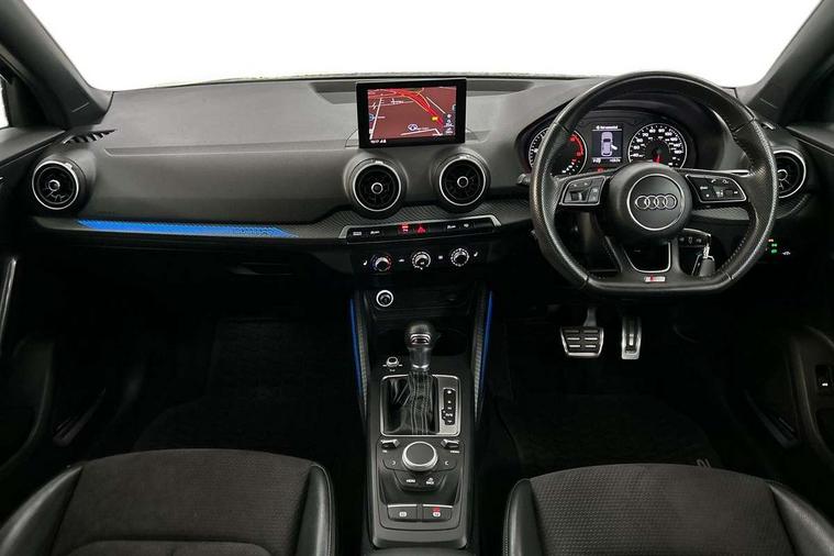 Audi drive select, Audi smartphone interface, Bluetooth hands free telephone connection, MMI - Multi Media Interface control system, MMI SD card Navigation, PAS, Service interval indicator, Voice control system, Audi music interface, Aux input, CD player, DAB digital radio module, MMI radio plus with 7" colour MMI screen and MMI controller, USB port, Body colour door mirrors, Chrome exhaust tailpipe, Door mirror integrated indicators, Electrically adjustable and heated door mirrors, Front and rear electric windows, Headlight washers, LED headlights with LED rear lights + dynamic rear indicators, Rear wiper, S Line body styling, Sunband for windscreen, Black cloth headlining, Centre console with storage/cupholders, Floor mats with contrast stitching, Front and rear door pockets, Front and rear headrests, Front centre armrest, Front sports seats, Glovebox, Height adjustable front seats, Height/reach adjust steering wheel, Illuminated door sills, ISOFIX on front passenger and rear outer seats, Stainless steel pedals, Storage compartment in rear centre console, Full body colour bumper pack - Q2, 3x3 point rear seatbelts, ABS+Electronic Brake force Distribution, Curtain airbags, Driver and passenger airbags, Driver and passenger side airbags, EDL + ASR, Electrically operated child locks on rear doors, Electromechanical parking brake, ESP, Multi-Collision braking, Pre-sense front with pedestrian recognition, Seatbelt warning light, Tyre pressure monitoring system, Warning triangle and first aid kit, Locking wheel bolts, Remote central locking, Thatcham category 1 alarm + immobiliser, Aluminium interior trim, Matt brushed aluminium fascia and door trim inlays,