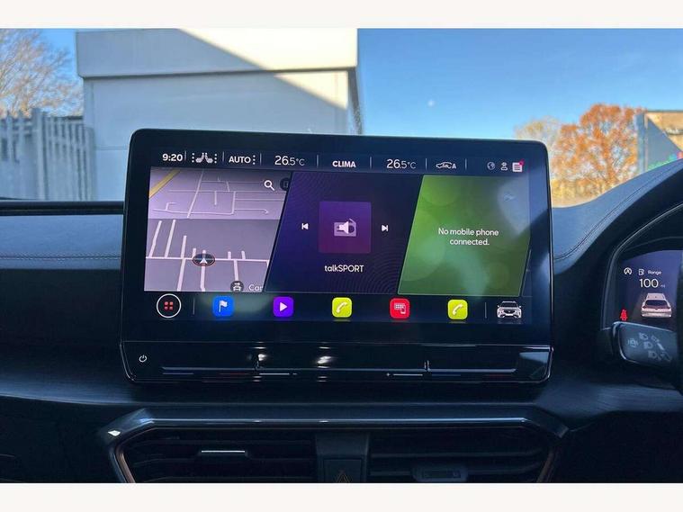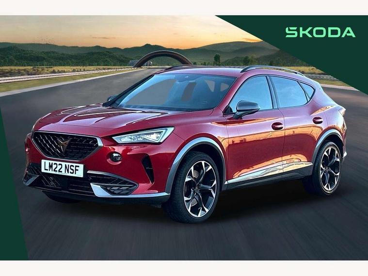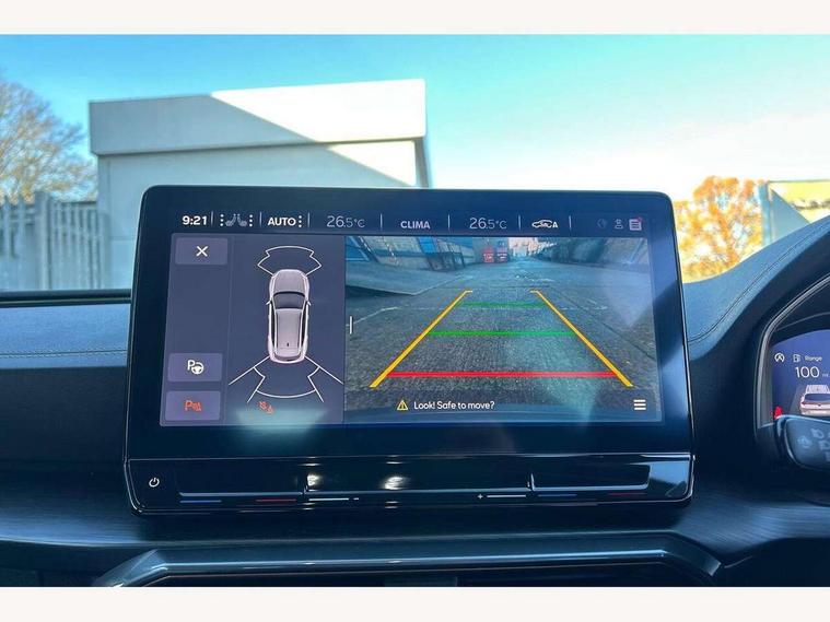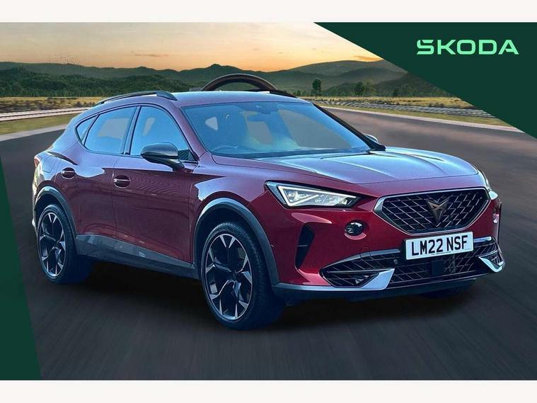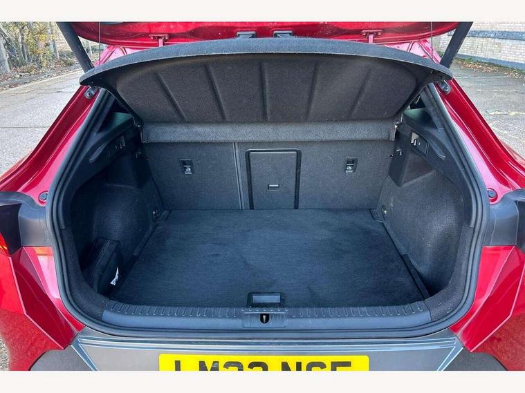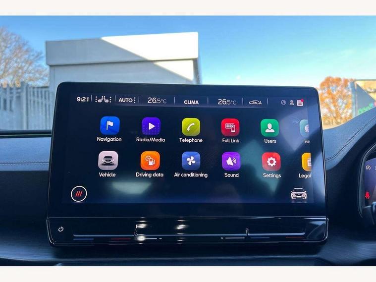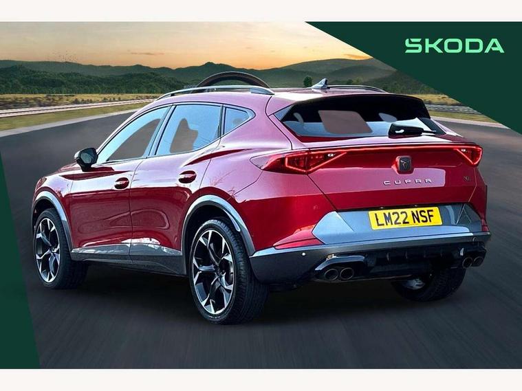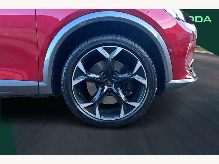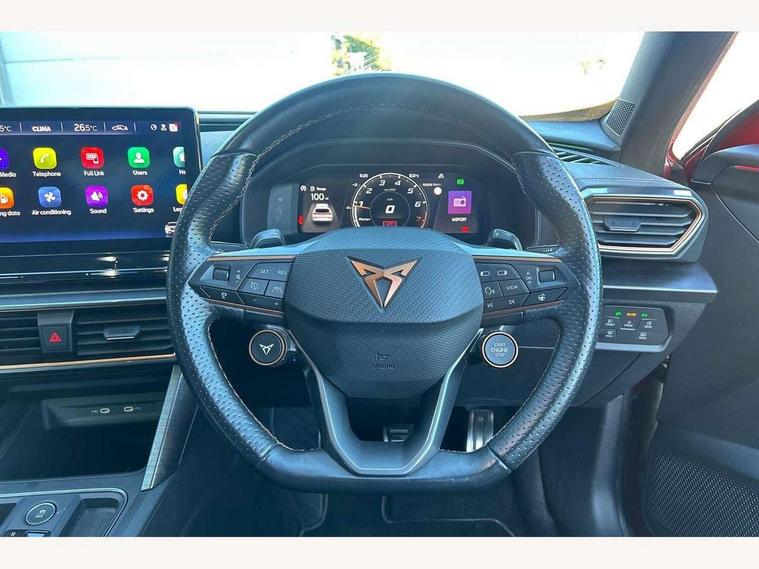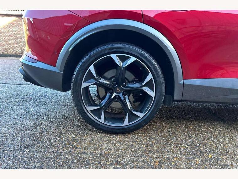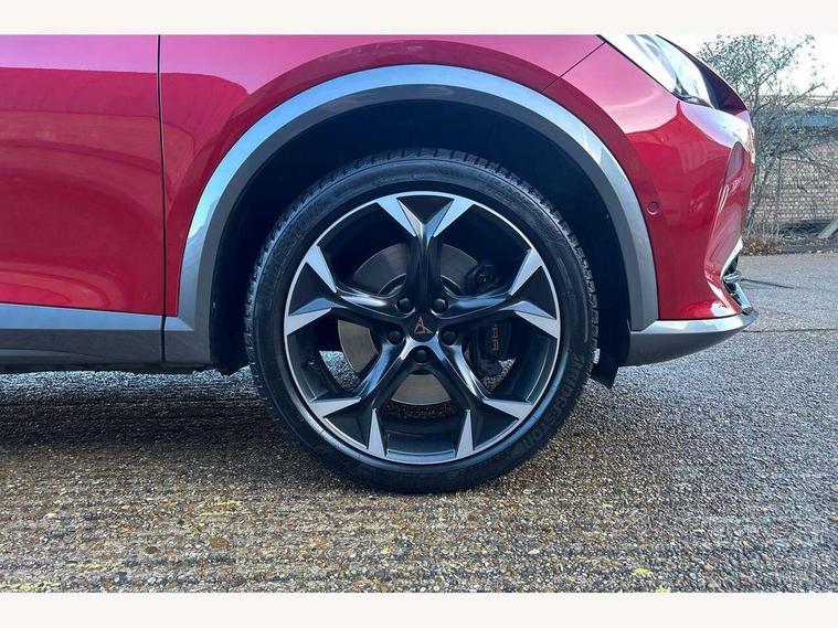 Digital cockpit and configurable dashboard, Driver alert system, Dynamic chassis control with driving profile selection (Comfort, Sport, CUPRA, Individual), E-call, Forward collision warning with automatic braking, Lane assist, Park assist (inc front/rear parking sensors), Predictive adaptive cruise control with speed limiter, RPM, trip computer, outside temp gauge, instrument light brightness, low fuel warning light, lights on reminder, gearshift indicator, Service interval indicator, Speed sensitive power steering, Start/stop system with regenerative braking, Virtual pedal and electric tailgate, Wireless apple carplay, Wireless phone charger, Electronic locking differential and dynamic traction support, Sports suspension with front shock absoption, 2 front and 2 rear USB type C sockets, Auxiliary input socket, DAB radio, Auto dimming rear view mirror, Body colour door handles, Body coloured bumpers, Dark grey wing mirror, Daytime running light with automatic headlight control and coming home feature, Dynamic headlight range control, Electric front/rear windows, Electrically adjustable heated and folding door mirrors with memory function, Front fog lamps with cornering function, Gloss black roof rails and window surrounds, LED Headlights, LED Taillights with dynamic indicator, Rain sensing wipers, Rear diffuser with twin exhaust pipe on each side, Rear side wing doors, Rear wash/wipe, Sports bumpers, Third brake light, Tinted rear windows, VZ logo rear badging, Welcome lights, 12v power supply in centre console, 12V socket, 12v socket in loadspace, 2 front and 2 rear reading lights, 230V socket, 3 seat bench in 2nd row, 60/40 split rear bench seat with armrest and mechanical seat release, Black headlining, Cupra sports pedals, Dust/pollen filter, Front and rear head restraints, Front centre armrest, Height/reach adjust steering wheel, Illuminated interior front door sills, Illuminated sunvisor with mirror, Isofix, Leather heated multi-function sports steering wheel with start stop, CUPRA mode button and gear shift paddles, Luggage tie-down hooks, Single front passenger seat, Three zone climate control with control panel in rear, Variable luggage/load compartment floor, Wraparound lighting, Genuine Nappa leather Pack - Cupra, Navigation system pack - Formentor, Safety and driving pack (XL) - Formentor, 3 point seatbelts on all rear seats, ABS, Brake control system - ESC and brake booster, Child proof door locks, Driver and front passenger airbags with front passenger airbag de-activation, Electronic parking brake, Front and rear disc brakes, Front side curtain airbags, Hill hold control, Seat belt reminder for front and rear seats, Tyre pressure monitoring system, Anti theft alarm system, Keyless entry and start system (KESSY), Locking wheel bolts, Copper and aluminium interior detailing, 19" 'Exclusive' machined sport matte black and silver alloy wheels, Space saver spare wheel,