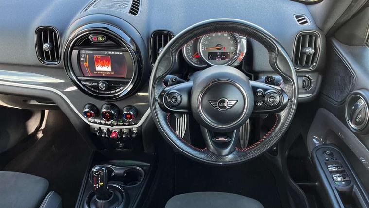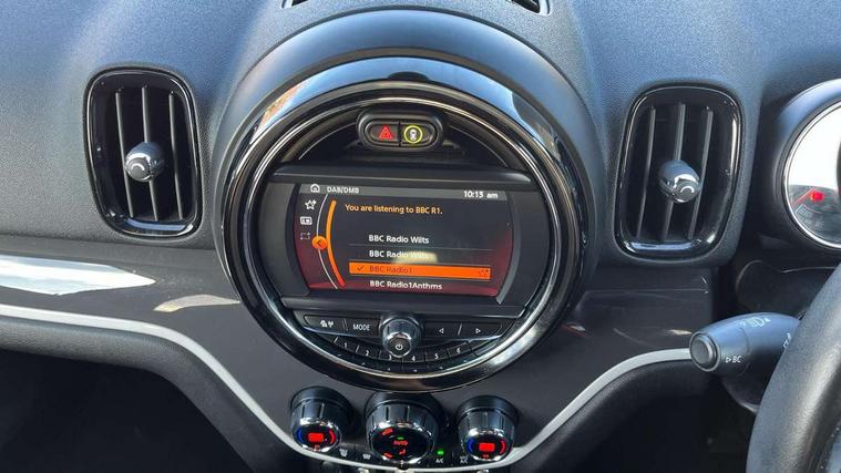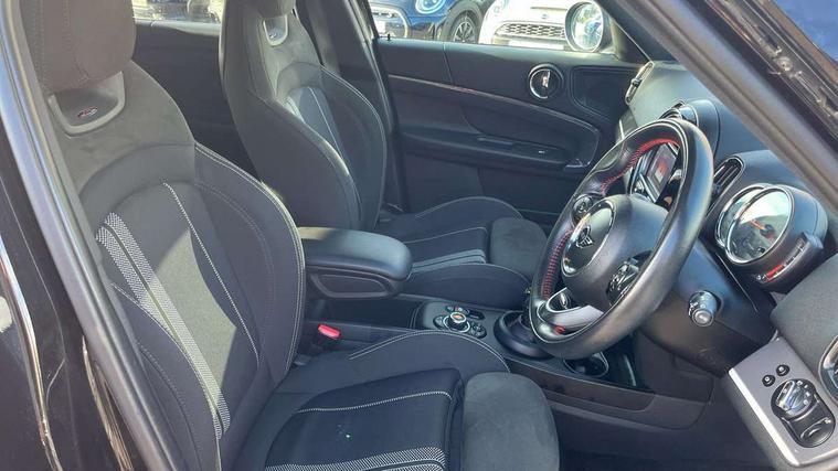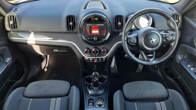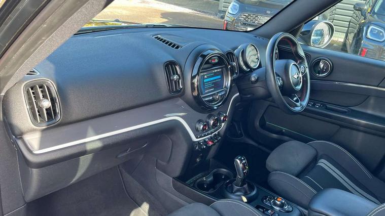 Apple CarPlay preparation, Brake pad wear indicator warning light, Central display with LED ring and 6.5" colour touch screen, Connected driver, DTC - Dynamic traction control, Exterior temperature gauge, Intelligent emergency call, MINI remote services, MINI TeleServices, Navigation system, On board computer, Personal Profile, Real time traffic information, Service interval indicator, Servotronic speed sensitive power steering, Electronic differential lock, Performance Control, Auxiliary input socket, DAB digital radio module, MP3 compatible radio/single CD player, Radio visual boost, Anti dazzle rear view mirror, Body colour scoop integrated into engine- compartment lid, Chrome door handles, Chrome headlight surround, Chrome plated radiator grille, Chrome side scuttle, Chrome window surround, Electric front windows + one touch + anti-pinch, Electrically adjustable door mirrors, Follow me home headlights, Green tinted glass, Heated door mirrors/heated windscreen washers, Heated rear window with automatic switch off, Metal look door sill finishers, Rain sensor including auto headlights activation, Rear wiper, Roof spoiler, Twin chrome exhaust tailpipes, White indicator lights, 12V power point front, 2 cupholders in front centre console, 4 lashing points to secure luggage, 40:20:40 split folding rear seats, Centre console storage box, Chrome interior door handles, Driver/passenger sunvisors, Front and rear headrests, Front interior light, Front passenger grab handle, Front seat backrest storage nets, Gearshift paddles, Heater with recirculation function, Height/reach adjust steering wheel, Isofix rear child seat preparation, Luggage compartment lighting, Multifunction steering wheel, Rear grab handles, Sensatec gearshift and handbrake, Sport front seats, Storage compartments in doors, Toolkit in luggage compartment, Interior lights pack - Countryman, MINI Excitement Pack - Countryman, 3 point automatic seatbelts, 3 point seatbelts on all rear seats, ABS, CBC - (Cornering brake control), Crash Sensor - activates hazard/interior lighting + unlocks doors, Driver and passenger airbags, Driver and passenger side airbags, DSC - Dynamic Stability Control, Electronic brake force distribution, Electronic parking brake, Front curtain airbags, Front passenger airbag deactivation, Fuel cut off safety device, Hill start assist, Pyrotechnically pre-tensioned front seatbelts, Tyre pressure warning, Automatic door locking, Keyless Start, Locking wheel bolts, RF remote control central locking, Second remote key, Thatcham category 1 alarm + immobiliser,