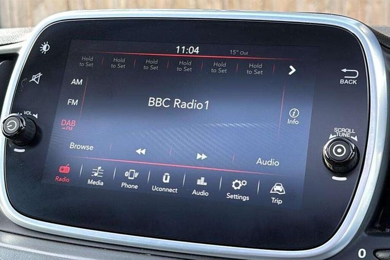 Apple car play/Android Auto, Dualdrive PAS, Sports button, TFT display screen, Trip computer, U-connect access via mobile, Body coloured bumpers, Dark chrome door handles, Electric front windows, Front fog lights, LED daytime running lights, 12V socket, Air conditioning, Cloth upholstery, Driver/front passenger seat height adjustment, Front head restraints, Front passenger seat memory, Glovebox, Height adjustable steering wheel, Interior stowage net, Multifunction leather steering wheel, Rear headrests, Sports seats, U-connect pack with touchscreen radio - 595, 3x3 point rear seatbelts, ABS, Driver and passenger airbags, Drivers knee airbag, ESP + ASR/MSR + HBA + Hill holder, Front side airbags, High performance perforated brakes, Tyre pressure monitoring system, Window airbags, Alarm, Central locking, Immobiliser, Remote central locking, Satin grey dash trim, 17" Formula alloy wheels with matt black finish, Fix and go kit,