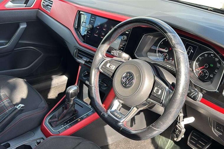 App-Connect, Bluetooth Telephone preparation, Driver alert system, Multifunction colour display, PAS - speed related, Service interval indicator, Start/stop system, Trip computer, Warning buzzer and light for front seatbelts unfastened, Battery regeneration during braking, Lowered sports suspension, XDS electronic differential lock, 6 speakers, Composition media system with radio, glovebox mounted CD, colour touch screen, SD card, aux-in, USB, multimedia interface, DAB Digital radio, Driver Personalisation profile selection, Automatic dimming interior rear view mirror with rain sensor, Automatic headlamp activation, Black grille with chrome surround, Body colour bumpers, Body colour door handles, Body coloured side sills, Chrome insert to lower bumper, Chrome trimmed front air intake surrounds, Electric front windows, Electric operated/heated door mirrors, Extended sill strips flared in black, Front fog lights including static cornering, Front wash/wipe with interval delay, Fully galvanised body, Gloss black rear spoiler (roof), Heated rear window with auto timer, High level 3rd brake light, Honeycomb radiator grille with red stripe, LED darkened rear light clusters, LED daytime running lights, LED rear number plate lights, Manual coming/automatic leaving home lighting function, Rear electric windows, Rear windscreen washer and wiper with interval delay, Stainless steel door sill protections with GTI logo, Twin chrome exhaust tailpipes, Unique GTI badging, 12V power socket in centre console, 2 bag hooks in luggage compartment, 2 cupholders, 3 rear head restraints, 60/40 split folding rear seat, AlumInium look pedals and driver's footrest, Ambient lighting, Black roof lining and sun visors, Chrome-plated electric window button surround, Driver/front passenger seat height adjustment + underseat drawers, Driver/passenger sunvisors with illuminated vanity mirrors, Dust/pollen filter, Front + rear carpet mats, Front seat backrest storage nets, Front seats with lumbar support, Front/rear reading lights, Gear change selection via paddle shift on steering wheel, Glovebox, Handbrake grip button in chrome effect, Height/reach adjustable steering column, Instrument lighting, white adjustable panel illumination, Interior light with delay, Isofix Preparation 2 Rear child seats, Jack and tool kit, LED footwell lights, Luggage compartment cover, removable, Luggage compartment lighting, Matt chrome gear lever gaiter surround, Storage compartment in front doors, Storage compartment in rear doors, Storage compartment under front seats, Three spoke leather trimmed multifunction steering wheel with red contrast stitching, Titanium black headlining, Variable Luggage compartment, GTI styling pack - Polo, 3 point height adj front seatbelts + pretensioners, 3x3 point rear seatbelts, ABS, Automatic post collision braking, Driver/front passenger airbag, Driver/Passenger whiplash optimised head restraints, ESP with EDL + ASR, Front and rear passengers curtain airbag system including front side airbags, Front passenger airbag deactivation, Front/rear disc brakes, Hill hold control, Hydraulic Brake Assist (HBA), Red brake calipers, Two tone horn, Tyre pressure monitoring system, Alarm with remote central locking and interior protection, Electronic engine immobiliser, Air vents in Matt chrome, Chrome plated electric mirror adjustment light switch surround, Gloss black instrument surrounds, Space saver spare wheel,