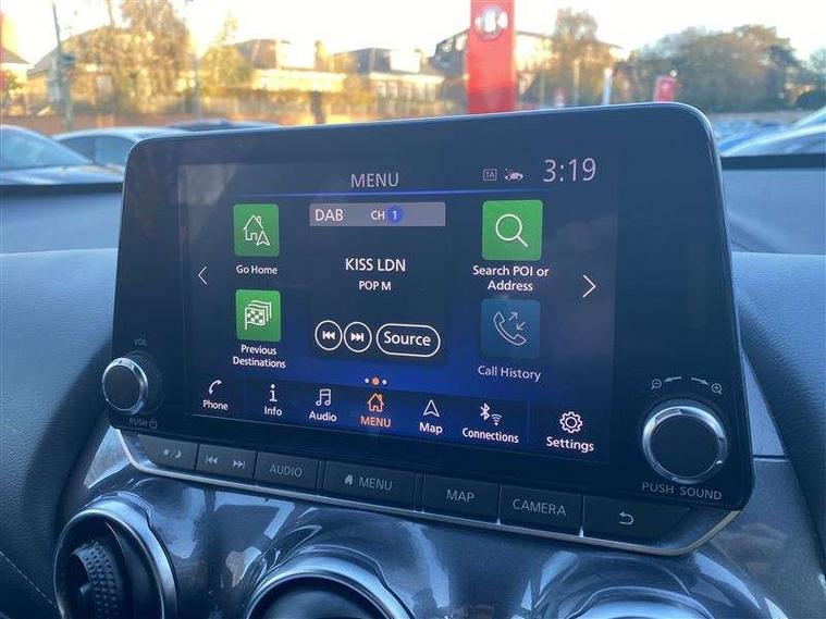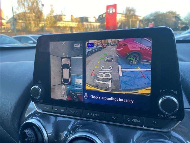 7" full colour TFT screen combimeter, Apple CarPlay and Google Android auto, Drive modes select (Eco, normal and sport), eCall emergency call system, Emergency and breakdown call, Front parking sensor, Idle start/stop system, Intelligent lane intervention, Lane departure warning system, Nissan connect 8" touch screen entertainment system, Nissan connect nav with TomTom traffic, Nissan connect services and Wifi connection, Outside temperature sensor, Power Steering, Rear parking sensor, Traffic sign recognition, Trip computer, Voice recognition, Gasoline particulate filter, Bluetooth system, USB, Aux-in and 12V socket, Bose personal plus audio system with 8 speakers(4 speakers and 2 headrest speaker for driver and passenger seats), Bose personal sound stage control, DAB Digital radio, Rear console USB port, Auto dimming interior rear view mirror, Auto headlights, Automatic hazard signal with emergency stop signal, Body colour bumpers, Body colour door handles, Electrically adjustable door mirrors with integrated indicators, Follow me home headlights, Front and rear electric window with one touch driver window, Heated and auto folding door mirrors, High beam assist, LED daytime running lights, LED front fog lights, LED headlamps, LED rear fog lamp, LED rear lamps, Rain sensor windscreen wipers, Rear privacy glass, Rear side wing doors, Rear wiper, Thermaclear heated windscreen, Three blink turn signal, 3 height adjustable rear headrests, 3 seat bench in 2nd row, 60/40 split folding rear seat, Automatic climate control, Card holder on driver sunvisor, Cloth/Synthetic leather upholstery, Door ambient lighting, Driver and passenger sliding and reclining seats, Driver seat back pocket, Driver side rear coat hanger, Driver/passenger sunvisors and vanity mirrors, Front and rear cabin lights, Front armrest, Front door pockets with bottle holders, Front head restraints, Front passenger isofix child seat anchorage point, Front/rear passenger grab handles, Gear console ambient circle lighting, Grey synthetic leather kneepad, Heated front seats, Height adjustable driver's seat, Height adjustable passenger seat, Internal chrome door handles, Leather gearshift knob, Leather steering wheel, Luggage board, Luggage space lighting, Monoform sporty seats, Multifunction steering wheel, Passenger seat back pocket, Rear door bottle holders, Single front passenger seat, Telescopic steering wheel adjustment, Two cupholders in front centre console, Two rear isofix child seat anchorage points with top tether, Welcome light and console tray ambient lighting, Advanced safety shield pack - Juke, ABS with EBD and brake assist, Active ride control, Active Trace Control, Driver and passenger airbags, Driver and passenger side airbags, Electric handbrake with auto hold function, Electronic Stability Programme (ESP), Front and rear curtain airbags, Height adjustable seatbelts, Hill start assist, Intelligent emergency braking with pedestrian and cyclist recognition, Rear door child safety locks, Seatbelt reminder for driver/front passenger and rear seats, Single tone horn, Three 3 point rear seatbelts, Traction control, Tyre pressure monitoring system, VDC Dynamic Vehicle Control, Ventilated rear brake discs, Alarm, Immobiliser, Intelligent Key with push button starter, Remote central locking,