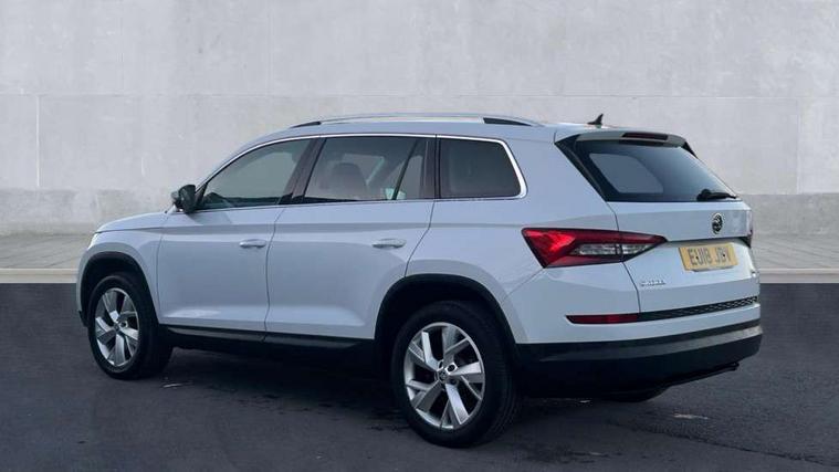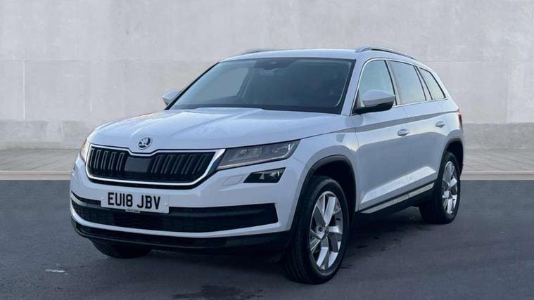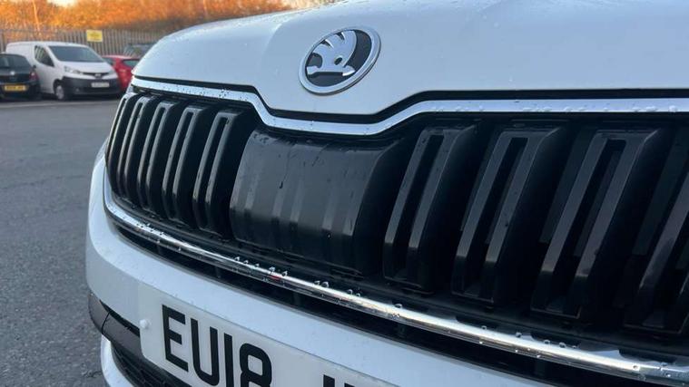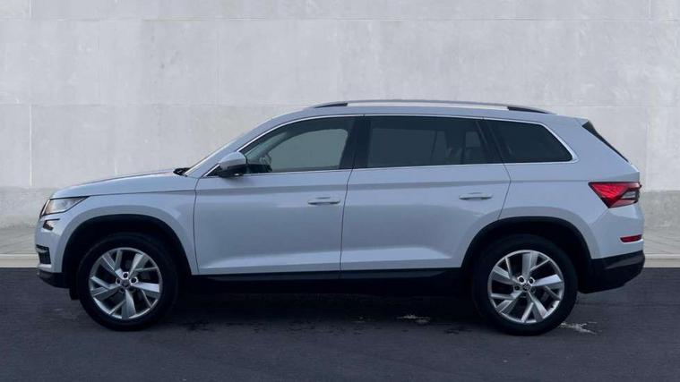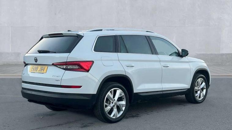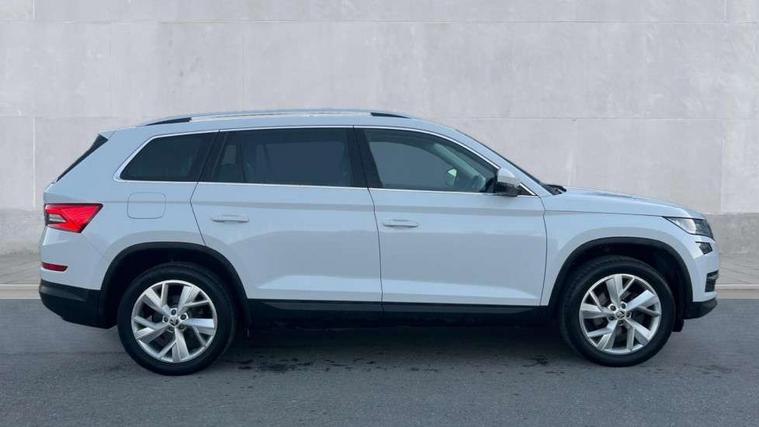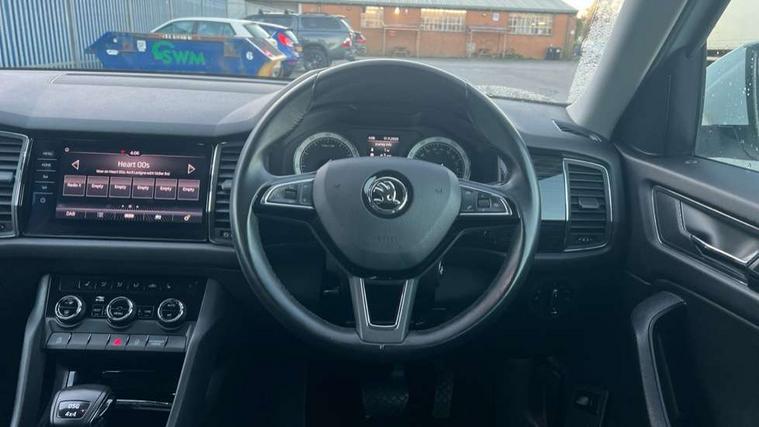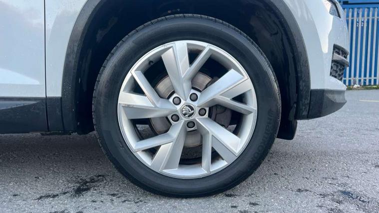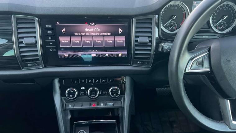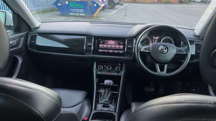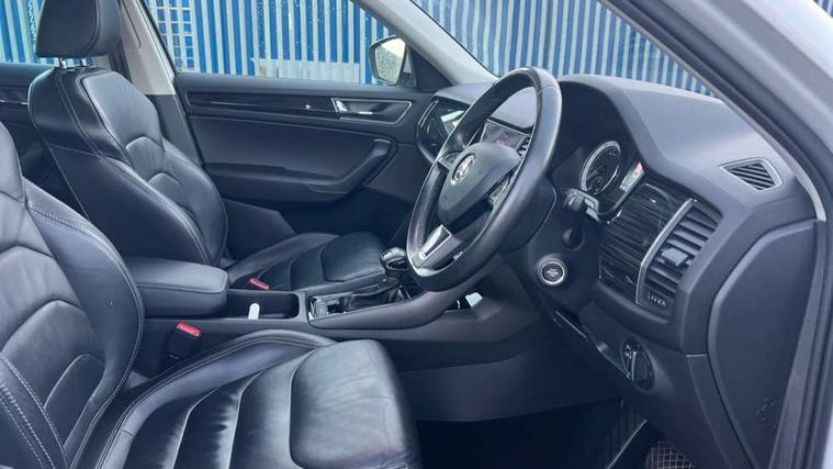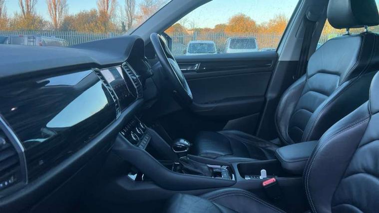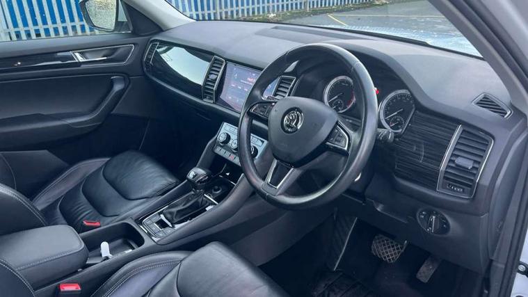 Bluetooth system, Colour maxi dot trip computer, Columbus satellite navigation with 9.2" touch screen and integrated Wi-Fi, Digital voice enhancement, Drive mode selector, Exterior temperature gauge, Phone box, Power tailgate, SmartLink plus, Speed limiter, Bolero Radio, DAB Digital radio, DVD System, SD card slot, USB connection, Adaptive front lighting system, Aero wiper + intermittent function, Auto dimming door mirrors, Auto dimming rear view mirror, Automatic activation of hazard warning lights, Body colour bumpers, Body colour door mirrors and handles, Electric adjustable/heated/folding door mirrors, Electric front windows, Electric rear windows, Front and Rear door steps, Headlight washers, Heated rear window, High beam assist, High gloss black grille with chrome inserts, LED daytime running lights, LED front fog lights with static cornering light function, LED Headlights, Light assistant (coming home/tunnel light), Rain and light sensors, Rear spoiler, Rear wiper, Silver roof rails, Sunset privacy glass, Tinted windows, 12V Accessory socket in centre console, 12V power point in luggage area, 3 rear height adjustable headrests, 4 lashing points on luggage floor, 60/40 split fold rear seat back, Boot storage compartments, Centre console with storage/cupholders, Chrome gear shift lever, Chrome inner door handles, Driver's glovebox with lid, Driver's storage box, Electrically adjustable front seats with lumbar support and memory settings, Folding grab handles with rear coat hooks, Front and rear bottle holders, Front centre armrest with storage compartment, Front/rear courtesy lights, Height adjustable front seats, Height/tilt adjustable front headrests, Illuminated air conditioned glovebox, Illuminated luggage compartment, Isofix system on outer rear seats, Leather upholstery, Luggage compartment cover, Luggage nets in boot, Manually adjustable steering column, Passenger side net compartment on centre console, Pollen filter, Rear centre armrest with cupholders, Removable LED light in boot, Sunglasses storage, Sunvisors with illuminated vanity mirrors, Ticket holder, Chrome pack - Kodiaq, 3 point front/outer rear seatbelts+pre-tensioners, ABS + EDL + ASR + MSR + ESC, Automatic unlocking of doors in case of impact, Driver and passenger airbags, Drivers knee airbag, Electromechanical parking brake, Front assist including city emergency braking, Front side airbags, Fuel cut off safety device, HBA (Hydraulic Brake Assist), Head airbags, Hill hold control, Passenger airbag deactivate switch, Seatbelt warning, Two tone horn, Tyre pressure monitor, Alarm with interior monitoring and tilt sensor, Anti-theft wheel bolts, Immobiliser, Keyless entry and keyless start, Remote central locking,