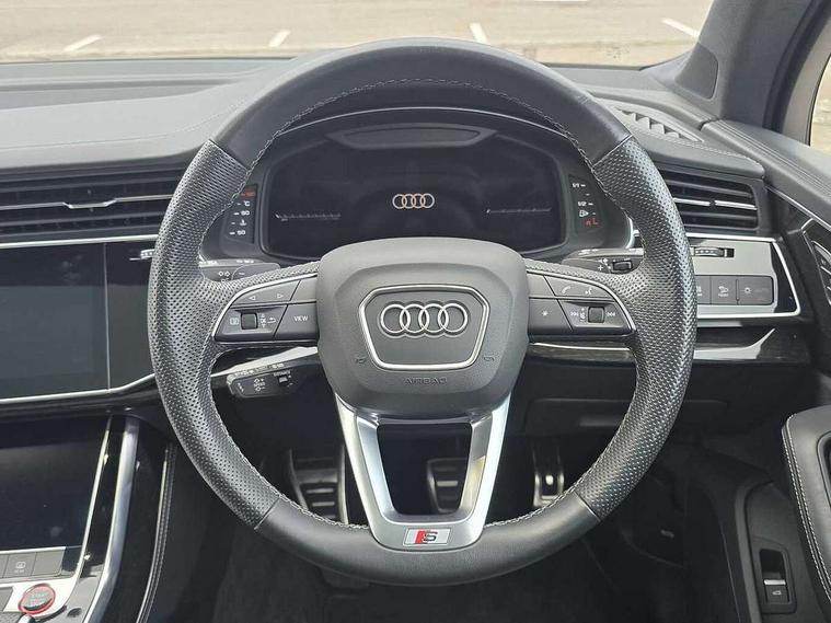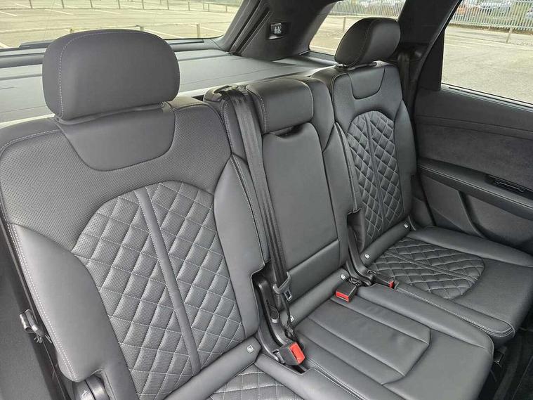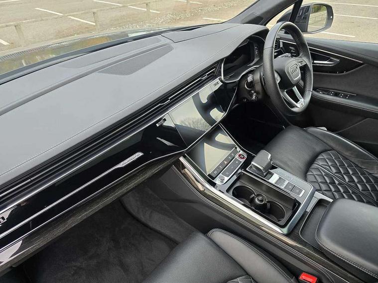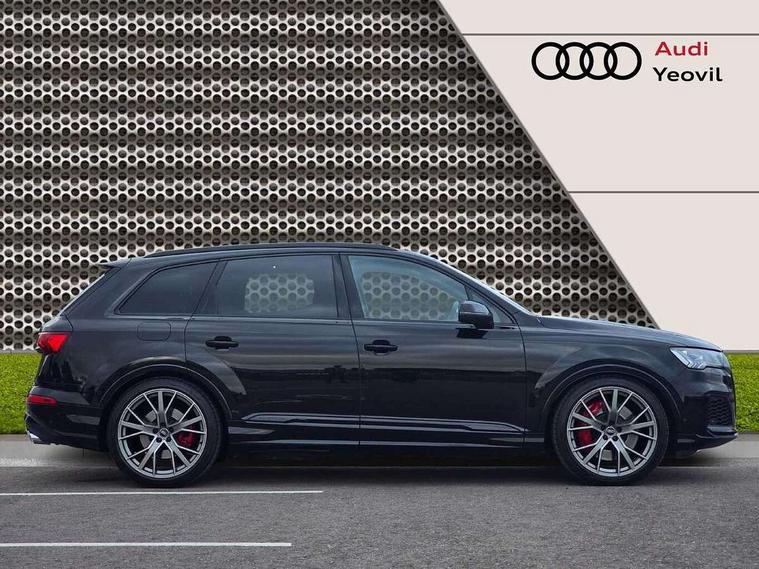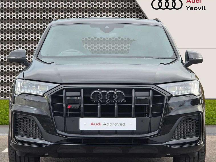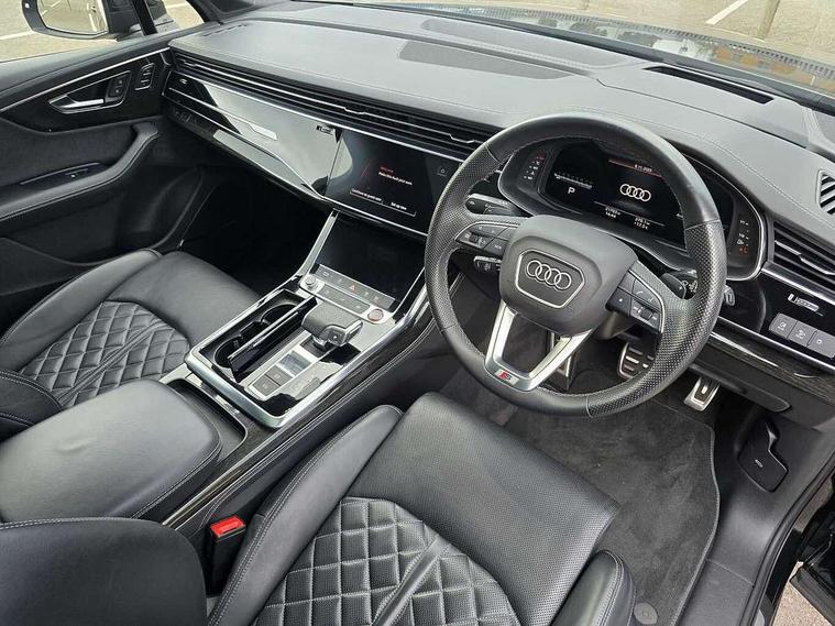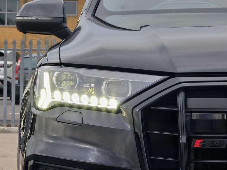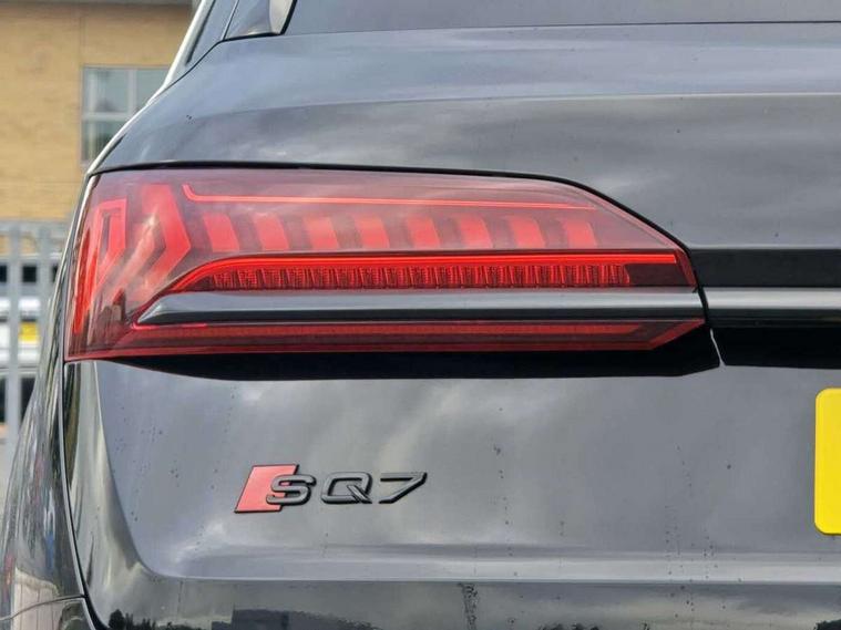 360 degree camera, Audi connect safety and service (e-call), Audi connect with Amazon Alexa Integration, Audi drive select (Auto, Comfort, Dynamic, Efficiency, Individual, Off-road and All road), Audi phone box light with wireless charging, Audi virtual cockpit plus, Bluetooth interface, Camera based traffic sign recognition, Head up Display, MMI navigation plus with MMI touch screens includes 10.1" and 8.6" screens with haptic feedback, Natural voice recognition, PAS, Power door closure, Power operated tailgate, Smartphone interface includes wireless Apple carplay/Android Auto, Start/stop system, 48V Mild hybrid technology, 85 litre fuel tank, Electromechanical active roll stabilisation, Quattro all wheel drive with self locking centre differential, Quattro with sport differential, S specific adaptive air sport suspension, Audi music interface - front 2 USB-C ports with charger and data functions, Bang + Olufsen premium sound system, DAB digital radio module, 3rd brake light, Adaptive windscreen wipers with integrated washer jets, Audi Beam uses LEDs to project Audi logo onto the ground as you exit your SQ7, Audi HD matrix LED headlights with Audi laser light + dynamic front and rear indicators, Auto dimming frameless rear view mirror, Black roof rails, Electrically adj heated/folding + automatically dimming exterior mirrors with memory + automatic kerb side function for passenger side exterior mirror, Gloss black finish for exterior Audi rings and SQ7 logos, Headlight washers, Heat insulating glass in windshield, Integrated LED indications in door mirrors, LED daytime running lights, LED rear tail lights, Privacy glass - dark tinted rear and rear side windows from B-pillar backwards, Rear side wing doors, Rear wiper, S specific rear bumper with 4 exhaust pipes, 2 seat bench in 3rd row, 3 seat bench in 2nd row, 3 spoke heated leather multi-function sport steering including paddle shift, 4 zone deluxe automatic climate control, 7 seat layout with ISOFIX points for the front passenger seat and rear passenger seat, Ambient lighting in surfaces and edges, Black dinamica headlining, Comfort front centre armrest, Contour lighting accentuates lines and joint contours, Double sun visors with illuminated vanity mirrors, Electric adjustable front seats/backrest bolsters, lumbar support, memory functionality, Electric steering wheel adjustment, Folding rear seats, Front head restraints, Front/rear floor mats, Heated front seats, Illuminated door sill trims with S logo, LED glare-free lights, Luggage compartment sill protection in stainless steel, Manual sunblind for the rear side windows and manual sunblind for the rear window, Rear head restraints, Seat ventilation and massage function in the front, Single front passenger seat, Stainless steel pedals, Valcona leather upholstery with front super sport seat S embossed logo, Anthracite black styling pack - Q7/SQ7, City assist pack - Q7, Extended leather pack - SQ7, Technology Pack Pro S - SQ7, Tour pack with Adaptive cruise assist - Q7, 3 point seatbelts on all rear seats, Audi pre sense front, Child locks on rear doors, Driver and front passenger, front side and curtain airbags, Electromechanical parking brake, Electronic Stabilisation Control (ESC) including ABS, ASR and EDL, Extended pedestrian protection measures, Hill hold assist, Seatbelt monitoring, Tyre pressure loss indicator, Warning triangle and first aid kit, Anti theft alarm, Anti-theft wheel bolts and wheel loosening detection, Remote central locking, 22" 5-V Spoke aluminium star design audi sport matt grey with gloss turned finish alloy wheels, Tool kit, Tyre repair kit,
