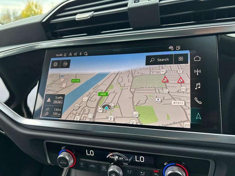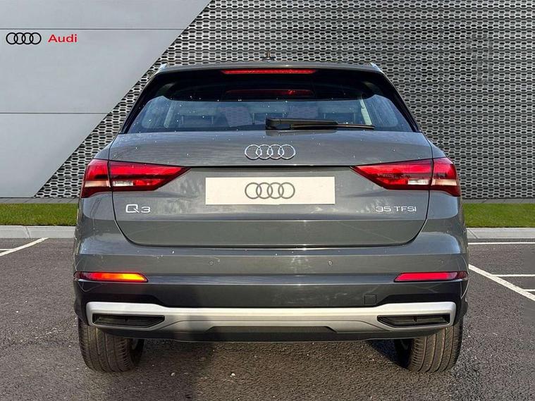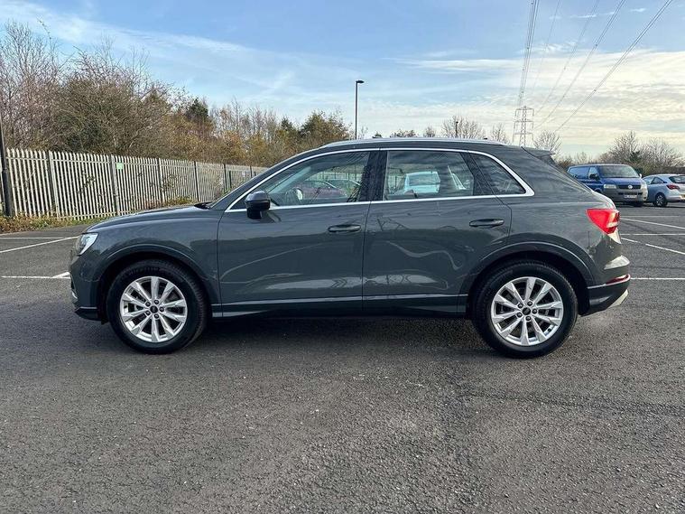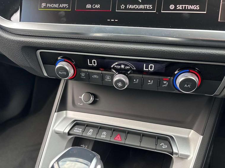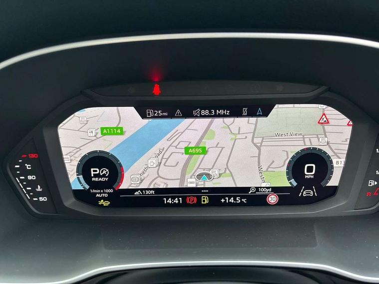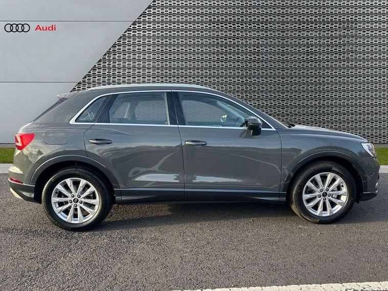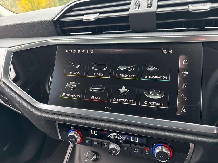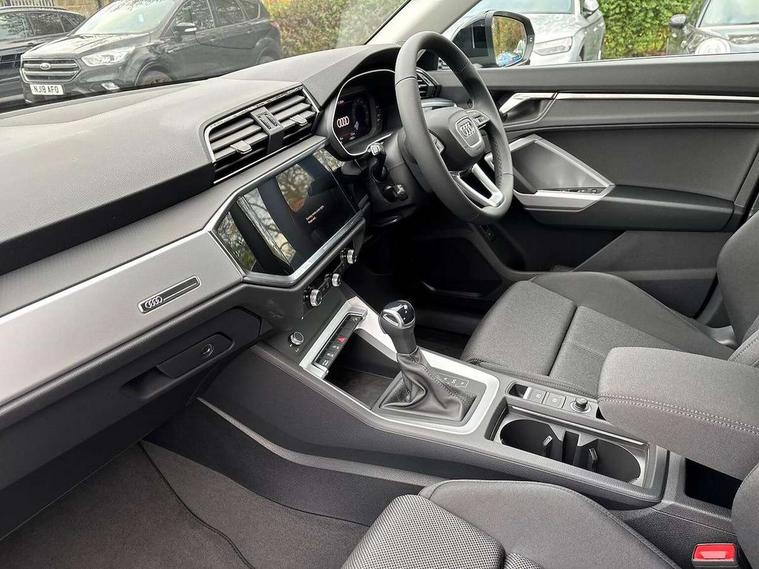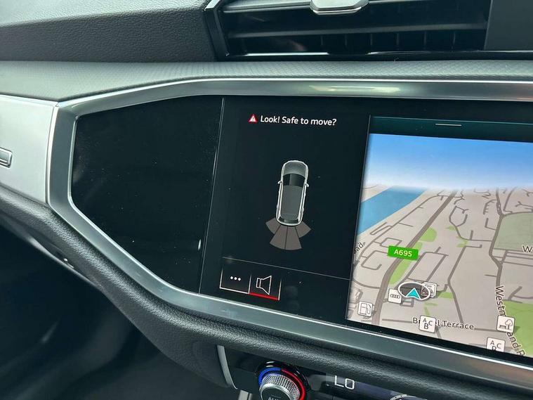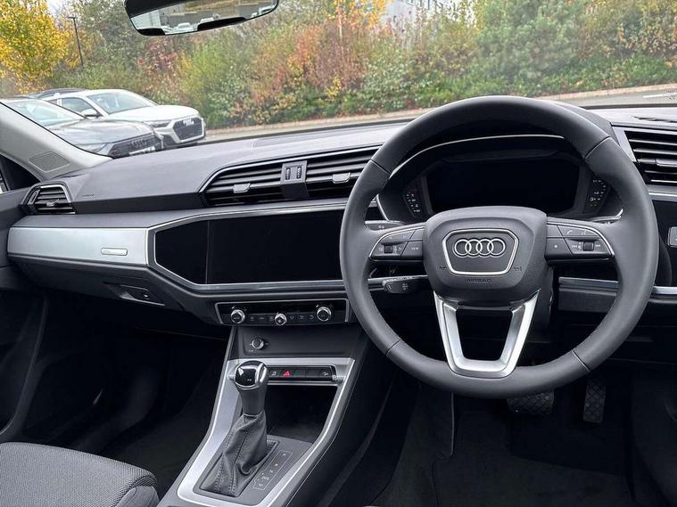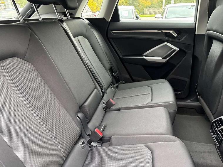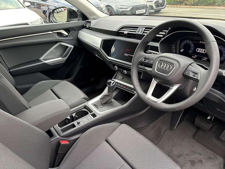 Audi connect, Audi drive select, Audi lane departure warning, Audi side assist, Audi smartphone interface, Audi Virtual Cockpit - 10.25" display, Bluetooth interface, MMI navigation plus with MMI touch, Power opening/closing tailgate, Progressive steering, Service interval indicator, Stop/start system, Voice control system, DAB digital radio module, Acoustic windscreen, Aluminium roof rails, Aluminium window trim, Auto dimming rear view mirror, Body colour door mirrors, Electrically adjustable and heated door mirrors with integrated LED side indicators, Front and rear electric windows, Front fog lights, Front side air inlets in matt selenite silver, Front spoiler in matt selenite silver, Grille vertical bars in aluminium silver/Matt, High gloss black finish B and C pillars, Rain and light sensors, Rear diffuser strip in selenite silver, Titanium black radiator grille, 12V socket in rear centre console, 40:20:40 split folding rear bench seat, Aluminium door sill trims, Dual zone climate control, Front and rear headrests, Front and rear velour floor mats, Front centre armrest with storage compartment and angle adjustment, ISOFIX child seat mounting and Top Tether with front passenger airbag deactivation, Lunar silver cloth headlining, Manual front seats with height adjustment, Stainless steel luggage compartment sill finisher, Non smoking pack - Q3, 3x3 point rear seatbelts, 6 airbags - Driver, front passenger, curtain and side windows, Audi pre-sense front with pedestrain and cyclist recognition, Electronic stabilisation control including ABS, ASR and EDL, Hill hold assist, Pre sense basic, Seatbelt monitoring, Tyre pressure warning, Warning triangle and first aid kit, Anti theft alarm, Anti theft wheel bolts, Remote central locking, MMI touch colour display in gloss black with aluminium surround,