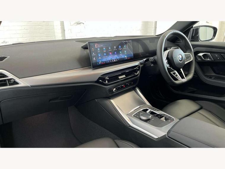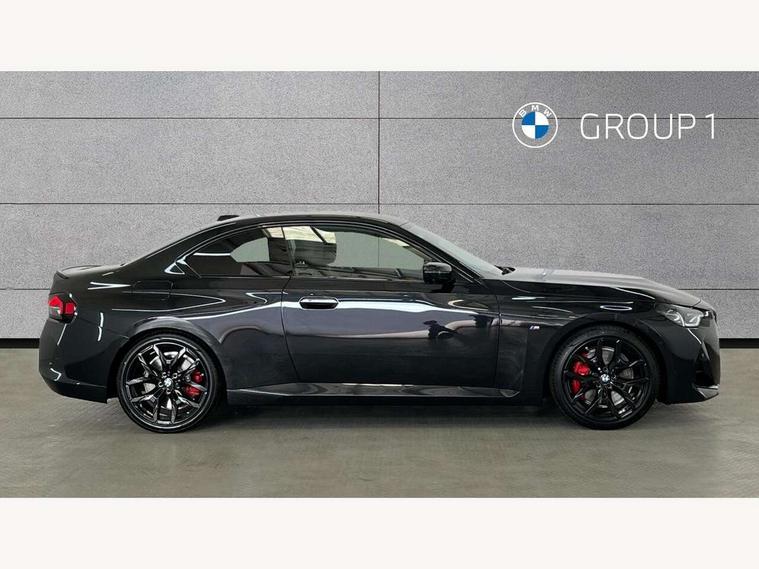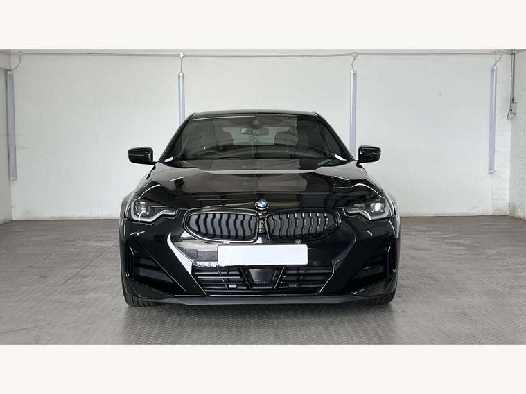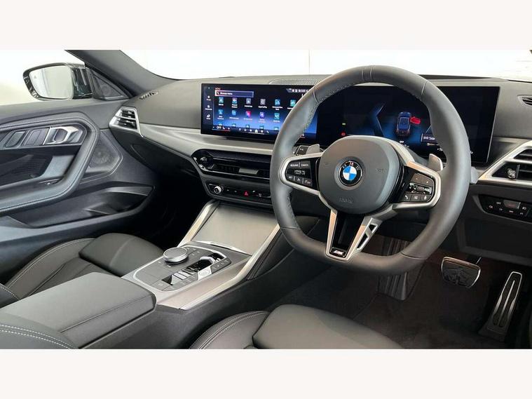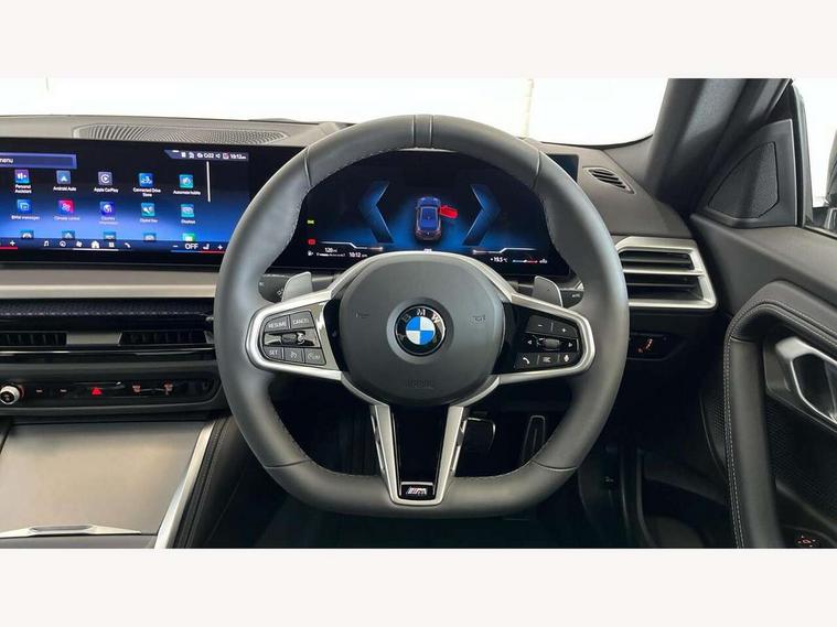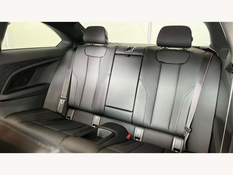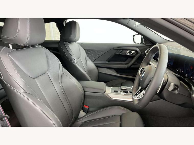 Active guard plus, Attentiveness assist, Bluetooth with USB, BMW ConnectedDrive online services, BMW Intelligent Personal Assistant, BMW Live cockpit plus, BMW Teleservices, Check Control warning system for monitoring of lights and door/luggage compartment open warning, Control Infotainment, Direct selection buttons, Drive off assistant, Electric power steering, eSim with 5G connectivity, Front and rear parking sensors, iDrive controller with turn and press function, Intelligent functions, Oil sensor for level and grade, Optimum shift indicator, Personal Profile, Smartphone integration, Touch operation on control display, Variable sport steering, Widescreen display with 12.3" fully digital instrument cluster and 14.9" control display, WiFi interface for wireless connection of mobile terminal devices, Aluminium lightweight construction, Balancer shaft, BMW TwinPower Turbo four-cylinder petrol engine, Double VANOS, Drive performance control with ECO PRO comfort + sport mode, Electronic differential lock, High precision injection, M sport suspension, Petrol Particulate Filter, Steptronic transmission with gearshift paddles, Twin scroll turbocharger with Valvetronic, 1 x USB Type A with data transfer and 1.5 Ampere charging function in the centre console, 1 x USB Type C with 3 Ampere charging function in the front centre armrest, DAB tuner, Acoustic windscreen wipers for reduced driving noise, Automatic windscreen wipers and automatic headlight, Body colour door handles flush with door surface, Body colour door mirrors, Body colour front and rear bumpers, Daytime running lights, Electric windows - front and rear, with open/close fingertip control and trap release, Exhaust tailpipes x2 - 90mm in left and right, Fading support, Front and rear bumper system with replaceable deformation elements, Front door sill finishers in black plastic with BMW designation, Front windscreen wipers with integrated washer jets, Green tinted heat protection glazing, High gloss black sill, bumper trim sides and diffuser insert, High level third brake light, Indicators integrated int mirror housing, Interior rear-view mirror with automatic anti-dazzle function, LED registration plate light, LED technology rear tail lights, brake lights and turn indicators, M high gloss shadowline, Rear boot, Rear fog lights, Reversing light in rear light cluster, Shark fin antenna, Single part LED rear lights with smoked glass components, Trailer stabilisation logic, Visible VIN plate, 12V power socket in front centre console with blanking plug, 2 cupholders in front centre console, 2 zone automatic air conditioning, Ambient lighting, Conditioned based service, English handbook, Folding rear seat head rests, Front and rear side armrests integrated into door trim, Front armrest, Front door pockets, Front head restraints, Heated front seats, Illuminated glove compartment with separate small compartment, M headliner Anthracite, M sport leather steering wheel, Manually adjustment steering wheel column, Rear seat backrest with manual 40:20:40 split folding, Rear seat centre foldable armrest with integrated cup holder, Single front passenger seat, Storage compartment between rear seats, Storage tray and compartment with cover in centre console, Sun visors with vanity mirrors and insert tab, Through loading system with 40/20/40 split folding 2 rear seat in 2nd row, Velour floor mats, Connected pack professional - 2 Series Coupe, Storage compartment pack - 2 Series Coupe, 2 tone horn, Anti lock braking system (ABS) with cornering brake control, BMW emergency call, Brake drying, Child seat ISOFIX attachment for the two outer rear seats, Crash sensor activating of airbags, Unlocking doors, hazard warning lights, interior light, safety battery terminal, Deactivation of fuel pump in the event of a crash, Driver and front passenger airbags, Driver and front passenger side airbags, integrated in the door side seat backrest bolsters for all seat variants, Dynamic brake control, Dynamic stability control + (DSC+), Dynamic Traction Control - DTC, Electrically operated hand brake including automatic hold function and automatic release when driving off, Front and rear disc brakes, Front centre airbag between driver and front passenger seats, Front passenger airbag deactivation, Head airbags for all 4 outer seats, PC iBrake (Post crash approach control warning with light braking function), Seat belt security check for driver and front passenger, Seatbelt warning, Side impact protection, Three point seat belts on 4 seats including front belt stopper, pyrotechnic belt tensioners and belt force limiters, Tyre pressure monitoring system, Warning triangle and first aid kit, Alarm system (Thatcham 1) with remote control and electronic engine immobiliser, Central locking switch for all doors, fuel filler cap and luggage compartment, Deadlocking function system to all doors, Drive away locking system on all doors and luggage compartment, Locking wheel bolts, Start/Stop button (illuminated) in centre console with keyless engine start and Auto Start-Stop deactivation button, Two remote control key with integrated key - one button for open and close doors/fuel flap/tailgate and separate button for unlock luggage compartment, Electrically powered 12V compressor, Reduced rolling resistance tyres, Tyre repair kit,