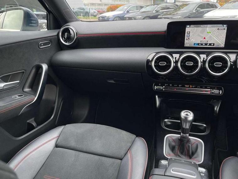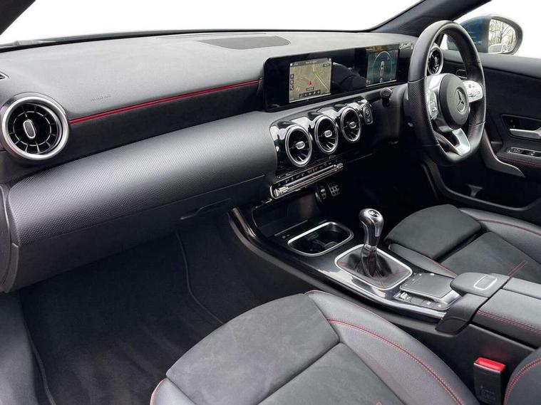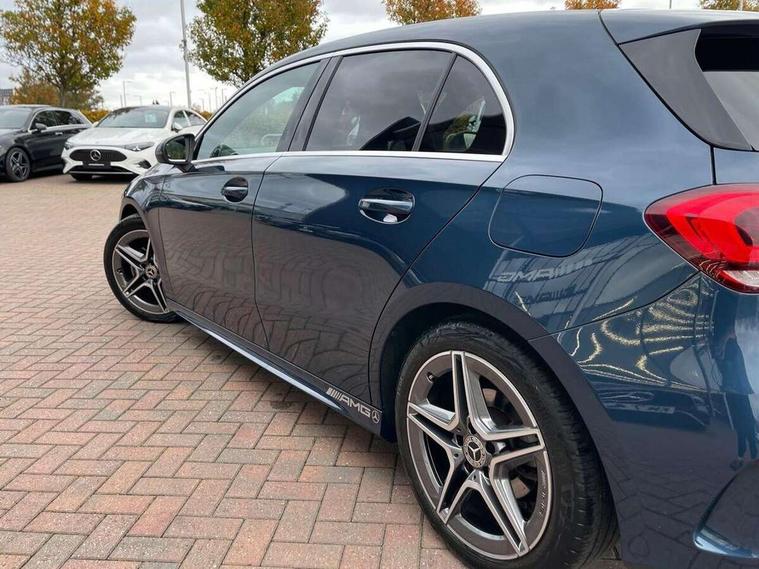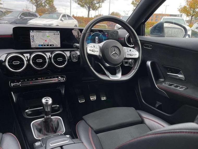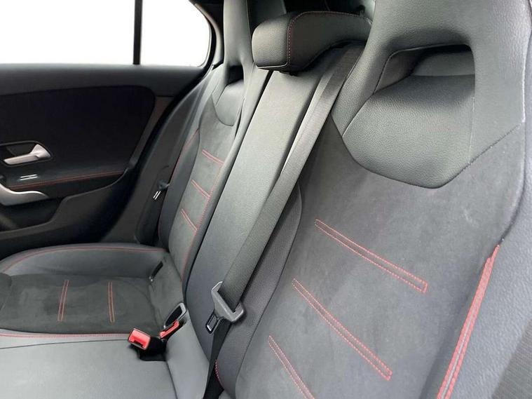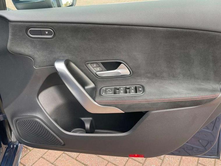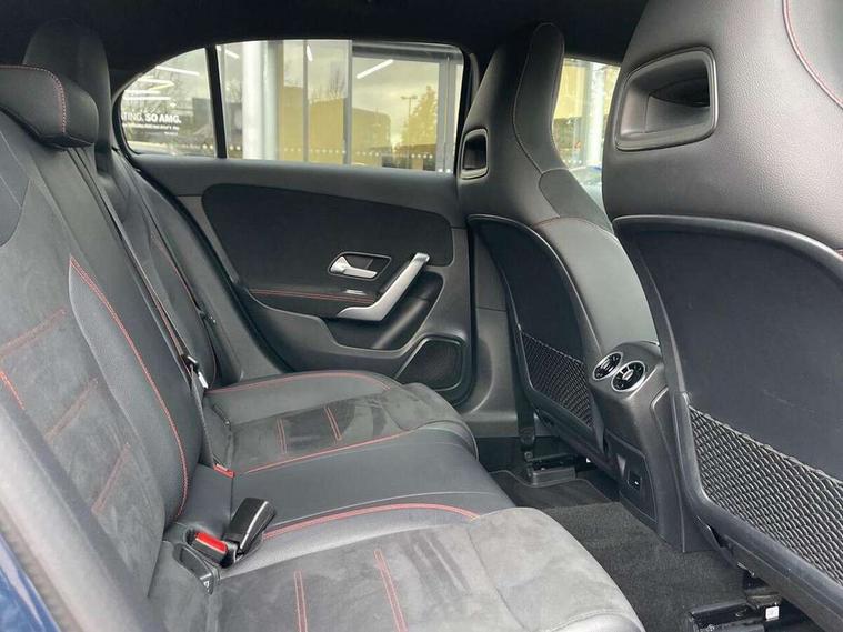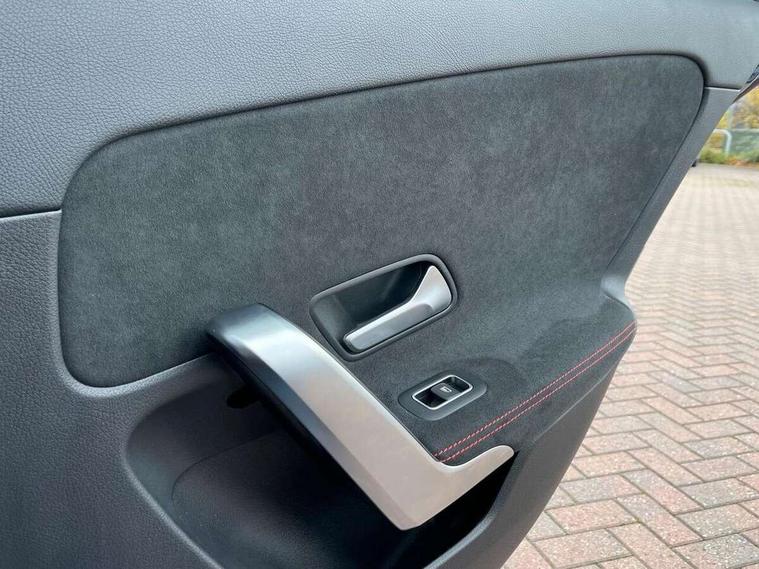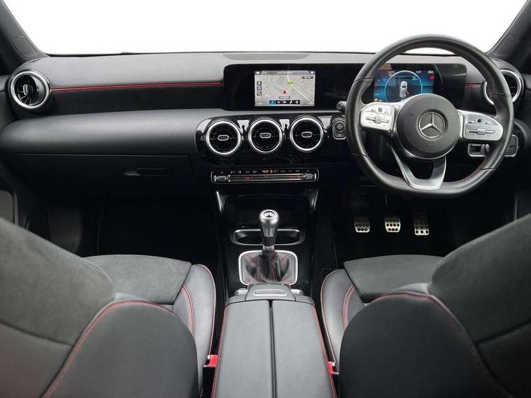 180 degree rear view camera with parking guidelines, 7" colour screen in instrument panel, 7" touchscreen media display, Attention assist, Brake pad wear indicator warning light, Car wash mode, Cruise control + speed limiter, Direct steering, Dual bluetooth interfaces, DYNAMIC SELECT with a choice of driving modes (ECO, Comfort, Sport and Individual), ECO start/stop function, Fluid level warning indicator for fuel, oil, coolant and washer fluid, Hard-disk navigation, Hey Mercedes Voice activation, Lamp failure indicator, Mercedes me connect including emergency call system, accident recovery, breakdown and maintenance management, Mercedes me remote services, Outside temperature gauge, Owners manual in English, Pre-installation for private car sharing, Preinstallation for Mercedes Benz link, Service indicator (ASSYST), Speed sensitive power steering, Trip computer, Lowered comfort suspension, Rear axle torsion beam, 2 USB ports (type C) in rear stowage compartment and one in front of center console, 6 speakers, DAB Digital radio, MBUX multimedia system with DAB digital radio and touchpad including satellite navigation, Mercedes-Benz sound system - 100W, 4 Electric Front and Rear windows, Adaptive brake lights, AMG bodystyling - Front apron with splitter in chrome, rear apron with chrome trim and chrome visible trim elements in tailpipe, Black weather strip, Body colour bumpers, Body colour door handles, Body colour side skirt, Body coloured door mirrors, Chrome beltline trim, Diamond radiator grille with chrome pins and silver louvre + chrome insert, Electric adjustable and heated door mirrors with integrated LED side indicators, Exhaust system - Twin visible tailpipes in polished stainless steel, Headlamp assist automatic headlamp activation, Heated glass rear windscreen + timer control, LED high performance headlamps with integrated LED daytime running lights, LED tail lamp, LED third brake light, Privacy glass, Radio aerial, Rain sensing windscreen wipers with two sensitivity settings, Rear fog lights, Rear wiper, Window line trim strip in chrome, 3 Spoke flat bottom leather multi function steering wheel with perforated leather in grip area, 40:20:40 split folding rear seats, Artico man-made leather/Microfibre Dinamica upholstery with red contrast stitching, Auto Mercedes-Benz child seat recognition sensor, Black air vents with surround in silver chrome, Black roof lining, Brushed stainless steel sports pedals with rubber studs, Controller on centre console with chrome surround, Floor mats with stitched edging and AMG lettering, Front centre armrest with storage compartment, Front door sills with Mercedes Benz lettering, Front seat backs luggage nets, Front seat cushion length adjustment, Heated front seats, Height/reach adjustable steering column, Interior mirror with reading lamps in black and frameless, Manual height adjustable front seats, Rear head restraints, Seat occupancy sensor for front passenger seat, Sports seats with integrated headrests, Sunvisors with illuminated vanity mirrors, Touchpad on center console, Twin front cupholders, Two zone thermotronic luxury automatic climate control, Light and sight pack - A Class, Seat comfort pack - A Class, 3 rear 3 point seatbelts, ABS with Brake Assist, Active bonnet, Active brake assist includes forward collision warning system with autonomous braking, Adaptive brake assist with hold function and hill start assist, Black seatbelts, Childproof locks manually operated for rear doors and electrically operated for rear power windows, Crash responsive emergency lighting, Driver and passenger head and side airbags, Drivers knee airbag, Dual stage driver/passenger airbags, Electronic parking brake, ESP curve dynamic assist, ESP with ASR, Front and rear seatbelt reminder, Front brake callipers with Mercedes Benz lettering, ISOFIX and top tether child seat fixing points in two outer rear seats, Tyre pressure monitoring system, Warning triangle and first aid kit, Window airbags, Alarm system/interior protection/immobiliser, Keyless Go, Remote central locking and crash sensor with emergency opening function, Urban guard vehicle protection system with immobiliser and interior protection, Dinamica microfibre trim in black, 18" AMG 5 twin spoke light alloy wheels in titanium grey with highsheen finish, Summer tyres, Tirefit sealant kit,
