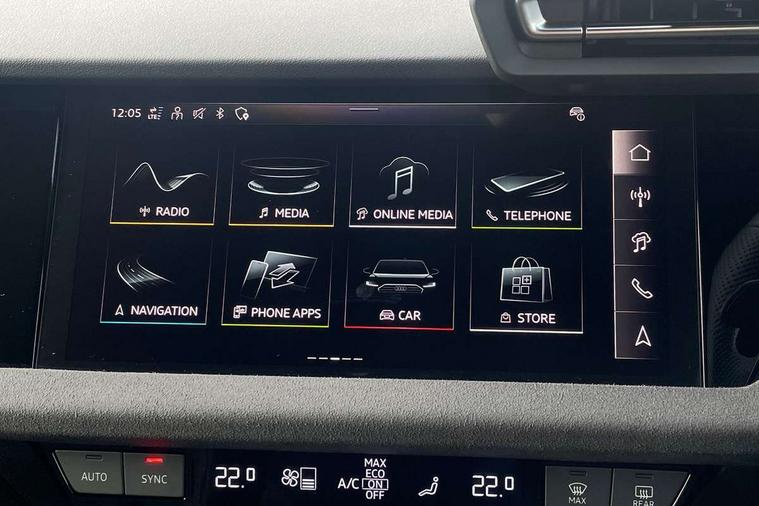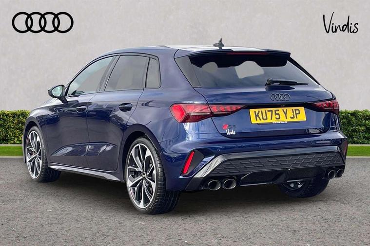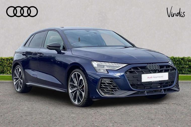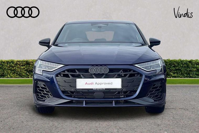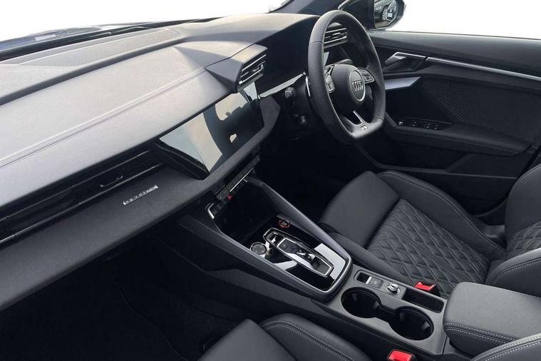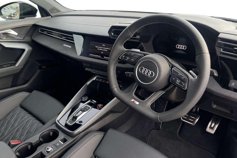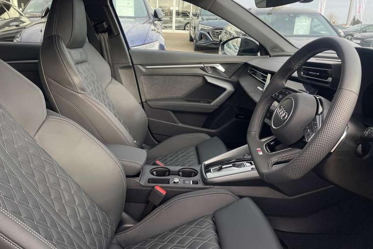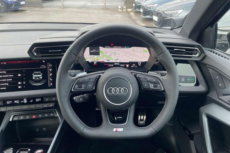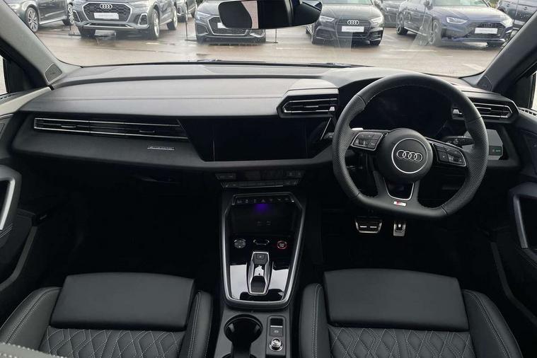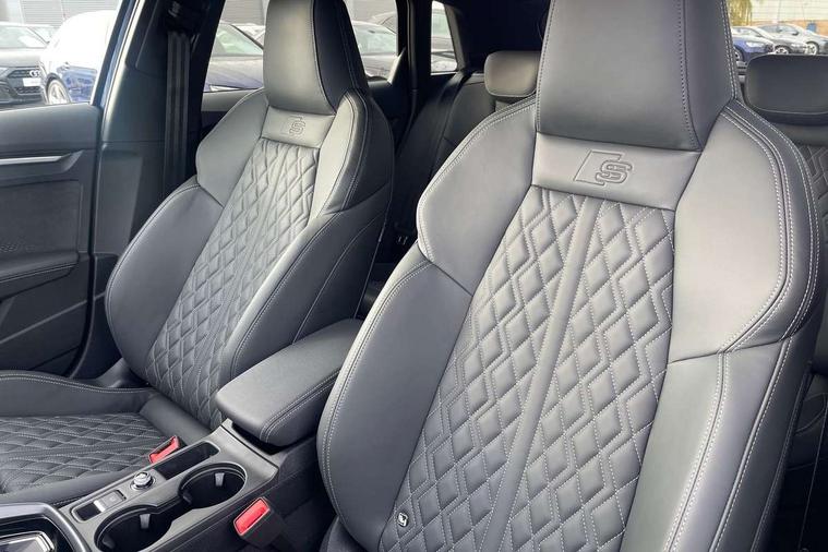 Adaptive cruise control (ACC), Adjustable speed limiter, Audi drive select (Auto, Comfort, Dynamic, Efficiency and Individual), Audi virtual cockpit plus - 12.3" full HD resolution dynamic digital instrument cluster, Automatic start/stop system with recuperation, Bluetooth interface, Camera based traffic sign recognition, Collision avoidance assistant, Driver attention and fatigue detection, e-Call (emergency call), Emergency assist, Intersection assist, Lane departure warning system, MMI Navigation Plus with high resolution 10.1" colour touch screen display, Park Assist with parking system Plus, Progressive steering, Reversing camera, Service indicator, Smartphone interface with app store includes wireless Apple carplay, Android auto and Amazon alexa integration, Trip computer, Voice control system with natural language interaction, quattro permanent all-wheel drive with torque splitter, S sport suspension with spring damper adjustment and lowering by 15mm, Audi Phonebox light with wireless charging, DAB Digital radio, USB ports with charging function in the rear, Anthracite grey Audi rings (front and rear), Audi Beam uses LEDs to project the rhombus S logo onto the ground as you exit your S3, Auto dimming frameless rear view mirror, Black accents front and rear bumpers including air inlets, Black accents in front grille and frame, Black accents in window trims, Electrically adjustable/heated/folding/auto dimming door mirrors with integrated LED indications + kerb view function for passenger side, Exterior model badging, Front and rear side air inlets in grained matt black with dark liquid chrome frame, Front electric windows, Front radiator grill in high gloss dark chrome, Heat insulating glass windscreen, Illuminated door sills with aluminium inserts at the front with S logo, LED 3rd brake light, Light and rain sensors, Privacy glass - dark tinted rear window, rear door and side windows, Rear diffuser and grill in grained matt black with inlay in dark liquid chrome, Rear electric windows, Rear side wing doors, Rear wiper, S grille, S3 front bumper with S specific air intake grilles, S3 roof spoiler, Side sill trim in dark liquid chrome, 12V socket and storage compartment in front centre console, 3 seat bench in 2nd row, 3 spoke flat bottomed leather multifunction sport steering wheel with gear shift paddles, 3-zone deluxe automatic air conditioning, 4 way electrically adjustable lumbar support for driver and front passenger, 40/20/40 split folding rear seat bench, Black cloth headlining, Black front and rear floor mats, Fine Nappa leather upholstery with front sports seats S embossed logo, Front and rear centre armrest in artificial leather with contrasting stitching on armrests and instrument panel, Front and rear headrests, Heated front seats, Height and reach adjustable steering wheel, i-Size child seat mounting on the front passenger side and outer rear seats, i-Size and top tether on the outer rear seats, Manual boot compartment lid, Manually adjustable front seats, Rear centre armrest with cupholder, S badging on the steering wheel, Seat side bolsters, Single front passenger seat, Stainless steel pedals and front footrest in black, Aluminium interior elements pack - A3, Storage package - A3, Technology pack with Matrix LED headlights - A3, 3x3 point rear seat belts, Driver and front passenger airbag with passenger airbag deactivation, Electronic Stabilisation Control (ESC) including ABS, ASR and EDL, First aid kit with warning triangle and 2 safety vests, Front side airbags with head airbags and interaction airbag, Hill hold assist, Pre-sense front with pedestrian and cyclist detection, Seatbelt monitoring, Tyre pressure loss indicator, Anti theft alarm, Anti-theft wheel bolts, Electronically operated child locks, Immobiliser, Black dashboard, Tyre repair kit,