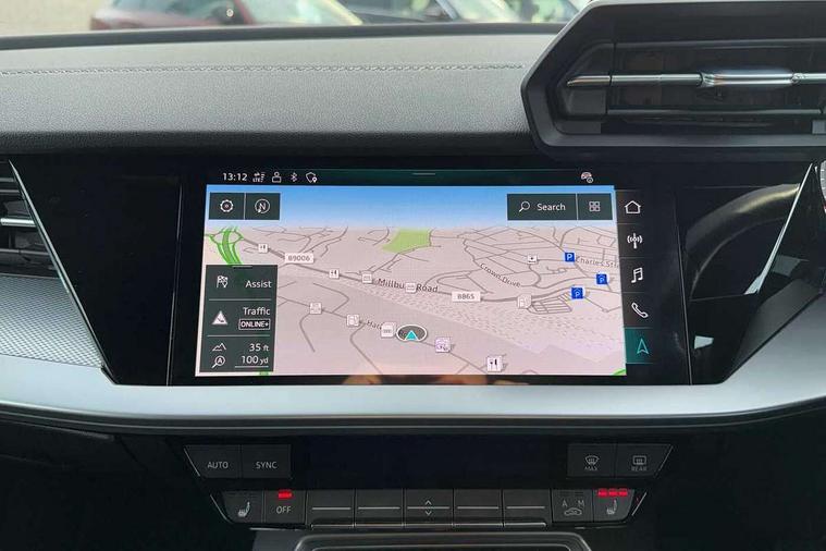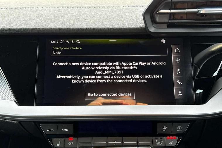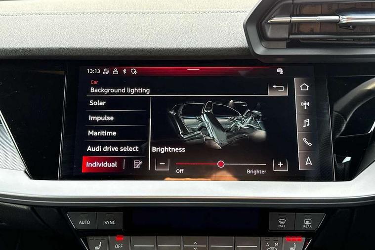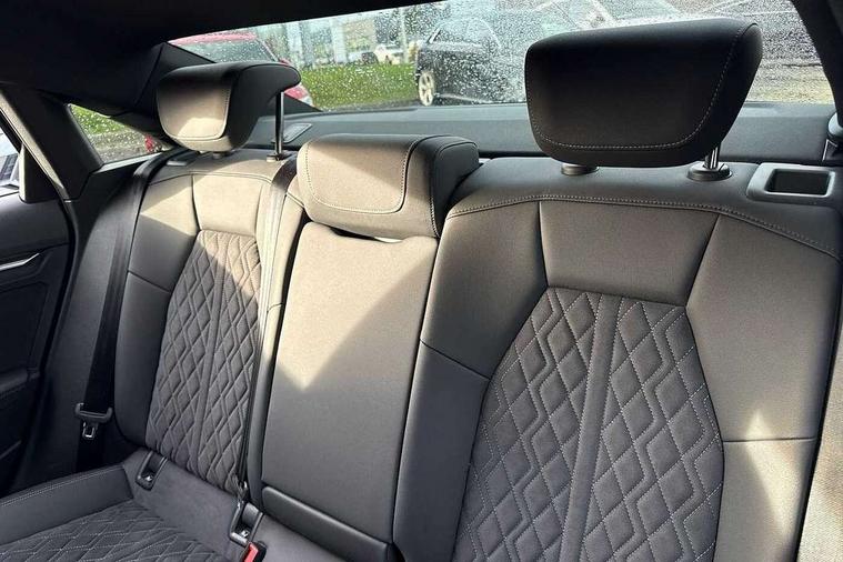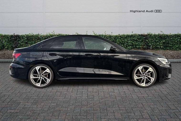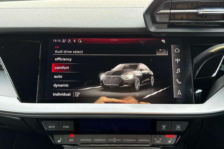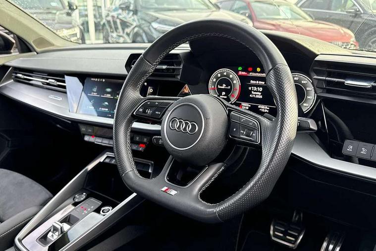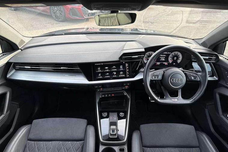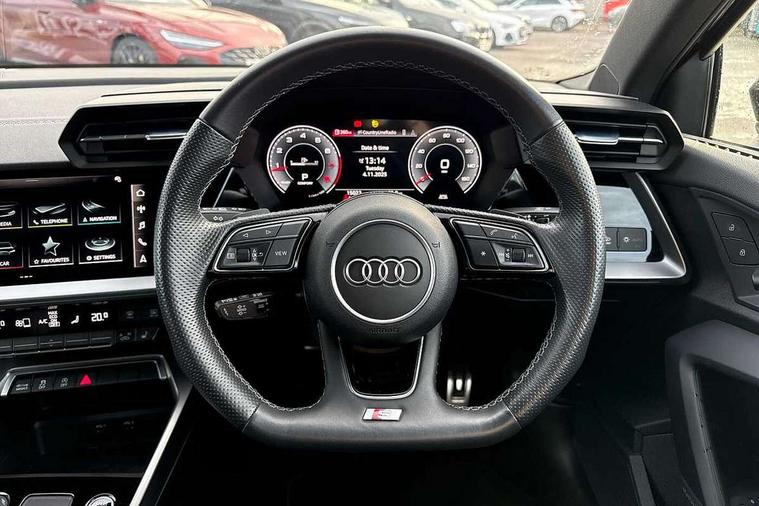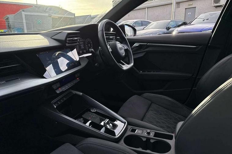 Audi connect emergency call and service, Audi drive select (Auto, Comfort, Dynamic, Efficiency and Individual), Audi smartphone interface, Audi virtual cockpit plus - 12.3" dynamic digital instrument cluster, Automatic start/stop system with recuperation, Bluetooth interface, Collision avoidance assistant, Electromechanical power speed sensitive steering, Lane departure warning system, MMI Navigation Plus with high resolution 10.1" colour touch screen display, Service indicator, Voice control system with natural language interaction, Sports suspension, 2x USB Type C ports (for charging and data transfer), 6 passive loudspeakers, CD player, DAB Digital radio, 3rd brake light, Acoustic glass windscreen, Audi matrix LED headlights, LED rear lights, dynamic front and rear indicators and headlight cleaning system, Auto dimming frameless rear view mirror, Electrically adj heated/folding + automatically dimming exterior mirrors + automatic kerb side function for passenger side exterior mirror, Front electric windows, Illuminated door sills with aluminium inserts at the front with S logo, Integrated LED indicators in door mirrors, LED daytime running lights, Light and rain sensors, Model and engine designation badges at rear, Privacy glass - dark tinted rear window, rear door and side windows, Rear boot, Rear electric windows, Rear side wing doors, S roof spoiler, 12V socket and storage compartment in front centre console, 3 seat bench in 2nd row, 4 way electrically adjustable lumbar support for driver and front passenger, 40/20/40 split folding rear seat bench with cupholder, Black cloth headlining, Dual zone electronic climate control, Electrically adjustable front seats, Front and rear centre armrest in leather, Front and rear headrests, Front/rear floor mats, Heated front seats, Height and reach adjustable steering wheel, Illuminated vanity mirror, Interior lighting - glove compartment light and right hand side, Luggage compartment floor covering, Single front passenger seat, Stainless steel pedals and front footrest in black, Aluminium interior elements pack - A3 Saloon, Dinamica microfibre/mono.pur 550 artificial leather pack - A3 Saloon, Extended ambient lighting pack - A3/S3 Saloon, LED interior lighting pack - A3 Saloon, 3x3 point rear seat belts, Driver and front passenger airbag with passenger airbag deactivation, Electronic Stabilisation Control (ESC) including ABS, ASR and EDL, First aid kit with warning triangle and 2 safety vests, Front side airbags with head airbags and interaction airbag, Hill hold assist, Pre-sense front with pedestrian and cyclist detection, Seatbelt monitoring, Tyre pressure loss indicator, Anti theft alarm, Anti-theft wheel bolts, Electronically operated child locks, Immobiliser, Remote control central locking, Aluminium air vent surrounds, Aluminium trim elements, Dark spectrum aluminium inlays, accent surfaces in the dashboard and centre console in platinum grey silk effect paint finish, 19" 5 arm trapezoid design alloy wheels in titanium matt grey with diamond cut finish,