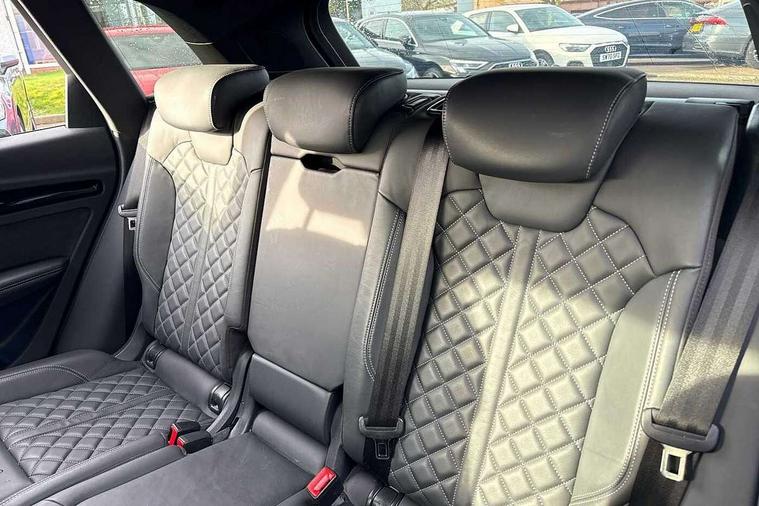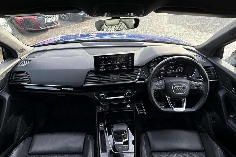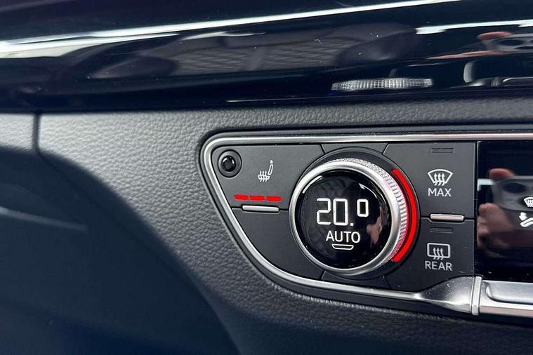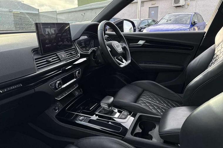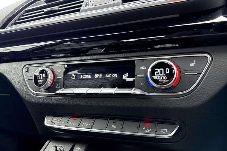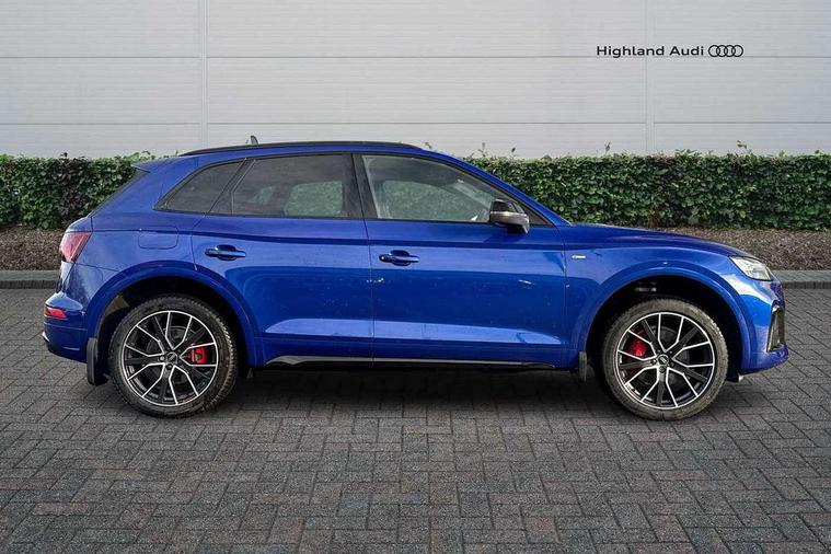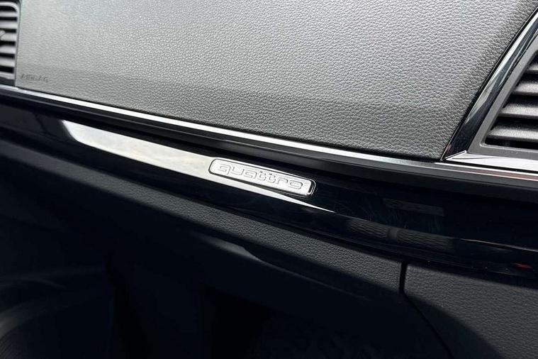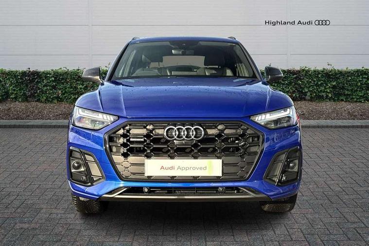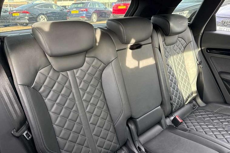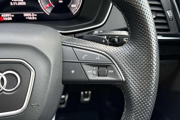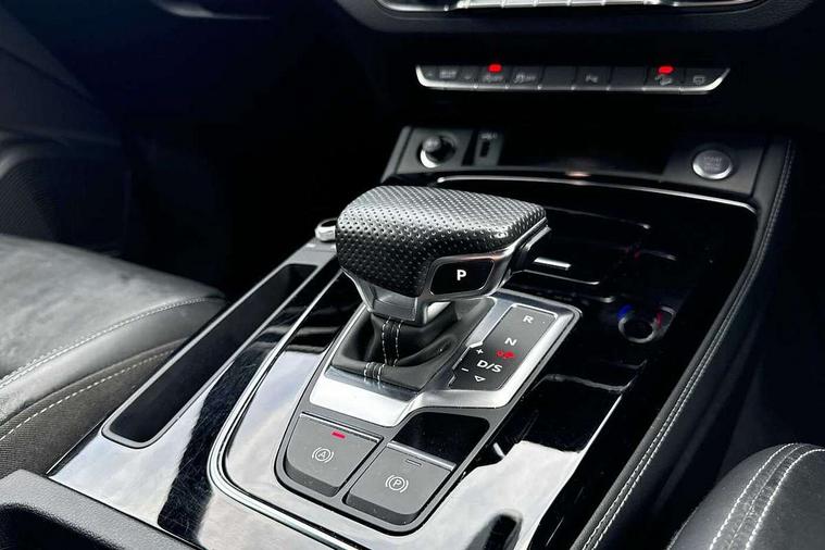 Audi connect safety and service (e-call), Audi connect with Amazon Alexa Integration, Audi drive select, Audi virtual cockpit plus with 12.3" screen and three different layout designs, Audi wireless smartphone interface, Automatic start-stop system with coasting functionality and efficiency programme, Bluetooth interface, Electro - mechanical power assisted steering, MMI navigation plus with 10.1" touch screen, Power tailgate, Reversing camera, Service interval indicator, Voice control system with Audi hotword activation "Hey Audi", Diesel particulate filter, Quattro on demand, S line sports suspension, 2 x USB charging port with aux input socket, DAB Digital radio, Acoustic windscreen, Audi matrix LED headlights with dynamic front and rear indicators, Audi rings at front and rear in black, Audi rings decal on rear doors, Auto dimming door mirrors, Auto dimming rear view mirror, Automatic headlights and windscreen wipers, Black door mirrors, Black roof rails, Body colour bumpers, Body colour underbody protection, Chrome plated exhaust trims, Daytime running lights, Door sills in Selenite silver, Electric adjustable/heated/folding door mirrors, Front air inlet surrounds in titanium black, Front and rear electric windows, Headlight washers, High gloss black B pillar trims and triangular rear door trim, High level LED brake light, Rear chrome trim strip below lights, Rear privacy glass and rear side windows, Rear side wing doors, Rear wiper, Roof bars, S Line rear spoiler, 3 rear headrests, 4 way electric lumbar support for driver and front passenger, 40:20:40 split folding 3 rear bench seat in 2nd row with rear centre armrest, Black cloth headlining, Comfort front centre armrest, Contrast stitching on seats, steering wheel and gear lever gaiter, Deluxe 3 zone electronic climate control, Electrically adjustable front seats, Fine Nappa leather upholstery with diamond pattern contrast stitching + front sport seats with S embossed logo, Front/rear floor mats, Gear lever in black leather, Heated front seats, Height adjustable front head restraints, Height/reach adjustable steering column, Illuminated door sill trims with S logo, ISOFIX child seat mounting and top tether, Rear seat bench plus, Removable luggage compartment floor, Single front passenger seat, Stainless steel pedals, Sunvisors with vanity mirrors, Black styling package - Q5 Edition 1, Extended interior upholstery pack - Q5, Extended LED Interior multi coloured Lighting Pack - Q5, 3 point seatbelts on all seats, 6 airbags - Driver, front passenger, curtain and side airbags, Electrically operated child locks on rear doors, Electromechanical parking brake, Electronic stabilisation control including ABS, ASR and EDL, Front and rear brake calipers painted in red, Front passenger airbag deactivation, Hill descent control, Hill hold assist, Multi collision brake assist, Pop-up bonnet for pedestrian protection, Pre sense city, Seat belt force limiter, Seatbelt monitoring, Tyre pressure warning, Warning triangle and first aid kit, Anti theft alarm, Anti-theft wheel bolts, Keyless Go access/ignition system, Remote central locking, Piano black finish inlay,