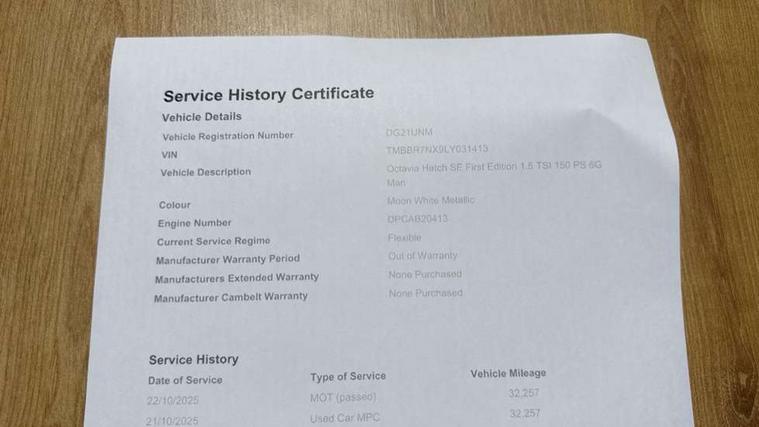 1x USB Type C port in rear view mirror (charging only), 2x USB Type C ports (for charging and data transfer), 2x USB Type C ports in rear of front centre armrest (charging only), Bluetooth system, Electro-mechanical power steering, Front assist system, Lane assist, Rear parking sensors with manoeuvre assist, Smartlink (includes android auto and mirrorlink), Speed limiter, Virtual Cockpit - 10.25" digital display, Wireless SmartLink for Apple Car Play, 8 speakers, DAB Digital radio, Swing radio with 8.25" touchscreen, Aero front windscreen wipers with intermittent function, Auto dimming rear view mirror, Black window surrounds, Body colour door mirrors and handles, Chrome grille surround, Electric front and rear windows, Electrically adjustable and heated door mirrors, Heated rear windscreen, High level third brake light, Ice scraper in fuel cap, Rain and light sensors, Rear fog light on one side, 3 rear headrests, 4 foldable roof handles, Chrome inner door handles, Climatronic dual-zone electronic air conditioning, Cloth upholstery, Front centre armrest, Front head restraints, Height adjustable driver and passenger seat with lumbar support, Illuminated air conditioned glovebox, Leather trimmed gearshift lever, Luggage compartment lighting x1 light, Parcel shelf - folding, Satin black textured with artificial stiching in dash board pads, Sun visors with mirrors, Sunglasses storage, Ticket holder, Two-spoke leather multi function steering wheel, Umbrella in door panel, Unsplit rear bench seat and split folding backrest, 3 point front/outer rear seatbelts+pre-tensioners, Alarm with interior monitoring, tilt sensor and back up horn, Automatic door unlocking in case of crash, Automatic fuel cut off in case of crash, Automatic warning lights in case of emergency braking, Drivers knee airbag, Electronic parking brake, Emergency call and proactive services, ESC including ABS, EBV, MSR, ASR, EDS, HBA, DSR, Head and curtain airbags, Hill hold control, Hill start assist, ISOFIX on front passenger seat and outer rear seats, Passenger airbag deactivate switch, Rear disc brakes, Two tone horn, Tyre pressure monitor, Visual and acoustic seat belt reminder, Warning reflectors in front door, Door locks with immobiliser, Keyless start/stop, Remote central locking, Aluminium decorative inserts,
