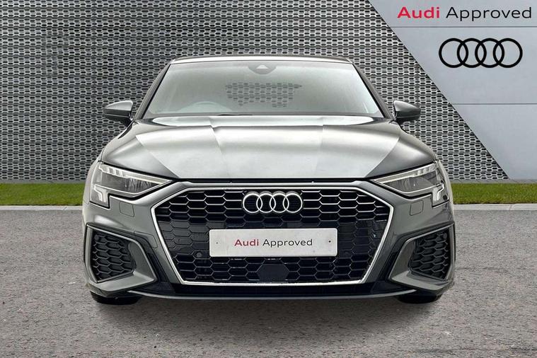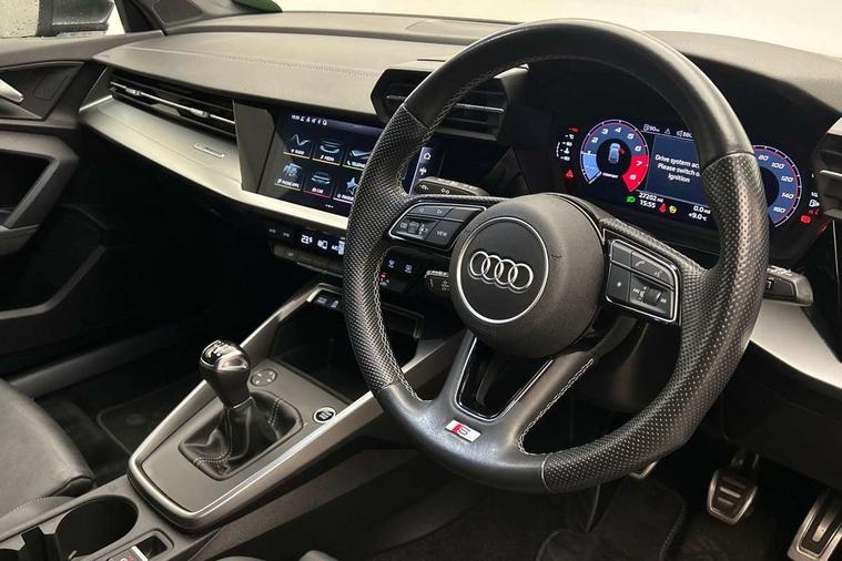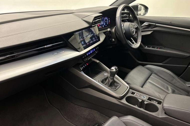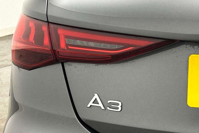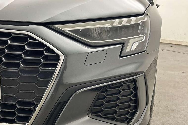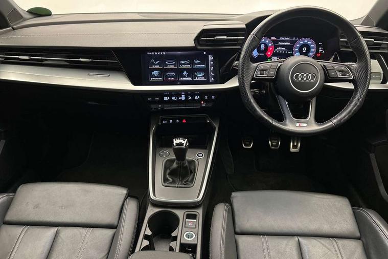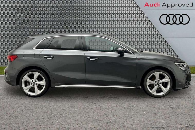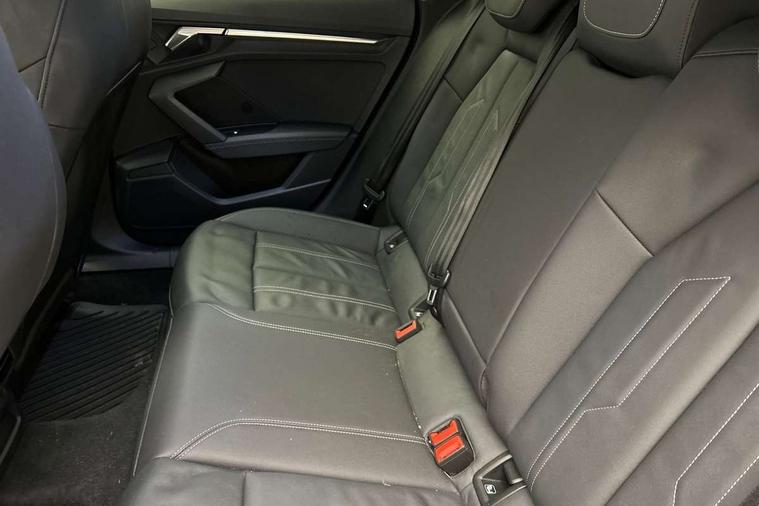 Audi drive select (Auto, Comfort, Dynamic, Efficiency and Individual), Audi smartphone interface, Audi Virtual Cockpit - 10.25" digital and colour instrument cluster, Automatic start/stop system with recuperation, Bluetooth interface, Collision avoidance assistant, Cruise control, e-Call (emergency call), Electromechanical power speed sensitive steering, Lane departure warning system, MMI Navigation Plus with high resolution 10.1" colour touch screen display, Rear parking sensors, Service indicator, Trip computer, Voice control system with natural language interaction, 2xUSB-C connection with data and charging functions, 6 passive loudspeakers, DAB Digital radio, 3rd brake light, Acoustic glass windscreen, Aluminium window trim, Auto dimming frameless rear view mirror, Electrically adjustable/heated/folding/auto dimming door mirrors with integrated LED indications + kerb view function for passenger side, Front electric windows, Illuminated aluminium inserts front door sills with S logo, LED daytime running lights, LED headlights with LED rear lights and dynamic rear indicators, Light and rain sensors, Privacy glass - dark tinted rear window, rear door and side windows, Rear electric windows, Rear side air outlets in grained matt black, Rear side wing doors, Rear wiper, S line bumpers, S roof spoiler, 12V socket and storage compartment in front centre console, 3 seat bench in 2nd row, 40/20/40 split folding rear seat bench with cupholder, Black cloth headlining, Dual zone electronic climate control, Front and rear centre armrest in leather, Front and rear headrests, Front/rear floor mats, Height and reach adjustable steering wheel, Illuminated vanity mirror, Interior lighting - glove compartment light and right hand side, Luggage compartment floor covering, Manual boot compartment lid, Manually adjustable front seats, Seat side bolsters, Single front passenger seat, Stainless steel pedals and front footrest in black, Twin leather upholstery with front sports seats S embossed logo, Aluminium interior elements pack - A3 Sportback, S line styling pack - A3 Sportback, 3x3 point rear seat belts, Audi pre sense front, Driver and front passenger airbag with passenger airbag deactivation, Electronic Stabilisation Control (ESC) including ABS, ASR and EDL, First aid kit with warning triangle and 2 safety vests, Front side airbags with head airbags and interaction airbag, Pre-sense front with pedestrian and cyclist detection, Seatbelt monitoring, Tyre pressure loss indicator, Anti theft alarm, Anti-theft wheel bolts, Immobiliser, Manual child locks, Remote control central locking, Accent surfaces in the dashboard and centre console in platinum grey silk effect paint finish, Dark spectrum aluminium inlays,