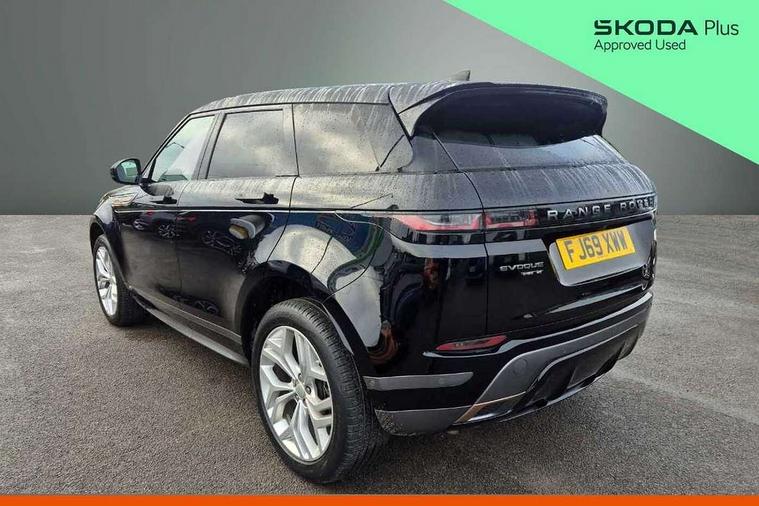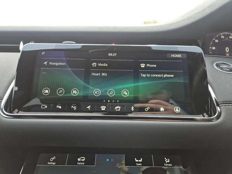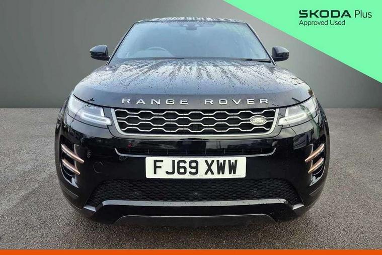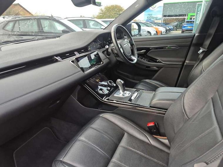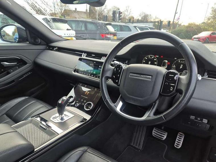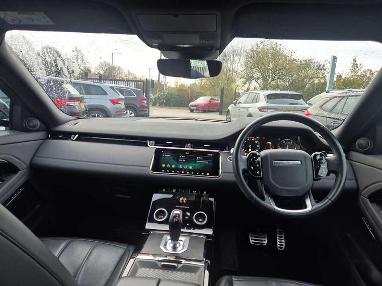360 degree parking aid, Android Auto, Apple car play, Bluetooth connectivity, Brake pad wear indicator warning light, Clear exit monitor, Driver condition monitor, Duo touch pro, Electronic power assisted steering (EPAS), InControl remote, Interactive Driver display instrument cluster, Land Rover InControl apps, Lane keep assist, Navigation pro system, Park assist - Parallel, perpendicular and parking exit, Pro services and wifi hotspot, Push button starter, Rear traffic monitor, Smart settings, Traffic sign recognition with adaptive speed limiter, Voice control system, All terrain progress control, Efficient Driveline, Passive suspension, Terrain Response 2 Auto, Digital Audio Broadcast radio-DAB, Steering wheel mounted controls, Automatic headlight levelling, Electric windows with one touch open/close and anti trap, Evoque and R-Dynamic badge, Flush deployable exterior door handles, Heated rear window with timer, Heated washer jets, Heated windscreen, Power fold, auto-dimming, heated door mirrors with memory and approach lights, Rain sensing windscreen wipers, Rear fog lights, Shadow atlas bonnet and tailgate script, Tailgate spoiler, 40:20:40 split folding rear seats, Black gearshift paddles, Bright metal pedals, Isofix system on outer rear seats, Overhead lighting console, Overhead stowage for sunglasses, Passive front head restraints, Rear air vents, Rear centre headrest, Sunvisors with illuminated vanity mirrors, Twin front cupholders with cover, Twin sliding front centre armrest, Two zone climate control, Anti-lock braking system (ABS), Customer configurable autolock, DSC - Dynamic Stability Control, Electronic brake force distribution, Electronic parking brake, Electronic traction control, Front and rear seatbelt reminder, Hill descent control, Hill launch assist, Low traction launch, Power operated child locks, Roll stability control, Six airbags - Driver and passenger airbags/driver knee airbag/front side airbag and curtain airbags, Torque vectoring brake, Tyre pressure monitoring system, Alarm, Immobiliser, Intrusion sensor, Locking wheel nuts,