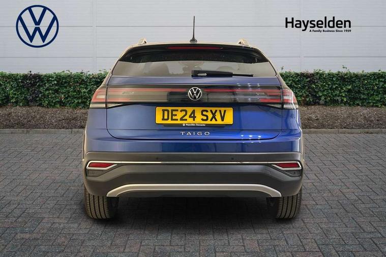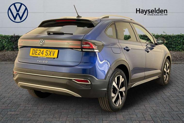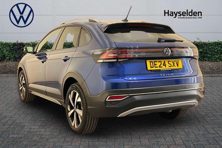 Advanced driver attention and drowsiness monitor, App-Connect including App-Connect Wireless, Digital cockpit pro - 10.25" high resolution TFT dash display screen with customizable menus and information, e-Call (emergency call), Power Steering, Travel assist including emergency assist, Washer fluid level indicator, Wireless Charging including Bluetooth, Rear shock absorption, Start-stop system with battery regeneration (recuperation - energy recovery during braking), Digital radio reception (DAB+), Diversity antenna for FM reception, WeConnect plus, Ambient lighting with logo projection, Aspherical driver's exterior mirror, Auto headlights, Body coloured bumpers and radiator grille with chrome trim and front fog lamps with chrome bezel, Dual chrome twin tailpipes on left and right, Electric windows, External USB type C socket and charging sockets, LED rear combination lamp, LED third brake light, Left convex exterior mirror, Power folding adjustable/heated exterior mirrors and front passenger exterior mirror lowering function, Rear fog light on one side, reversing light on both sides, Rear side wing doors, Rear wash/wipe with intermittent wipe setting, 12V socket in centre console, 2 front reading lights, 3 rear head restraints, 3 seat bench in 2nd row, Air care climatronic air conditoning system with active combination filter and 2-zone temperature control, Black carpets, Child seat anchor for child seat system i-Size, 2x top tether and child seat anchor in front on front passenger side, Chrome bezel for instrument cluster, vents, door handles + gear shift, Driver and front passenger seat height adjustment, Front + rear carpet mats, Front centre armrest, Front footwell illumination, Front sports comfort seats, Height and reach adjustable steering wheel, Interior ambient lighting and surround lighting, Leather trimmed gear knob, Leather wrapped multifunction steering wheel, Luggage compartment floor, Luggage compartment light, Lumbar support for driver's and front passengers seat, Single front passenger seat, Split folding backrest with centre armrest and unsplit rear seat bench, Storage compartment under front seats, Sun visors with illuminated vanity mirrors, Chrome Package - Taigo, Drivers assistance pack - Taigo, IQ.LIGHT - LED matrix headlights pack - Taigo, Light and sight pack - Taigo, 2 x 3-point seatbelts/outer rear seats with ECE label, 3-point seat belts in front with pretensioner and height adjustment, 3-point seatbelt for centre rear seat, Adaptive driver and front passenger airbags with passenger airbag deactivation function, Driver and front passenger safety-optimised head restraints, Electronic stability control, Extended and predictive pedestrian/ cyclist protection, Front and rear disc brakes, Front curtain and side airbags with center airbag, Hill start assist, Manual rear child locks, Single tone horn, Tyre pressure loss indicator, Anti-theft alarm system with interior monitoring, backup horn, and towing protection, Anti-theft wheel bolts, Low rolling resistance tyres,