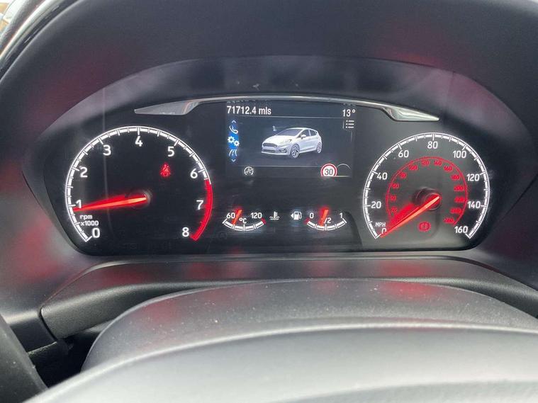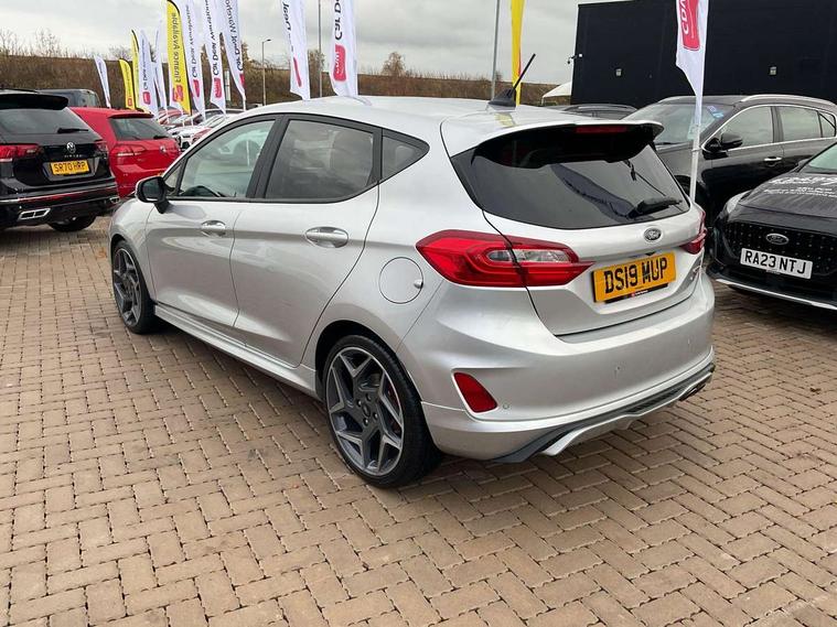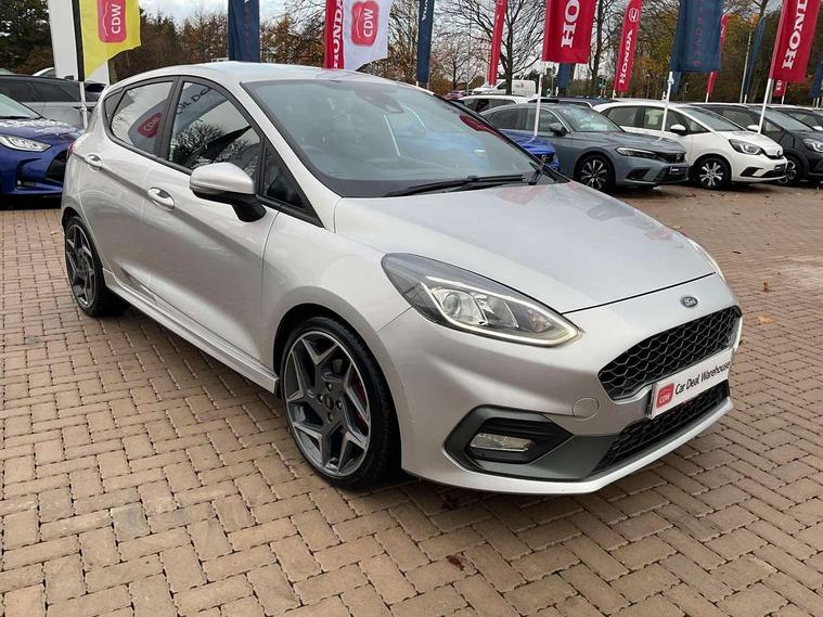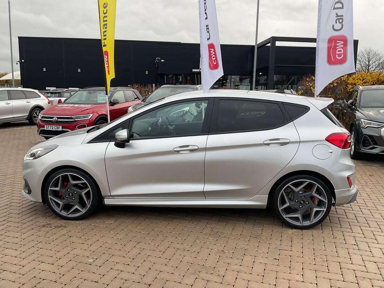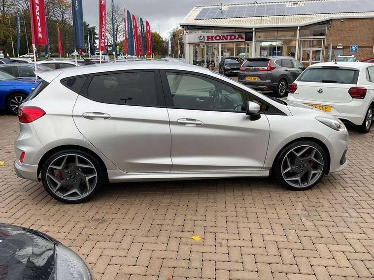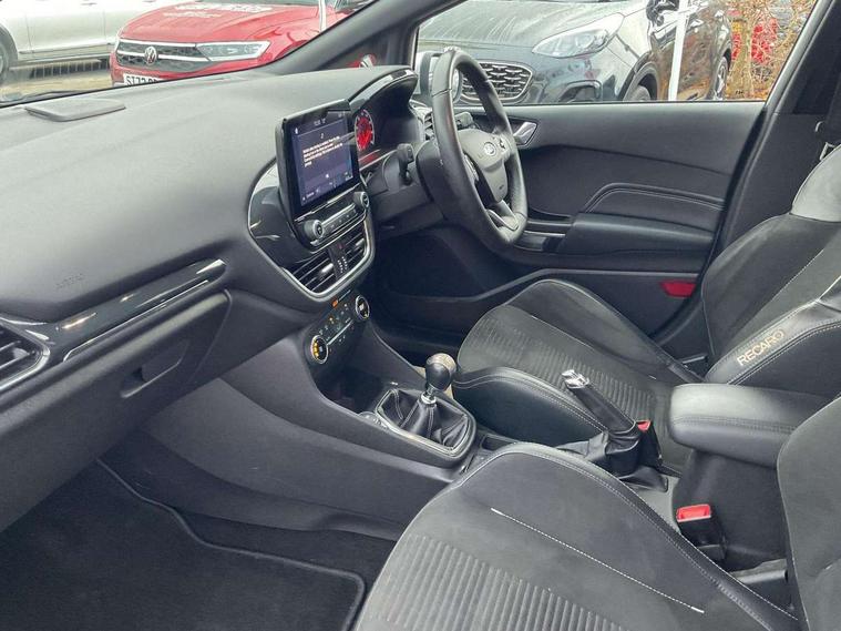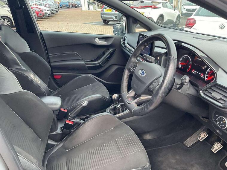 Bluetooth system, Cruise control, Drive mode selector, Electric power steering, Ford easy fuel, Trip computer, Sports suspension, 2 USB ports, Auxiliary input socket, DAB Digital radio, Steering wheel mounted controls, Auto dimming rear view mirror, Automatic headlights, Body colour bumpers, Body colour door handles, Body colour electric adjustable heated door mirrors with integral indicators, Body colour large rear spoiler, Chrome lower window surround, Cornering front fog lights, Electric front windows/one touch facility, Electric rear windows, LED Night signature to rear lights, LED rear lights, Power foldable door mirrors with puddle lights, Quickclear heated windscreen, Rain sensing wipers and auto dimming rear view mirror, Rear privacy glass, Rear wiper, Rugged body styling kit with active front wing badges, Tinted glass, Unique ST-Line upper grille & full bodystyling kit with ST-Line wing badges, 12V Accessory socket in centre console, 3 spoke flat bottomed leather steering wheel with red stitching, 60/40 split folding rear seat, Adjustable head restraints, Ambient lighting, Black headlining, Boot carpet, Centre console with armrest and illuminated cupholders, Chrome inner door handles, Drivers and Passenger lumbar support, EATC - Electronic Auto Temperature control, Floor mats with grey stitching, Footwell illumination, Front map reading lights, Front seat and rear pockets, Heated front seats, Heated steering wheel, Illuminated glovebox, Leather gear knob, Leather trimmed handbrake handle, Load area light, Overhead console with sunglasses holder, Pollen filter, Rake/reach adjustable steering wheel, Rear centre head restraint, Recaro part leather front sports seats, Recaro sports front seats, Sports pedals, Driver assistance pack - ST2/ST3/ST Performance Edition, NCAP Pack - Fiesta, Rear view camera pack - Fiesta, 3 point seatbelts on all rear seats, ABS+EBA, Curtain airbags, Driver and passenger airbags, Drivers knee airbag, Electronic stability control with hill start assist, Front passenger airbag deactivation, Front side airbags, Seatbelt warning, Tyre pressure monitoring system, Ford keyfree system with Keyless entry and keyless start, MyKey system, Remote central locking & engine immobiliser, Thatcham Cat.1 alarm, 18" Magnetic alloy wheels with machined finish and red brake calipers,