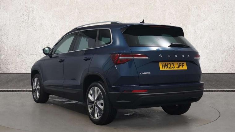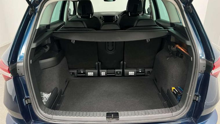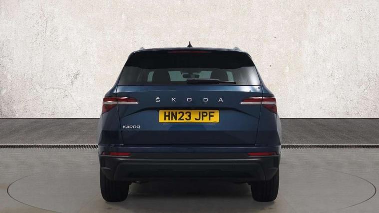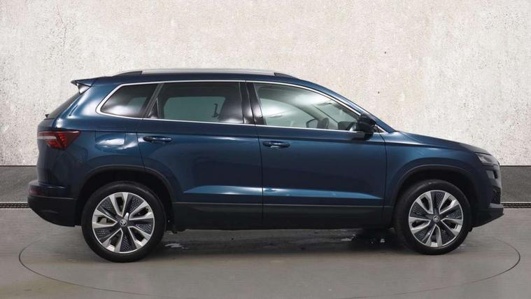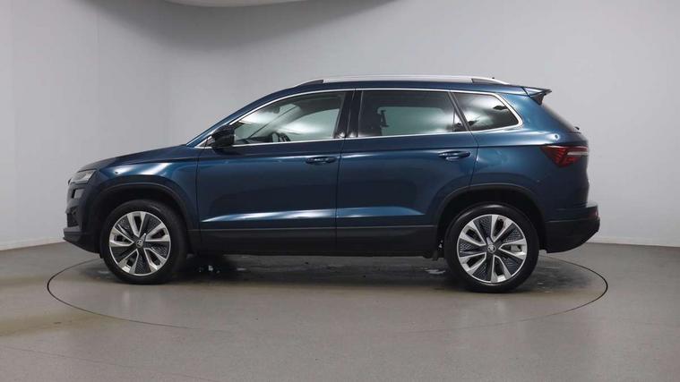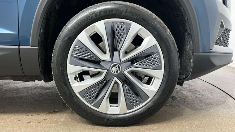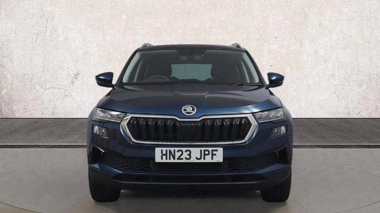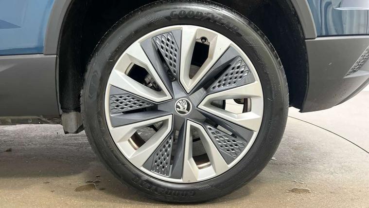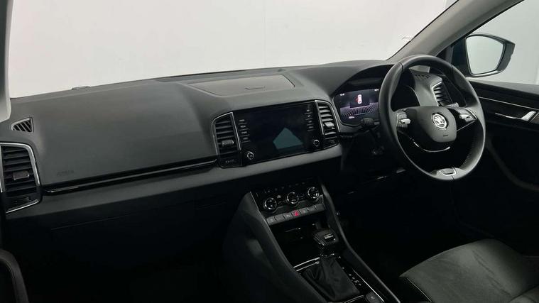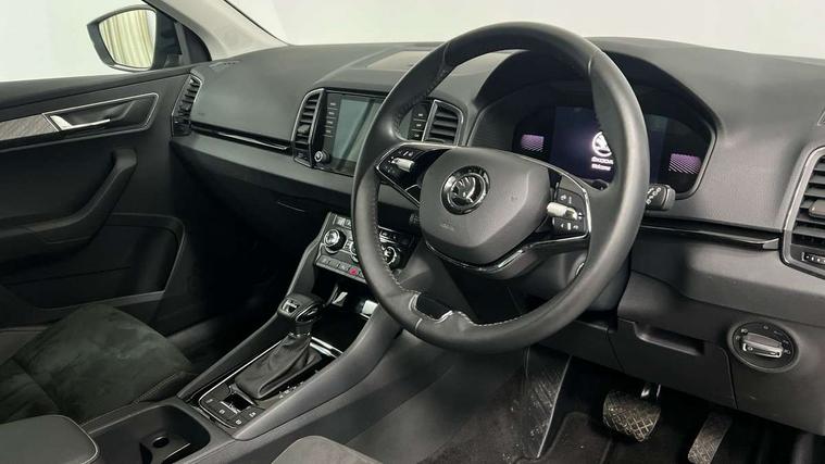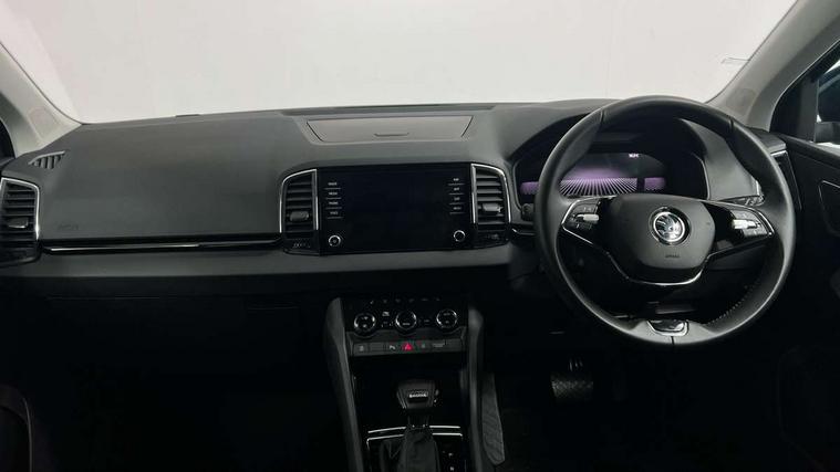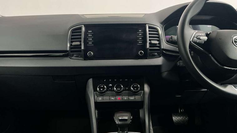 8" Digital display, Care connect, Driver fatigue sensor, Emergency services call system, Outside temperature gauge, Service interval indicator, SmartLink wireless for Apple and wired for Android, Start/stop system with regenerative braking, USB C Port x 2 in front centre console, 8 Speakers, DAB radio with Bluetooth, USB connection, Acoustic glass, Aero front windscreen wipers with intermittent function, Auto dimming rear view mirror with light and rain sensors, Black electric window control buttons, Body colour door mirrors and handles, Dynamic headlight range control with cornering light function, Electric front and rear windows with child proof lock, Heated rear windscreen, LED daytime running lights, LED rear lights with high functionality welcome effect and dynamic indicators, Light assistant (coming/leaving home/tunnel light), Plastic scuff plates, Privacy glass, Rear side wing doors, Rear spoiler, Rear window wiper with washer system and intermittent control, Safety reflectors on front doors, 1.5 litre bottle holders in driver and front passenger door panels, 12V socket in boot, 12v socket in front centre armrest with storage compartment and rear air vents, 2 Folding hooks and nets in boot, 2 spoke leather heated multifunction steering wheel with DSG paddles, 2 x Tablet holder, 3 rear height adjustable headrests, 3 seat bench in 2nd row, 4 foldable roof handles with rear coat hooks, Black floor carpet, Chrome inner door handles, Decorative door sills with KAROQ badging, Double sided boot floor, Foldable hooks in the boot, Front head restraints, Height adjustable front three point seats belts with tensioners, Height/reach adjust steering wheel, Ice scraper, Illuminated glovebox, Illuminated luggage compartment, Isofix child seat preparation for front passenger seat, Isofix child seat preparation outer rear, Manual lumbar support for front seats, Pen holder, Pollen filter, Rear boot cover, Rear reading lights, Rubbish bin door, Safety vest holder, Single front passenger seat, Storage box in upper central dashboard closed, Sunvisors with illuminated vanity mirrors, Textile floor mats, Ticket holder, VarioFlex seats with standard rear seat release, Chrome roof rails + chrome pack - Karoq, Parking pack - Karoq, Automatic door unlocking in case of crash, Automatic fuel cut off in case of crash, Child locks on rear doors, Driver airbag, Electronic parking brake with auto hold function, Emergency rear braking signal, ESC including ABS, MSR, ASR, EDS, HBA, DSR, RBS, MKB and traction control, Front side airbags, Hill hold control, Knee airbags, Passenger airbag with switch-off function, Pedestrian monitor, Seatbelt reminder signalisation and pretensioner for all seats, Three point seatbelts rear, Two tone horn, Tyre pressure display, Tyre pressure monitor, Alarm with interior monitoring, back up horn and tilt sensor with safe function, Electronic engine immobiliser, Keyless entry and start/stop, Remote central locking with 2 remote folding keys, Chrome framed air vents, 18" Procyon silver alloy wheels with anthracite aero inserts, Anti-theft wheel bolts protection, Storage on wheel cover, Tool kit,