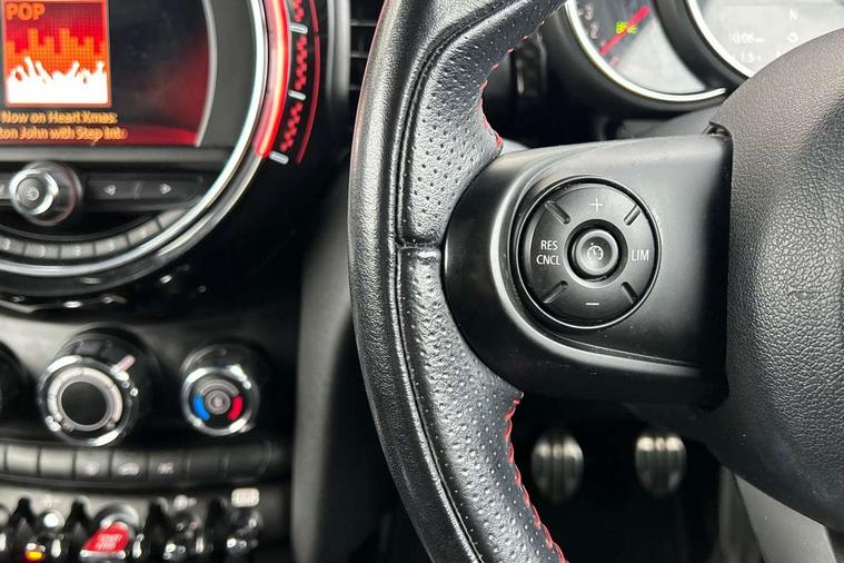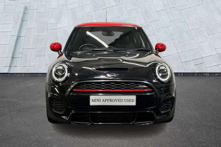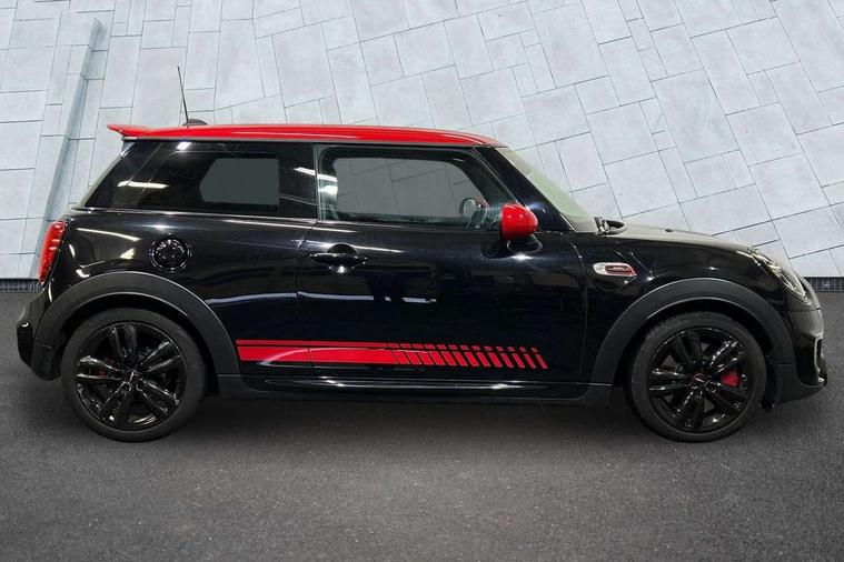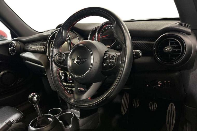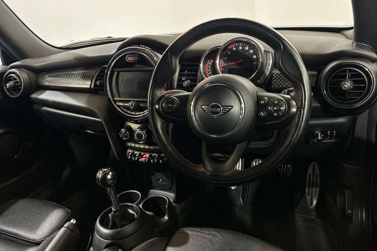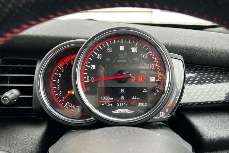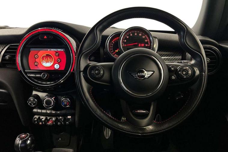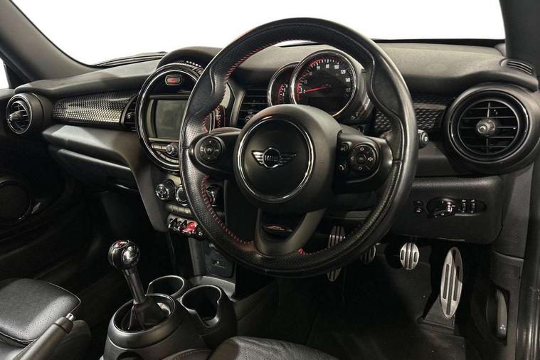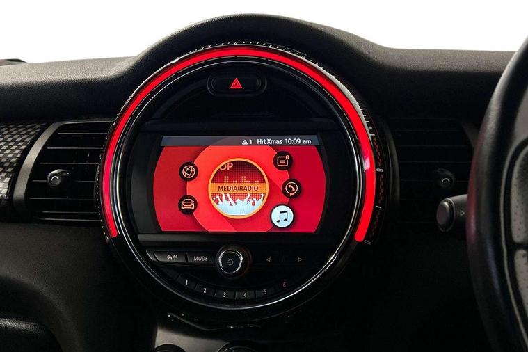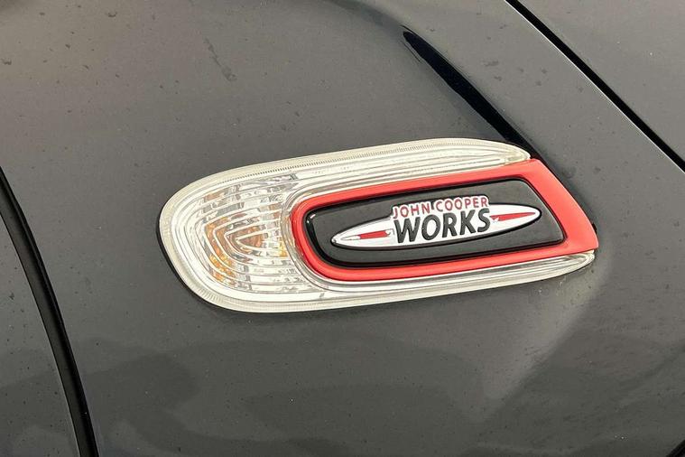 Acoustic seat-belt warning, Basic bluetooth function with USB audio, Brake fluid level warning light, Brake pad wear indicator warning light, DTC - Dynamic traction control, Exterior temperature gauge, Intelligent emergency call, MINI Driving Modes - centre toggle switch to control driving setting (sport, mid and green), MINI TeleServices, Oil level indicator, On board computer, Push button starter, Service interval indicator, Servotronic PAS, Electronic differential lock, Performance Control, Auxiliary input socket, DAB digital radio module, 2 speed wipers+intermittent wipe, Anti dazzle mirror, Anti trapping/one touch open close front windows, Body colour scoop integrated into engine- compartment lid, Body coloured bumpers, Chili red grille bar, Chrome bezels around rear lights and headlights, Chrome door handles, Chrome plated fuel cap, Chrome plated trim on bottom edge of window, Chrome strip on lower grille, Electric front windows, Electric rear windows, Electrically adjustable door mirrors, Extended wheel arches, Follow me home headlights, Green tinted heat insulating glass, Heated door mirrors/heated windscreen washers, Heated rear window with auto timer, High gloss black tailgate, Honeycomb radiator grille, John Cooper Works body kit, John Cooper Works roof spoiler, LED fog lights, LED rear lights, Metal look door sill finishers, Rear wiper, Side scuttles, Twin chromed exhaust pipes, White indicator lights, 2 rear head restraints, 4 boot load lashing points, 6 way manually adjustable passenger seat, 6-way manually adjustable driver's seat, Active carbon filter, Adjustable front seats backrest, Air recirculation system, Anthracite headlining, Auxiliary socket in centre console storage compartment, Centre console storage, Driver's seat height adjuster, Driver/passenger sunvisors, Easy entry seats, Front and rear cupholders, Front head restraints, Front passenger grab handle, Front seat backrest storage nets, Front sports seats, Gear/selector and handbrake in artificial leather, Internal chrome door handles, Isofix child seat preparation, Luggage compartment lighting, Multifunction steering wheel, Passenger seat height adjuster, Reach + rake adjustable steering column, Rear grab handles, Rear storage trays, Split folding rear seats, Stainless steel pedals with rubber inserts, Storage compartments in doors, Toolkit in luggage compartment, 3 point seatbelts, 3x3 point rear seatbelts, ABS/EBD, ASC+T, Brake calipers in red, Cornering brake control (CBC), Crash Sensor - activates hazard/interior lighting + unlocks doors, Driver and passenger airbags, Driver/front passenger side airbags, DSC - Dynamic Stability Control, Fuel cut off safety device, Head airbags, Hill start assist, Passenger airbag deactivation system, Seatbelt pretensioners, Tyre pressure warning, Ventilated front disc brakes, Drive away door locking, Locking wheel bolts, Remote central locking/doors+fuel cap+tailgate, Second remote key, Thatcham category 1 alarm + immobiliser,
