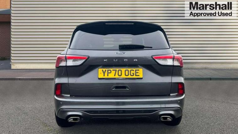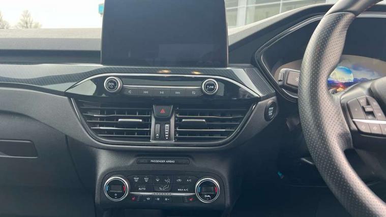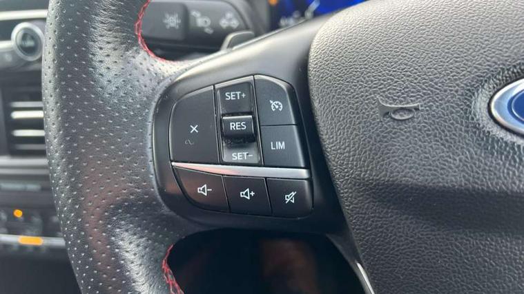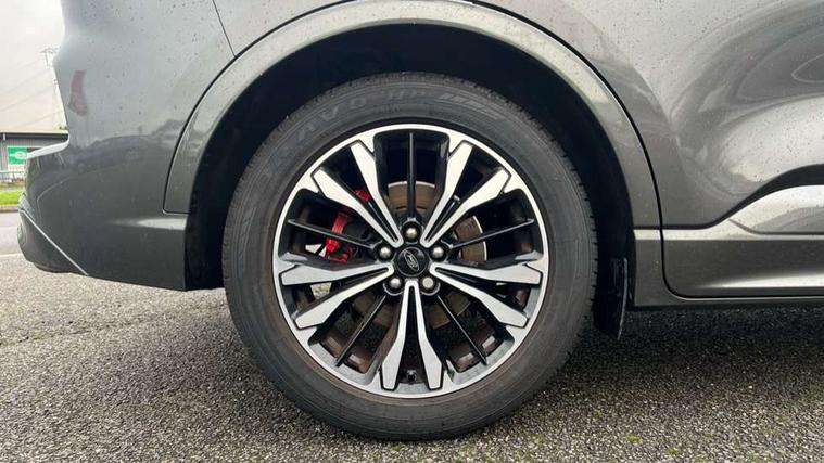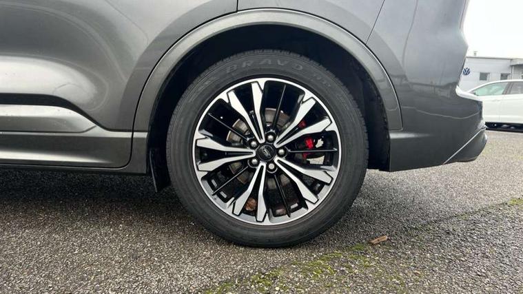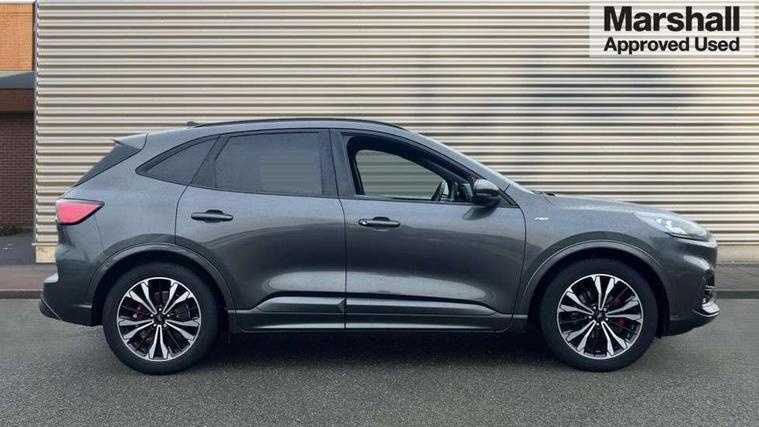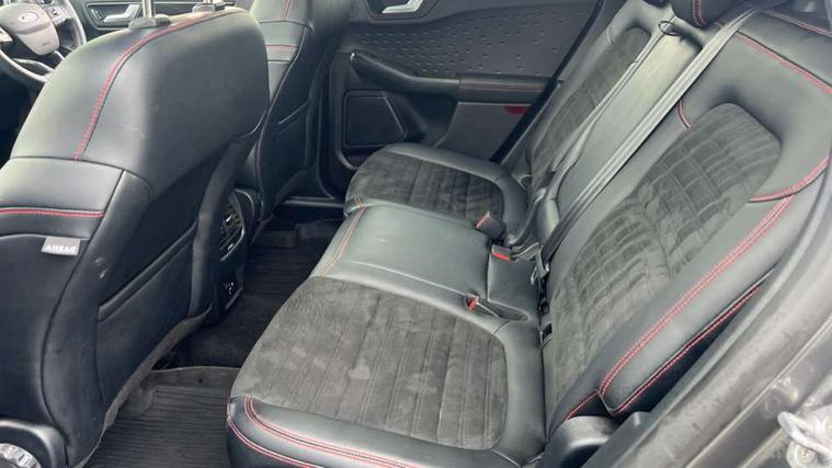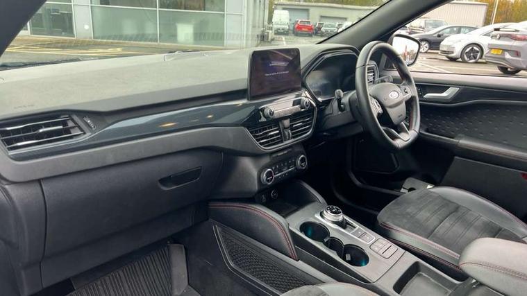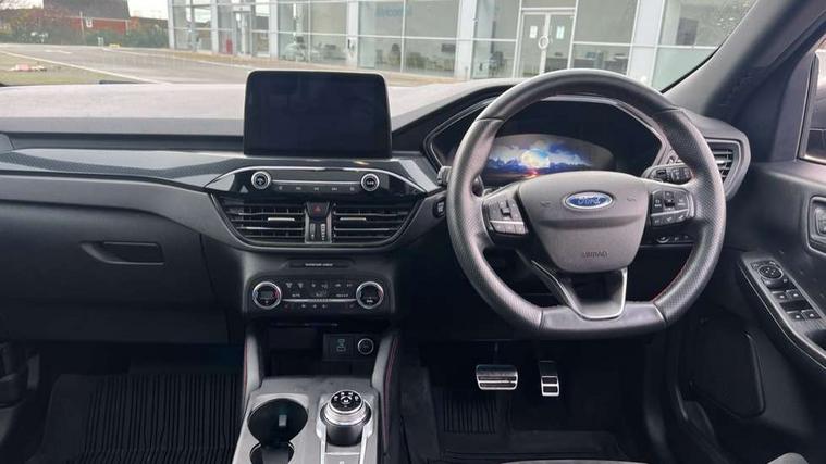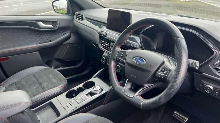 Driver impairment monitor, Ford easy fuel, Ford SYNC 3 with 8" colour touchscreen, App Link, andriod auto/apple carPlay and navigation with Ford pass connect, Front and rear parking sensors, Hands free power tailgate, Intelligent speed assist, Lane keeping aid with lane departure warning, Mobile phone wireless charging pad, Power assist steering, Selectable drive modes, Sports suspension, Auto dimming rear view mirror, Auto headlamps with high and low beam, Auto wipers, Black roof rails, Front LED fog lights with cornering function, Full LED headlamps, Large rear spoiler, LED daytime running lights, LED rear lights, Power folding heated door mirrors with puddle lights, Power front/rear windows with global close, Power opening panoramic roof, Privacy glass, Quickclear heated windscreen, ST Line body styling kit with unique front and rear fascia and bumper, rear painted diffuser, front painted skid plates, dark mesh upper grille, ST Line front scuff plates, Twin exhausts, 10 way power adjustable drivers seat, 2nd row sliding seats, 8 way manual passenger seat including lumbar support and height adjust, Alloy pedals, Ambient lighting, Centre console with electronic parking brake, Dark headlining and pillars, Dual electronic automatic temperature control, Flat bottomed leather steering wheel in sensico with red stitching, Front and rear head restraints, Heated passenger and driver seats, Rear charging point, Sensico partial premium leather upholstery, Sports seats, ST Line front and rear floor mats, Steering wheel mounted paddle shift, B&O with large instrument cluster pack - Kuga, 3x3 point rear seatbelts, Airbags - front driver/passenger, front and rear curtain, Drivers knee airbag, Electronic stability control (ESC) and ABS, Ford MyKey Gen 2 safety system, Post collision braking, Powered child proof rear door locks, Pre collision assist with autonomous emergency braking, Red brake calipers, Tyre pressure monitoring system, Engine immobiliser, Keyless entry, Keyless start with 'Ford Power' starter button, Locking wheel nuts, Remote powered central double locking doors, Thatcham category 1 alarm,