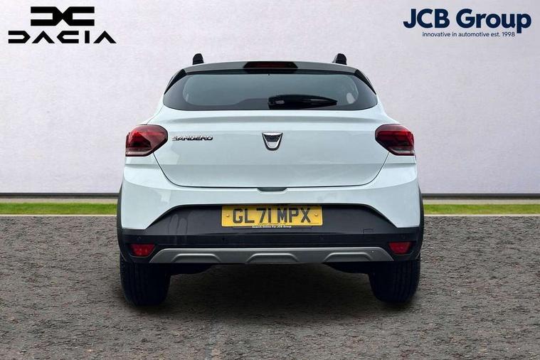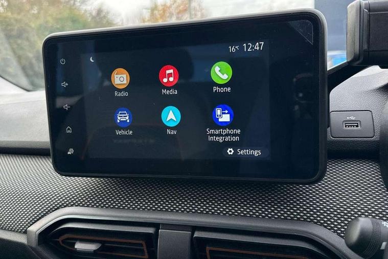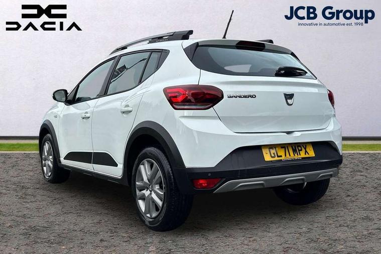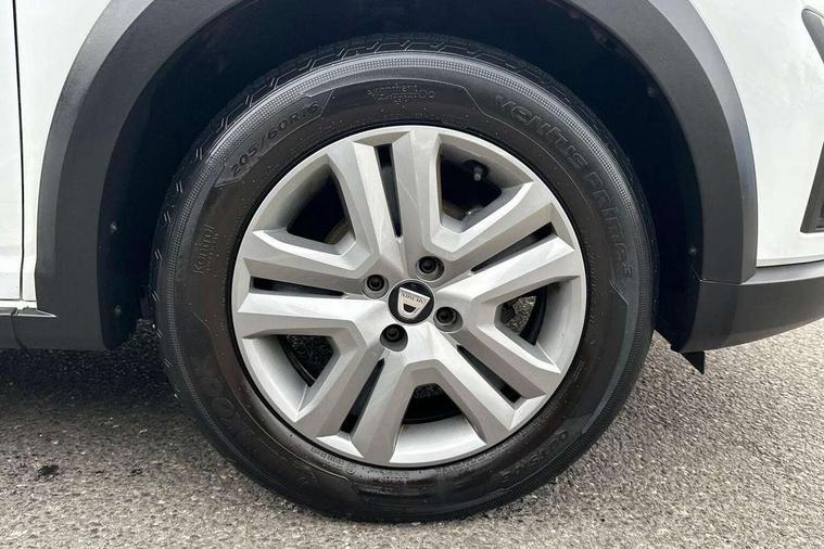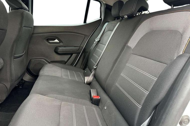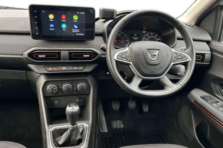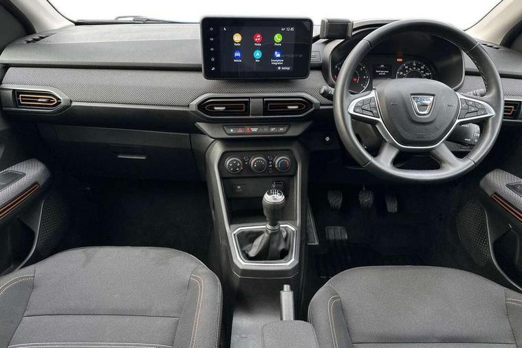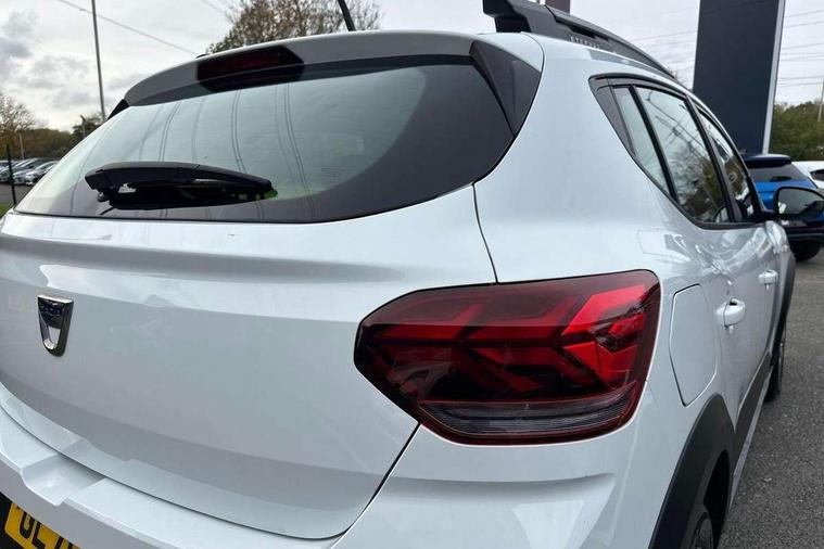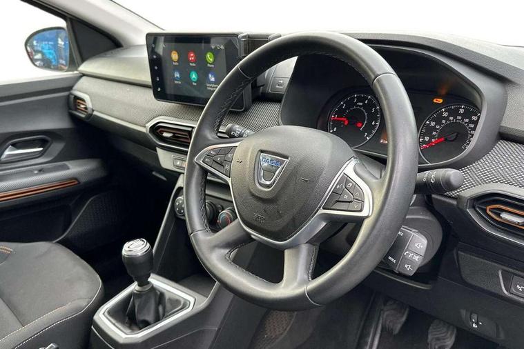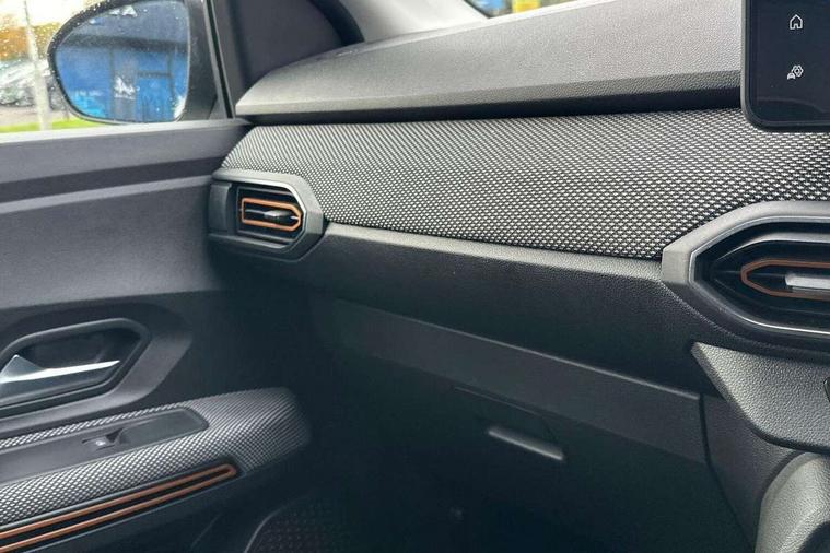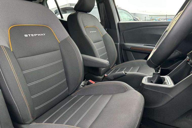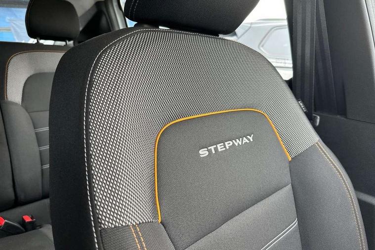 3.5" TFT instrument panel with on-board computer, Cruise control with speed limiter, eCall emergency call system, Eco mode, Electric power assisted steering, Rear parking sensors, Rev counter, Reversing camera, Stop/start system, 8" Media display - DAB radio, smartphone replication, bluetooth, 4 speakers, Apple CarPlay and Android Auto, USB connection for data transfer and charging, USB socket, 3 speed windscreen wipers, Auto lighting, Automatic wipers, Body colour door handles, Body colour door mirrors, Body coloured bumpers, Chrome longitudinal roof bars, Chrome radiator grille, Electrically adjustable and heated door mirrors, Front fog lights, Heated rear window, High level third brake light, LED automatic daytime running lights, LED Y-shape Dacia signature lighting, Modular roof bars, One touch electric front windows, Rear electric windows, Rear wash/wipe, Stepway inscription on radiator grille and roof bars, Tinted windows, 1/3 to 2/3 split folding rear seats, 12 volt front socket, 12 volt rear socket, 3 height adjustable rear headrests, Driver + passenger vanity mirrors, Fabric upholstery, Fixed smartphone holder on dashboard, Front armrest, Gear shift indicator, Height adjustable driver seat, Height adjustable front headrests, Height/depth adjustable steering wheel, Isofix points for child seats in both outer rear seats, Manual air conditioning, Satin chrome interior door handles, Satin Chrome/Copper orange air vents, Soft feel steering wheel, Steering wheel controls, 3x3 point rear seatbelts, ABS and Emergency brake assist, Automatic emergency braking system, Child locks on rear doors, Door open warning, Driver airbag, ESC (Electronic Stability Control), ESP + Hill Start Assist, Front curtain airbags, Front seatbelt pretensioners, Front side airbags, Height adjustable front seatbelts, Passenger airbag, Seatbelt reminder for driver and front passenger, Tyre pressure monitor, Automatic central locking, Immobiliser, Keyless entry, Remote central locking, Decopart on instrument panel and door with textile, 16" Flex wheels with full wheel cap,