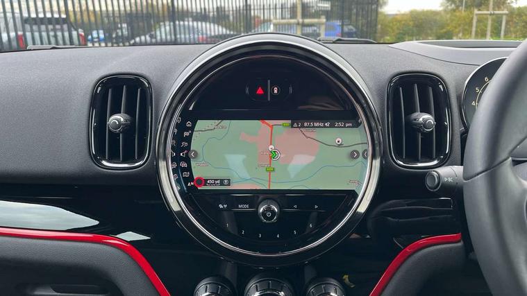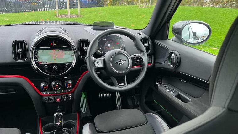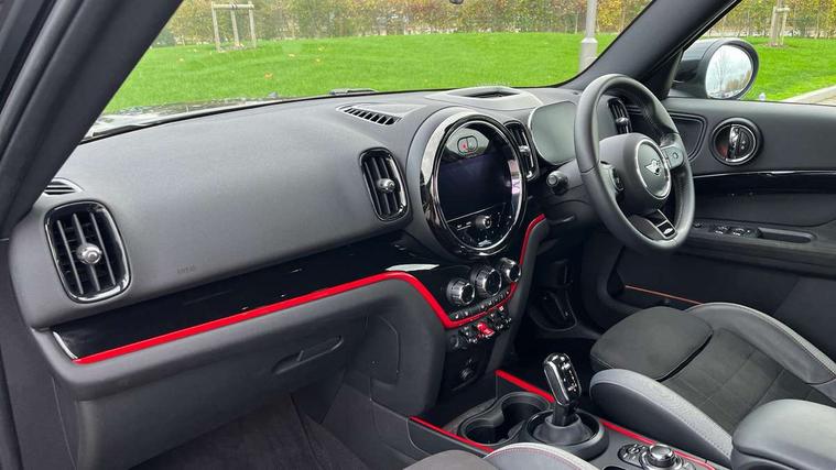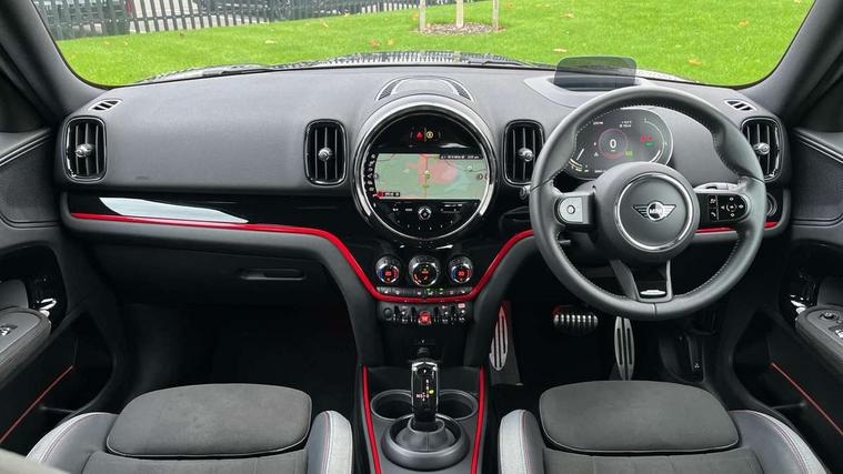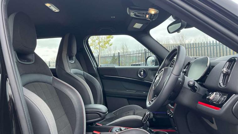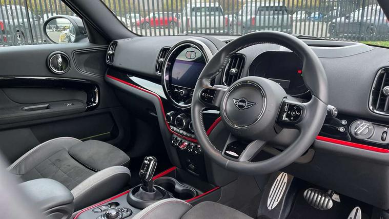 Active Guard incl speed limiting and lane departure functions with auto steering, and front collision warning with brake intervention, Automatic start/stop function with brake energy recuperation, Compatible mobile phone bluetooth with audio streaming, Cruise control with brake assist, Electro-mechanical speed dependant steering assistance, Instrument cluster, MINI Driving Modes - centre toggle switch to control driving setting (sport, mid and green), Mini E-call, On board computer, Rear parking distance control, 51 Litre fuel tank, Double Vanos system, Fully variable valve control, High precision injection, Performance Control, Steptronic transmission with double clutch, FM tuner and DAB digital radio, 3rd brake light, Body colour fuel filler cap, Day time driving lights, Door sill strips, Dynamic brake lights, Electric windows, Heated rear window, Heated windscreen washer jets, John Cooper Works - aerodynamic kit (front and rear apron, spoiler), front and rear sport bumpers and part-painted side sills with door sill finishers, John Cooper Works Logo, LED fog lights, LED Headlights, Model logo, Model logo on Tailgate, Rain sensor with auto headlights, Rear fog lights, Rear side wing doors, Rear window wiper, Side scuttle panel with integrated indicator, Split rear doors, Sun/heat protection glass, White indicator lenses, 12V socket in centre console, 3 seat bench in 2nd row, 360L luggage compartment capacity, 4 lashing eyes in luggage compartment, 40:20:40 split folding rear seats, Anthracite headlining with grab handles and clothes hooks, Chrome interior highlights, Colour line - Carbon black, Cupholders, English handbook, Floor mats, Front headrests, Glove compartment, Height and length steering column adjustment, Interior lighting with 12 basic colours selectable via toggle switch in roof, Isofix rear child seat preparation, LED reading lights, vanity mirror lights, front foot well light and spotlight on front seats, Manual air conditioning, Mini John Cooper Works leather gearshift lever and handbrake gaiters, Multifunction steering wheel, Nappa leather steering wheel with MINI Yours logo, Rear headrests, Single front passenger seat, Stainless steel pedals and foot rest, Storage compartments in doors, Sunvisors with vanity mirrors, Excitement pack - Countryman, Navigation pack - Countryman, Piano black exterior pack - Countryman, 2 tone horn, 3 point seatbelts on all seats, 6 Airbags - front, side, head and seat belt tensioners, Anti-lock braking system (ABS), DSC - Dynamic Stability Control, Electronic handbrake, Front and rear disc brakes, Hill start assist, Manual rear child locks, Tyre pressure monitoring system, Alarm system with tilt sensor, monitoring doors, bonnet interior and tailgate, Auto drive away locking, Deadlocking function, Electronic vehicle immobiliser, Locking wheel bolts, Start/stop toggle with keyless go, Piano black JCW interior trim, Tool kit,