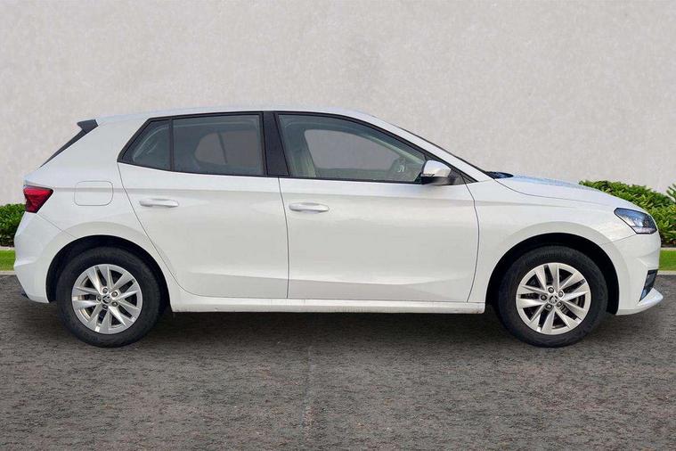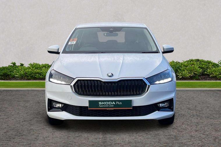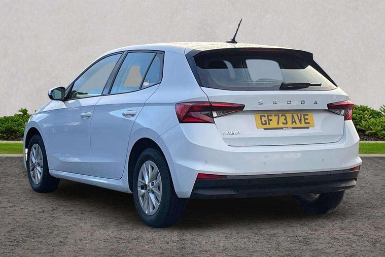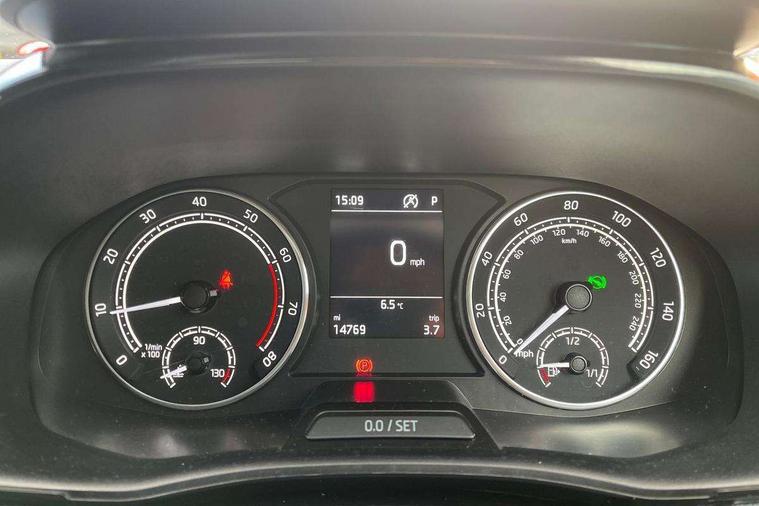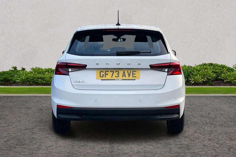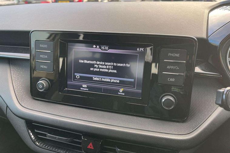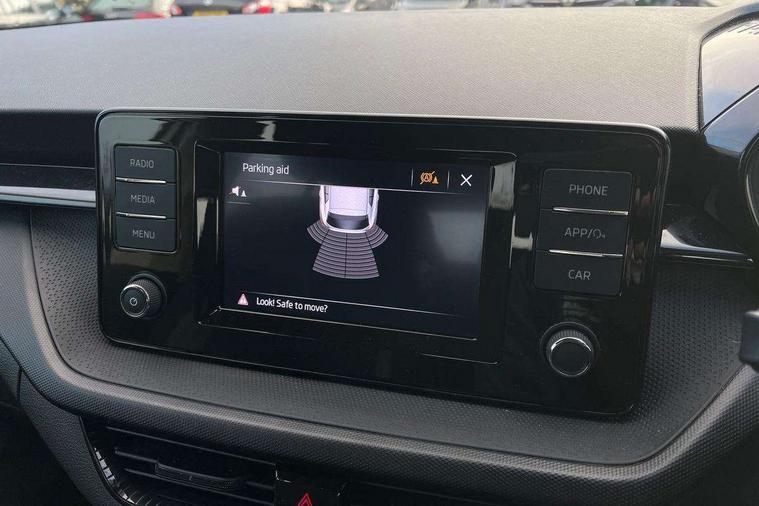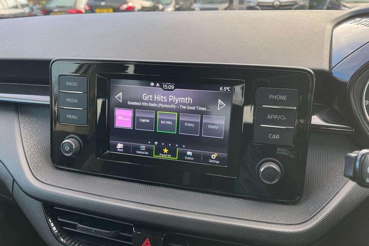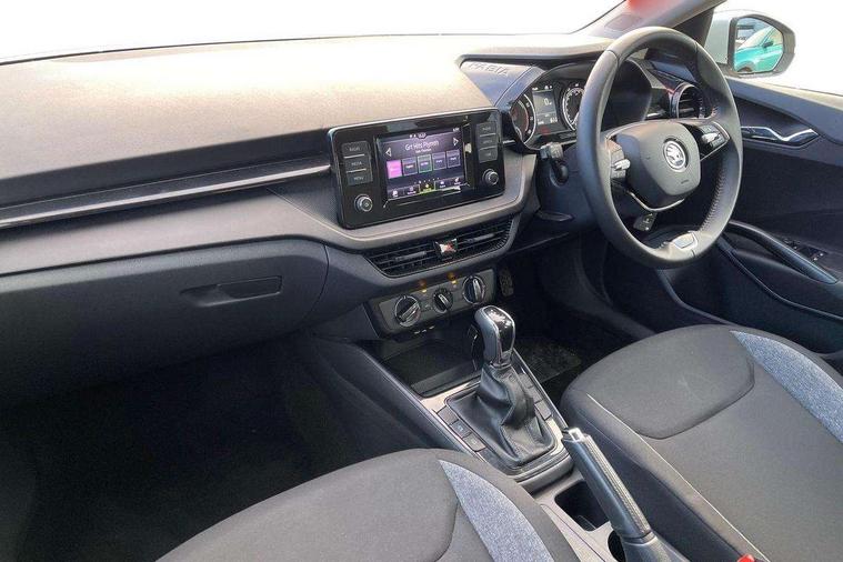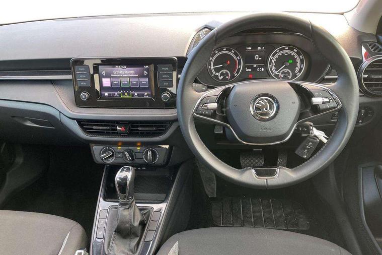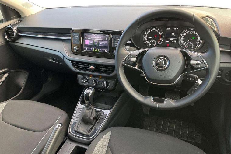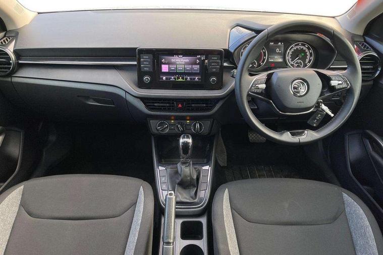 Bluetooth connection, Driver alert system - DAS, Electromechanical power steering, Exterior temperature gauge, Lane assist including road edge detection, Multifunction trip computer in black and white, Rear parking sensors, Service interval indicator, Speed limiter, 2x USB-C in the front (for data transmission and charging), 4 speakers in front, Auxiliary socket for external MP3 player, DAB digital radio reception, Radio Swing with 6.5" colour display, Basic LED Headlights, Basic rear lights, Body colour door mirrors, Body coloured bumpers, Dimming rear view mirror with black frame, Door mirror integrated indicators, Electrically adjustable and heated door mirrors, Electrically adjustable front windows with function auto up/down, Front fog lights, Front window wiper intermittent control, Headlight range control - Automatic, Ice scraper in fuel cap, LED daytime running lights with coming and leaving home feature, Mechanical adjustable rear windows, Rain sensor, Rear LED fog light, Rear side wing doors, Rear window wiper with washing nozzles, Roof mounted spoiler, SKODA tailgate lettering in chrome, Third brake light, 2 reading lights in front and 2 reading lights in rear, 2 spoke leather multifunction steering wheel, 3 rear headrests, Backrest split and folding, Central console with fixed cup holder and storage box, Chrome handbrake release button, Fabric upholstery, Gearshift knob/handle in leather, Grain satin black interior door handles, Hand brake lever handle in leather, Height adjustable front headrests, Height adjustable front seats, Height adjustable steering wheel, ISOFIX and TopTether anchorage points to the outer rear seats, ISOFIX and TopTether on the front passenger seat, Luggage compartment lighting, Manual air conditioning, Manually adjustable lumbar support in front seats, Pollen filter, Rear seat bench unsplit, Single front passenger seat, Storm grey headlining, Sun visors with mirror and airbag label on passenger side, Ticket holder, 3-point height adjustable front seats belts with pretensioner and force limiter, Automatic warning lights in case of crash, Driver and passengers airbag with switch off function, e-Call+, ESC including ABS, MSR, ASR, EDS, HBA and XDS, Front and rear seat belt warning, FRONT ASSIST (AEB City and AEB Inter Urban), Front side airbags, Head airbags, Hill hold assist, One tone horn, Pedestrian protection, Three rear 3-points safety seat belts with pretensioner and force limiter including stop function for outer rear seat belts, Tyre pressure monitoring system, Anti-theft alarm system including immobiliser, interior monitoring, backup horn, and towing protection, Central locking with radio remote control, interior controls, SAFE function and 2 foldable keys, Black painted air vents, Glossy black decorative trim, Grain satin black central console cover, Grain satin black lower decorative trim, Satin black door and side trim panel in front, Anti-theft wheel bolts protection, Super-low rolling resistance tyres,