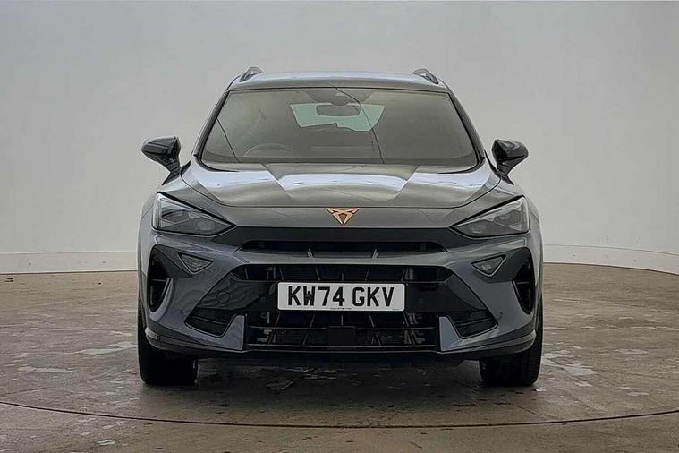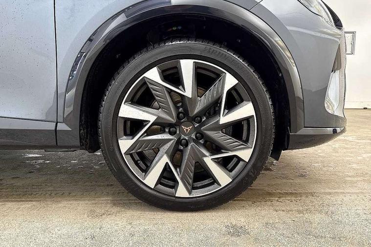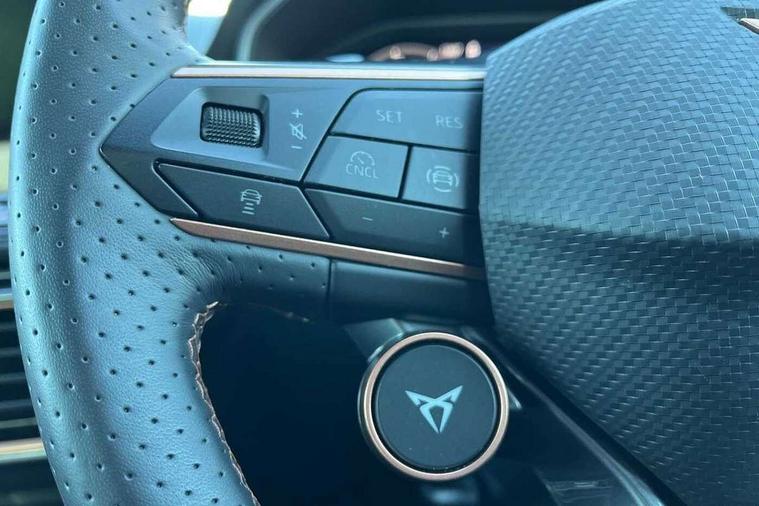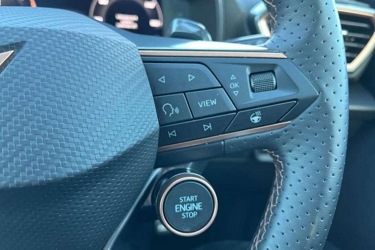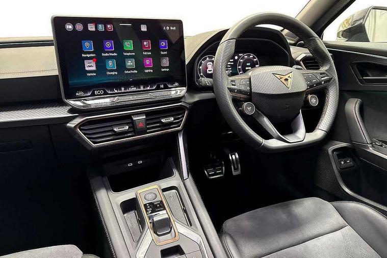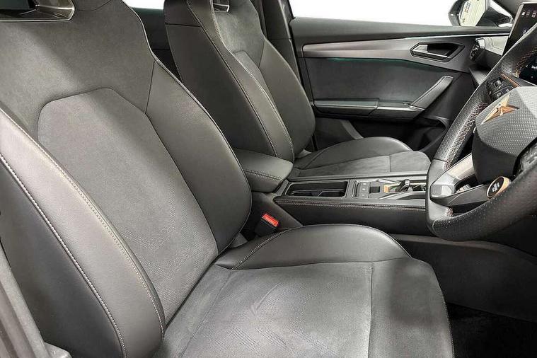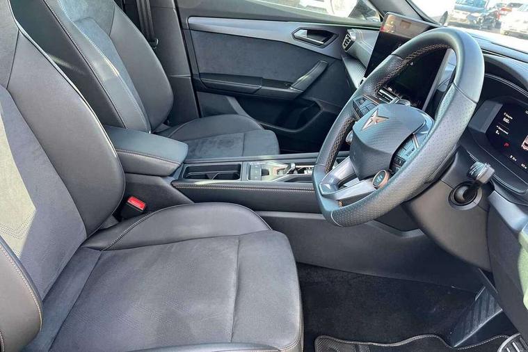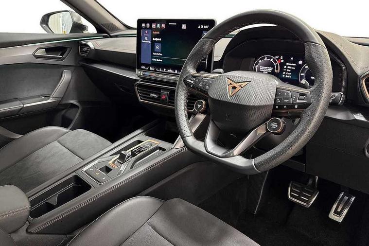 10.25" digital cockpit and configurable dashboard, Adaptive cruise control with follow-to-stop and speed limiter, Advanced driver alert system, Dynamic chassis control with driving profile selection (Comfort, Sport, CUPRA, Individual), Dynamic road sign display, Emergency steering support with turn assist, Forward collision warning with automatic braking, Front and rear parking sensors, Full link phone integration, Lane assist, Rear view camera, RPM, trip computer, outside temp gauge, instrument light brightness, low fuel warning light, lights on reminder, gearshift indicator, Service interval indicator, Speed sensitive power steering, Start/stop system with regenerative braking, Virtual pedal and electric tailgate, Voice control system, Wired Android Auto, Wireless apple carplay, Wireless phone charger, 10 amp mode 2 charging cable, 32 amp mode 3 charging cable, Adaptive chassis control with continuous operation, CUPRA sport suspension, Electronic locking differential and dynamic traction support, 2 front and 2 rear USB type C sockets, Media system with navigation, 12.9" touchscreen display, voice control, DAB, steering wheel mounted controls, Auto dimming rear view mirror, Body colour door handles, Body coloured bumpers, Dark grey wing mirror, Daytime running light with automatic headlight control and coming home feature, Door panel ambient lighting, Dynamic headlight range control, Electric front/rear windows, Electrically adjustable heated and folding door mirrors with memory function, Gloss black roof rails and window surrounds, High beam assist, LED 3rd brake light, LED front fog lamps with cornering function, LED Taillights with dynamic indicator, Matrix LED headlights with multifunction camera, Rain sensing wipers, Rear diffuser with copper simulated exhaust pipes, Rear fog lights, Rear side wing doors, Rear wash/wipe, Tinted rear windows, Welcome lights (within exterior mirror housing), 12V socket, 2 front and 2 rear reading lights, 3 seat bench in 2nd row, 60/40 split rear bench seat with armrest and mechanical seat release, Black headlining, Black interior roof lining, Cupra sports pedals, Dust/pollen filter, Electrically adjustable front seats with lumbar support and memory function, Front and rear head restraints, Front centre armrest, Heated front seats, Heated supersports multifunction leather steering wheel with satellite buttons and gear shift paddles, Height/reach adjust steering wheel, Illuminated aluminium doorsteps, Illuminated interior front door sills, Illuminated sunvisor with mirror, Isofix, Leather dashboard, door insert and side trim panel, LED smart wraparound lighting, PVC/Dinamica microfiber upholstery + bucket seats, Satellite steering wheel, Single front passenger seat, Storage pockets on rear of front seats, Three zone climate control with control panel in rear, 3 point seatbelts on all rear seats, ABS, Brake control system - ESC and brake booster, Child proof door locks, Driver and front passenger airbags with front passenger airbag de-activation, Electronic parking brake, Front and rear disc brakes, Front side curtain airbags, Hill hold control, Public e-call, Seat belt reminder for front and rear seats, Tyre pressure monitoring system, Anti theft alarm system, KESSY Advanced - Keyless start, keyless entry with SAFELOCK, Locking wheel bolts, Copper and aluminium interior detailing, 19" Sandstorm machined sport black and silver alloy wheels, Breakdown and tool kit,