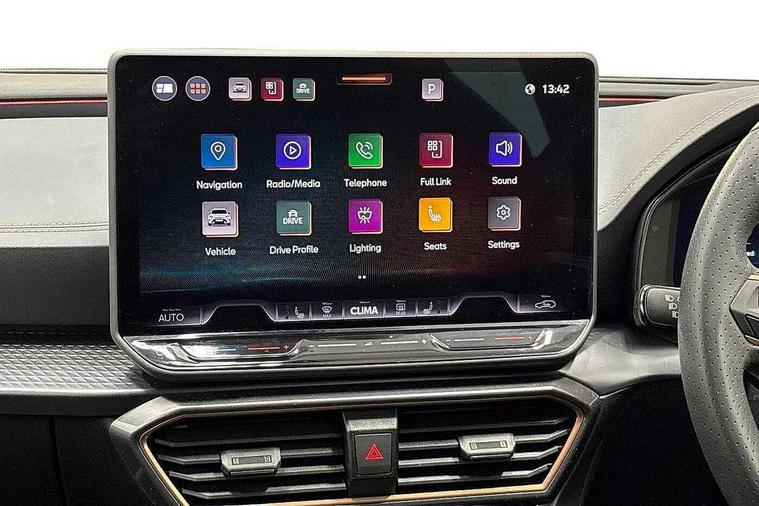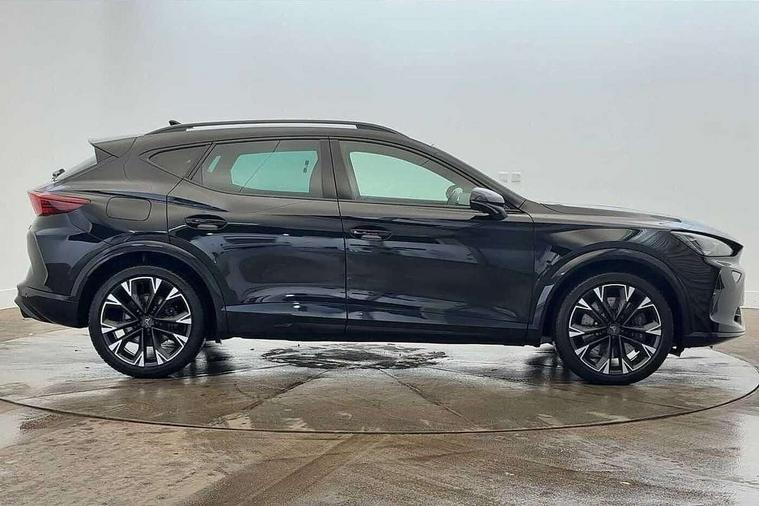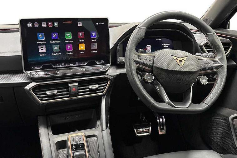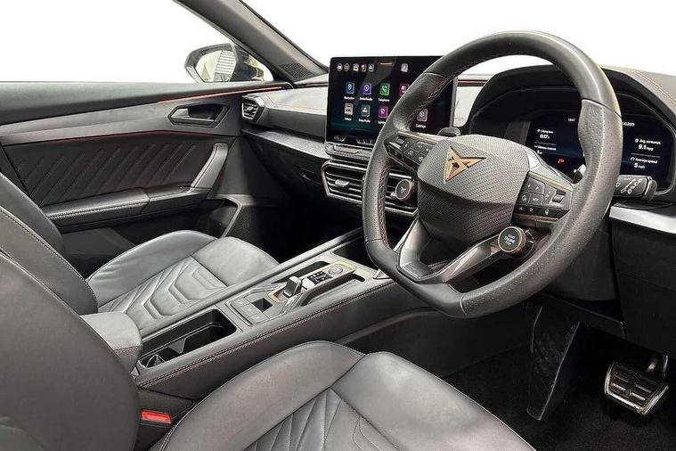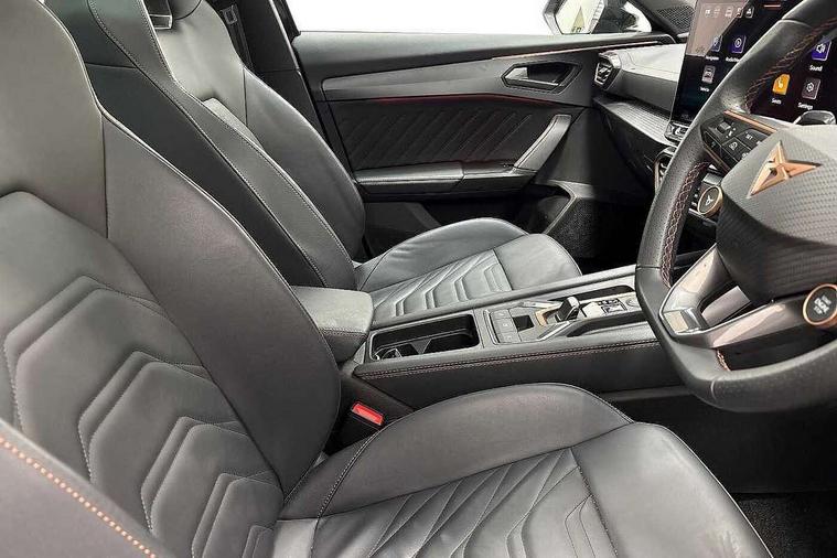 10.25" digital cockpit and configurable dashboard, Adaptive cruise control with follow-to-stop and speed limiter, Advanced driver alert system, Advanced lane assist with semi-automatic vehicle control in a medical emergency and traffic jam assist, Dynamic chassis control with driving profile selection (Comfort, Sport, CUPRA, Individual), Dynamic road sign display, Emergency steering support with turn assist, Forward collision warning with automatic braking, Full link phone integration, Intelligent park assist, RPM, trip computer, outside temp gauge, instrument light brightness, low fuel warning light, lights on reminder, gearshift indicator, Service interval indicator, Side and exit assist, Speed sensitive power steering, Start/stop system with regenerative braking, Top view camera, Virtual pedal and electric tailgate, Voice control system, Wired Android Auto, Wireless apple carplay, Wireless phone charger, Adaptive chassis control with continuous operation, CUPRA sport suspension, Electronic locking differential and dynamic traction support, 2 front and 2 rear USB type C sockets, Media system with navigation, 12.9" touchscreen display, voice control, DAB, steering wheel mounted controls, Auto dimming rear view mirror, Body colour door handles, Body coloured bumpers, Dark grey wing mirror, Daytime running light with automatic headlight control and coming home feature, Door panel ambient lighting, Dynamic headlight range control, Electric front/rear windows, Electrically adjustable heated and folding door mirrors with memory function, Gloss black roof rails and window surrounds, High beam assist, LED 3rd brake light, LED front fog lamps with cornering function, LED Taillights with dynamic indicator, Matrix LED headlights with multifunction camera, Rain sensing wipers, Rear diffuser with twin exhaust pipe on each side, Rear fog lights, Rear side wing doors, Rear wash/wipe, Tinted rear windows, Welcome lights (within exterior mirror housing), 12V socket, 2 front and 2 rear reading lights, 3 seat bench in 2nd row, 60/40 split rear bench seat with armrest and mechanical seat release, Black headlining, Black interior roof lining, Cupra sports pedals, Dust/pollen filter, Electrically adjustable front seats with lumbar support and memory function, Front and rear head restraints, Front centre armrest, Heated front seats, Heated supersports multifunction leather steering wheel with satellite buttons and gear shift paddles, Height/reach adjust steering wheel, Illuminated aluminium doorsteps, Illuminated interior front door sills, Illuminated sunvisor with mirror, Isofix, Leather dashboard, door insert and side trim panel, LED smart wraparound lighting, PVC/Leather upholstery, Satellite steering wheel, Single front passenger seat, Storage pockets on rear of front seats, Three zone climate control with control panel in rear, Variable luggage/load compartment floor, 3 point seatbelts on all rear seats, ABS, Brake control system - ESC and brake booster, Child proof door locks, Driver and front passenger airbags with front passenger airbag de-activation, Electronic parking brake, Front and rear disc brakes, Front side curtain airbags, Hill hold control, Pre-crash front and rear seat belt tensioner, window closure and hazard lights, Public e-call, Seat belt reminder for front and rear seats, Tyre pressure monitoring system, Anti theft alarm system, KESSY Advanced - Keyless start, keyless entry with SAFELOCK, Locking wheel bolts, Copper and aluminium interior detailing, 19" Artic machined sport black and silver alloy wheels, Breakdown and tool kit,