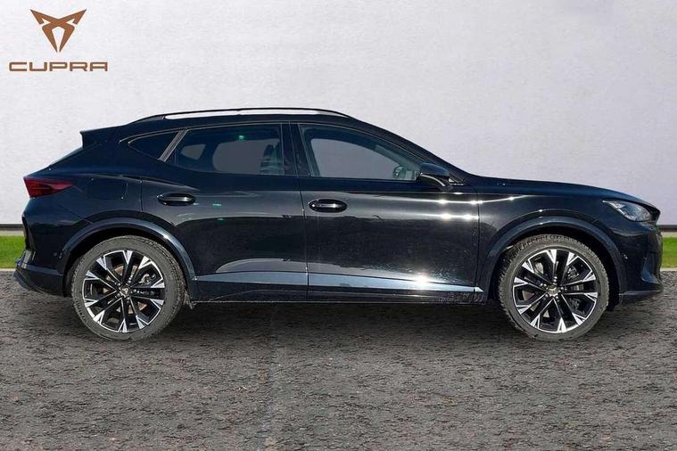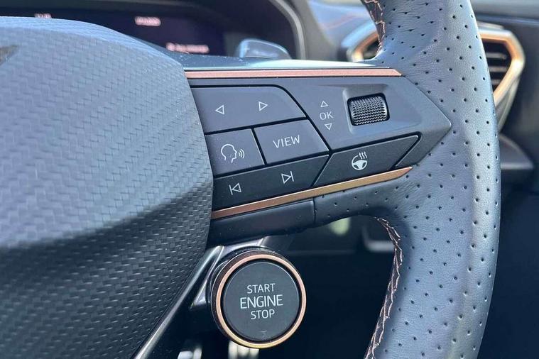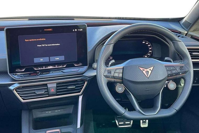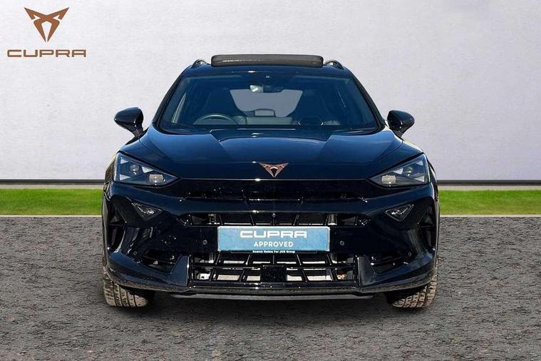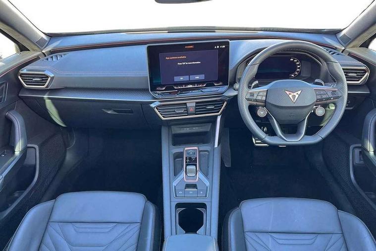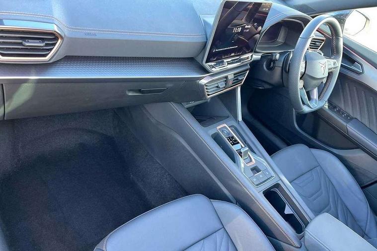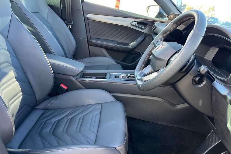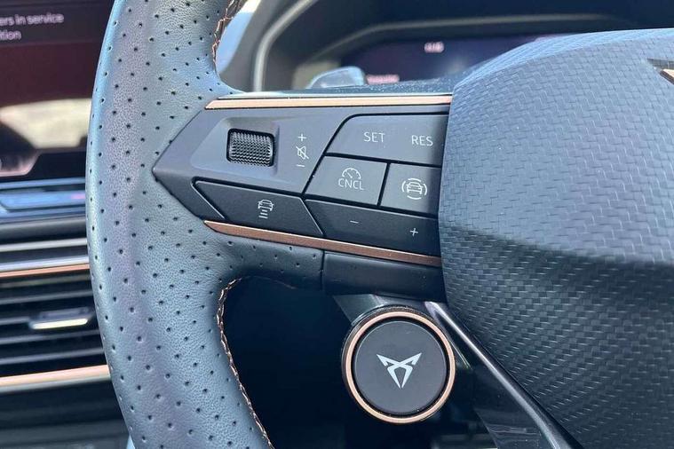 10.25" digital cockpit and configurable dashboard, Adaptive cruise control with follow-to-stop and speed limiter, Advanced driver alert system, Advanced lane assist with semi-automatic vehicle control in a medical emergency and traffic jam assist, Dynamic chassis control with driving profile selection (Comfort, Sport, CUPRA, Individual), Dynamic road sign display, Emergency steering support with turn assist, Forward collision warning with automatic braking, Full link phone integration, Intelligent park assist, RPM, trip computer, outside temp gauge, instrument light brightness, low fuel warning light, lights on reminder, gearshift indicator, Service interval indicator, Side and exit assist, Speed sensitive power steering, Start/stop system with regenerative braking, Top view camera, Virtual pedal and electric tailgate, Voice control system, Wired Android Auto, Wireless apple carplay, Wireless phone charger, Adaptive chassis control with continuous operation, CUPRA sport suspension, Electronic locking differential and dynamic traction support, 2 front and 2 rear USB type C sockets, Media system with navigation, 12.9" touchscreen display, voice control, DAB, steering wheel mounted controls, Auto dimming rear view mirror, Body colour door handles, Body coloured bumpers, Dark grey wing mirror, Daytime running light with automatic headlight control and coming home feature, Door panel ambient lighting, Dynamic headlight range control, Electric front/rear windows, Electrically adjustable heated and folding door mirrors with memory function, Gloss black roof rails and window surrounds, High beam assist, LED 3rd brake light, LED front fog lamps with cornering function, LED Taillights with dynamic indicator, Matrix LED headlights with multifunction camera, Rain sensing wipers, Rear diffuser with twin exhaust pipe on each side, Rear fog lights, Rear side wing doors, Rear wash/wipe, Tinted rear windows, Welcome lights (within exterior mirror housing), 12V socket, 2 front and 2 rear reading lights, 3 seat bench in 2nd row, 60/40 split rear bench seat with armrest and mechanical seat release, Black headlining, Black interior roof lining, Cupra sports pedals, Dust/pollen filter, Electrically adjustable front seats with lumbar support and memory function, Front and rear head restraints, Front centre armrest, Heated front seats, Heated supersports multifunction leather steering wheel with satellite buttons and gear shift paddles, Height/reach adjust steering wheel, Illuminated aluminium doorsteps, Illuminated interior front door sills, Illuminated sunvisor with mirror, Isofix, Leather dashboard, door insert and side trim panel, LED smart wraparound lighting, PVC/Leather upholstery, Satellite steering wheel, Single front passenger seat, Storage pockets on rear of front seats, Three zone climate control with control panel in rear, Variable luggage/load compartment floor, 3 point seatbelts on all rear seats, ABS, Brake control system - ESC and brake booster, Child proof door locks, Driver and front passenger airbags with front passenger airbag de-activation, Electronic parking brake, Front and rear disc brakes, Front side curtain airbags, Hill hold control, Pre-crash front and rear seat belt tensioner, window closure and hazard lights, Public e-call, Seat belt reminder for front and rear seats, Tyre pressure monitoring system, Anti theft alarm system, KESSY Advanced - Keyless start, keyless entry with SAFELOCK, Locking wheel bolts, Copper and aluminium interior detailing, 19" Artic machined sport black and silver alloy wheels, Breakdown and tool kit,