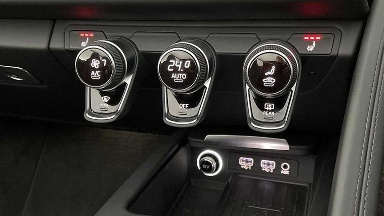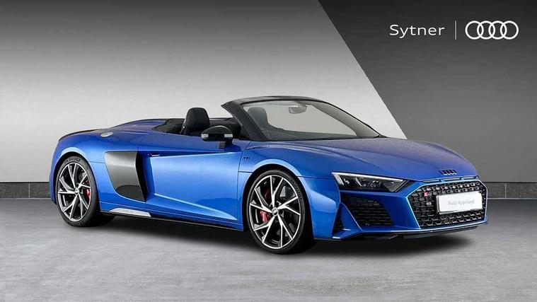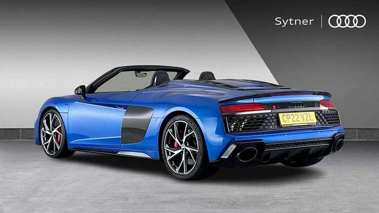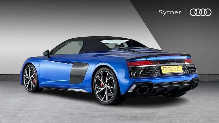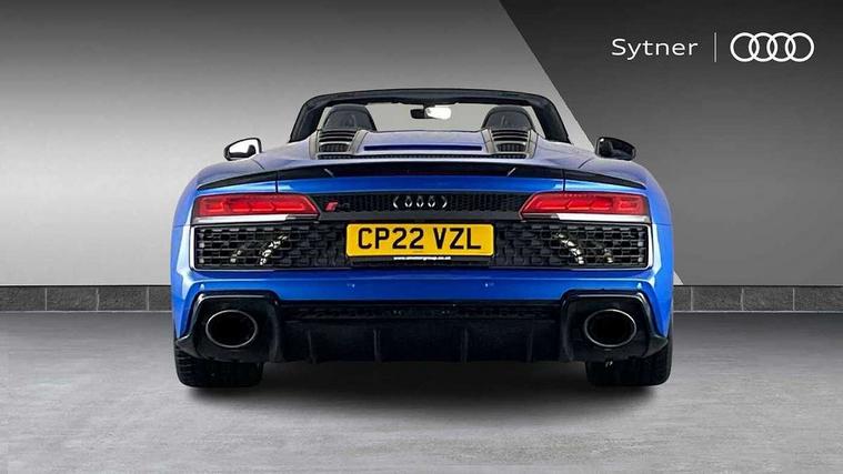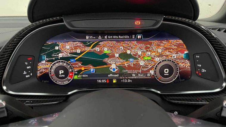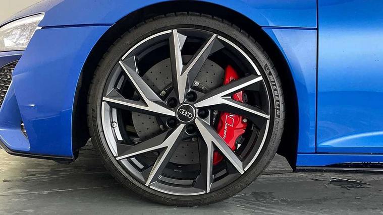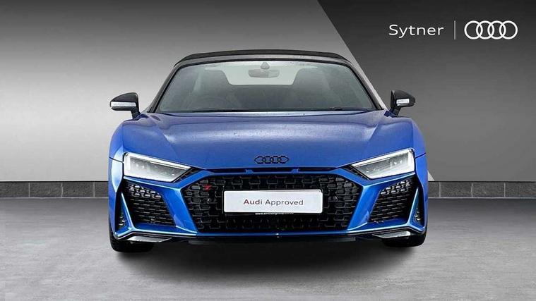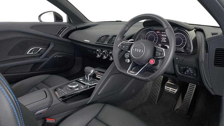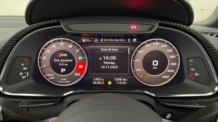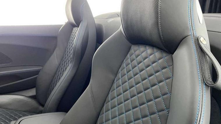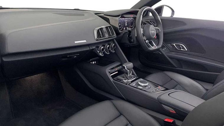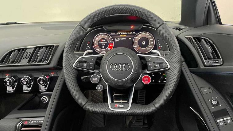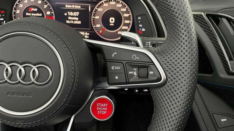 Audi connect, Audi drive select, Audi parking system plus with front and rear sensors, Audi phone box with wireless charging, Audi smartphone interface, Audi virtual cockpit, Bluetooth interface, Cruise control with speed above 18mph, Emergency call service, MMI navigation plus with MMI touch, PAS, Reversing camera, Service interval indicator, Start/Stop system with energy recuperation, Voice control system, Audi cylinder on demand, Large fuel tank 83 liters, S tronic transmission with hill hold assist, Sports suspension, Audi music interface with 2 USB ports with charge and data functions, Bang and Olufsen Sound System with loudspeakers in the head restraints, DAB Digital radio, 3rd brake light, Audi beam, Audi space frame, Auto dimming rear view mirror and frameless with light and rain sensor, Black mirrors, Electric front windows, Electrically adjustable, heated, folding and automatically dimming door mirrors with integrated LED indicator, Fixed rear lip spoiler in Gloss Carbon, Gloss black oval tailpipe trim, Gloss black radiator grille with R8 emblem, Heated rear window, High beam assist, LED headlights with dipped beam, daytime running lights, indicator and static turning light in LED technology, LED rear lights with dynamic rear indicators, Rear boot, Sideblades in gloss carbon, 3 spoke flat bottomed multi-functional perforated performance leather steering wheel with 3 operating satellites, Deluxe automatic climate control air conditioning, Hood lining in black, Illuminated door sills with aluminium insert, Seat heating, Single front passenger seat, Stainless steel pedals and footrest, Black styling pack - R8 Spyder, Gloss black styling pack - R8, Interior light pack - R8, ABS, Ceramic brakes in front with brake calipers in gloss red, Driver/front passenger airbag, EDL traction control, ESP, Front side airbags, Seatbelt monitoring, Tyre pressure warning light, Warning triangle and first aid kit, Wave brake discs, Advanced key with safelock, Anti theft alarm and immobiliser, Locking wheel bolts, Remote central locking, Belt loops, top section of centre console, centre armrest, door pull handle and speaker trim on front pass. side in fine Nappa leather seat up. colour, Door armrests and map compartments in fine Nappa leather in seat upholstery colour, Loudspeaker on drivers side in artificial black leather, Matt anthracite titanium finish inlays, Piano black lower inlays, Steering wheel impact absorber trim, lower part of centre console, door rails, rear panel rail and side panel trims in black Fine Nappa Leather, Upper and lower section of dashboard, cowl, monoposto, knee pad on the drivers side, airbag cover in black Fine Nappa Leather, Tool kit, Tyre repair kit,