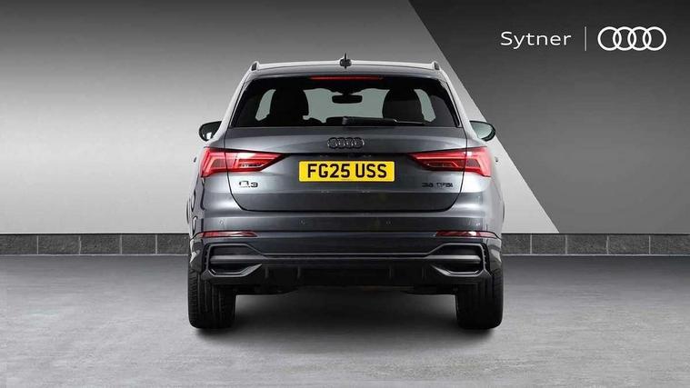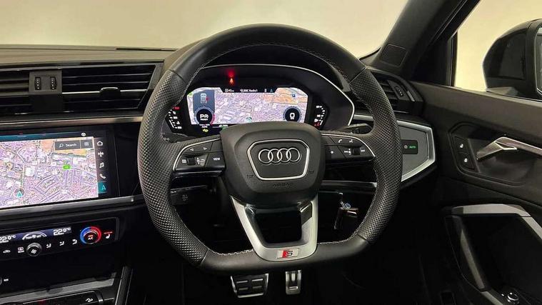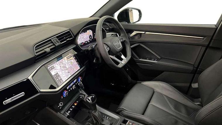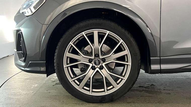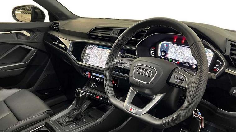 Amazon alexa Integration, Audi connect safety and service, Audi drive select, Audi lane departure warning, Audi Virtual Cockpit - 10.25" display, Bluetooth interface, Camera based traffic sign recognition, Distraction and Fatigue warning, Legal emergency call, MMI Navigation Plus with high resolution 10.1 inch touchscreen colour display, Power operated tailgate, Progressive steering, Service interval indicator, Smartphone interface includes wireless Apple carplay/Android Auto, Start stop system with recuperation, Voice control system with natural language interaction, Sports suspension, 2 USB-C ports with charge and data functions, 6 passive loudspeakers, DAB digital radio module, Acoustic windscreen, Audi Beam uses LEDs to project the Audi logo onto the ground as you exit your Q3, Auto dimming door mirrors, Auto dimming frameless rear view mirror, Black roof rails, Electrically folding, adjustable and heated door mirrors with integrated LED side indicators and kerb view function for passenger side, Front and rear electric windows, Front fog lights, Grille vertical bars in aluminium silver/Matt, High gloss black finish B and C pillars, LED Dynamic rear indicators, LED headlights with LED daytime running lights, LED rear lights, LED third brake light, Privacy glass dark tinted rear and rear-side windows (from B-pillar backwards), Rain and light sensors, Rear diffuser grille in grained matt black, Rear diffuser strip in matt anthracite black, Rear side wing doors, Rear wiper, S line bumpers in contrasting Manhattan grey, Variable front intermittent wipers, 12V socket in rear centre console, 3 seat bench in 2nd row, 40:20:40 folding with manual adjustment for 60:40 forwards/backwards position and backrest angle, Adjustable rear seat bench/backrest with centre armrest and cupholder, Black cloth headlining, Dual zone electronic climate control, Electric lumbar support, Front and rear black floor mats with contrast stitching in rock grey, Front and rear headrests, Front centre armrest, Height and reach adjustable steering wheel, Illuminated door sill trims with S logo, ISOFIX child seat mounting for front passenger with airbag deactivation and outer rear seat including top tether attachment point for outer rear seats, Manual front seats with height adjustment, Perforated leather gearknob, Single front passenger seat, Stainless steel luggage compartment sill finisher, Stainless steel pedals, Twin leather upholstery with front sport seats + S embossing, Black styling pack - Q3, Non smoking pack - Q3, 3x3 point rear seatbelts, 6 airbags - Driver, front passenger, curtain and side windows, Audi pre-sense front with pedestrain and cyclist recognition, Electrically operated child locks on rear doors, Electromechanical parking brake, Electronic stabilisation control including ABS, ASR and EDL, Front seatbelt reminder, Hill descent control, Hill hold assist, Pre sense basic, Seatbelt monitoring, Tyre pressure warning, Warning triangle and first aid kit, Anti theft wheel bolts, Immobiliser, Remote central locking, Thatcham approved category 1 anti theft alarm, Aluminium look interior elements, Detail dashboard around MMI touch colour display in glass look, black with surround in aluminium look, Leatherette door armrest, Piano black inlay,
