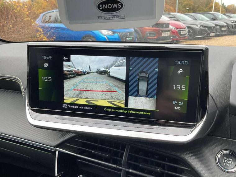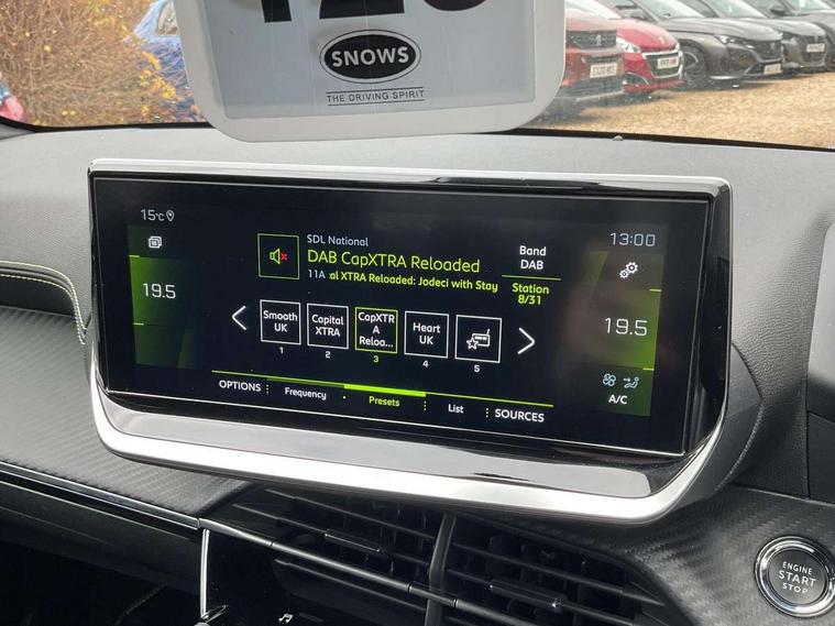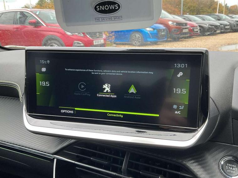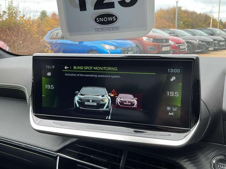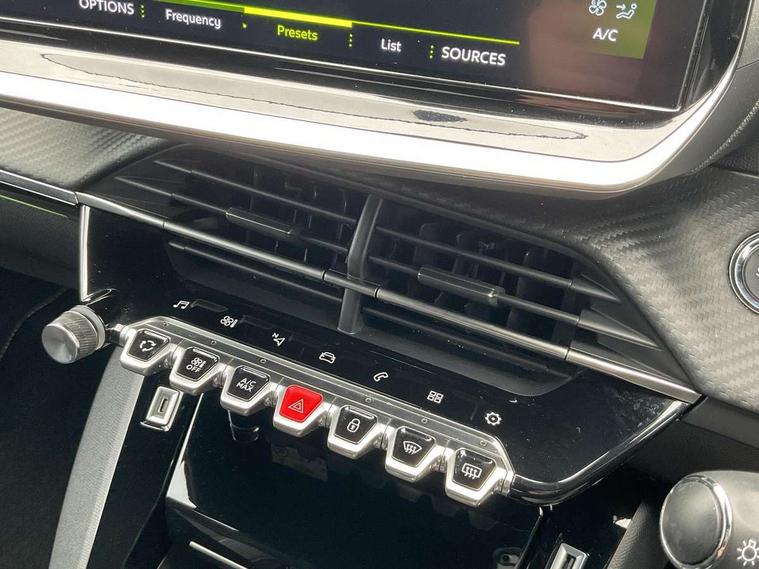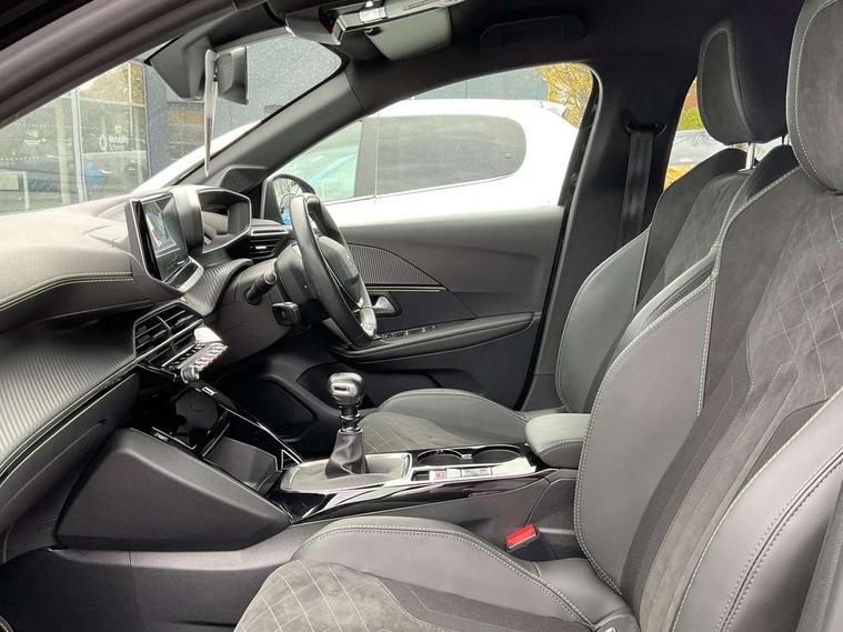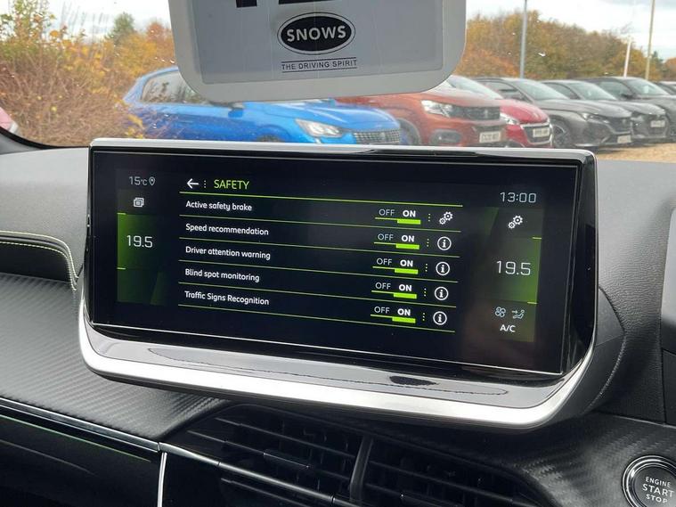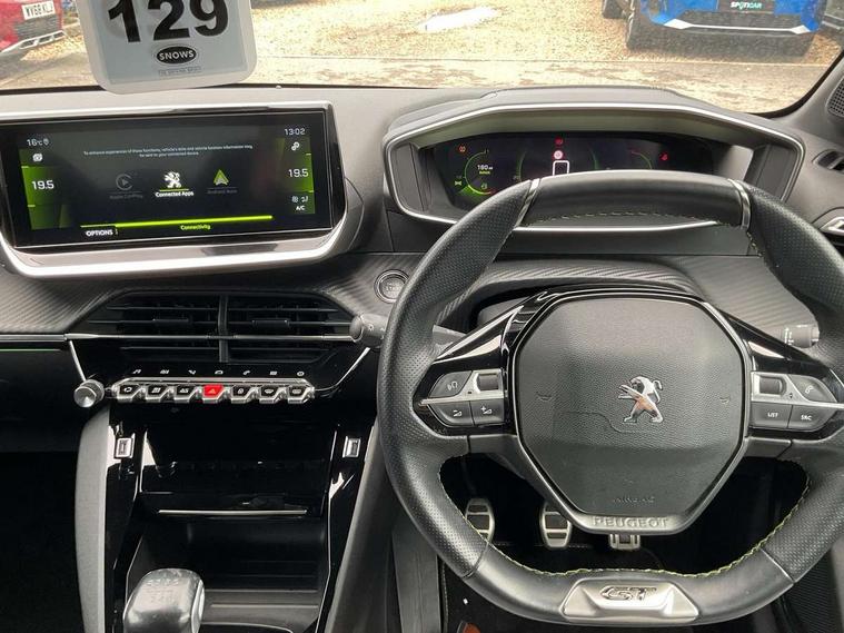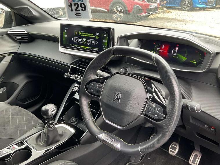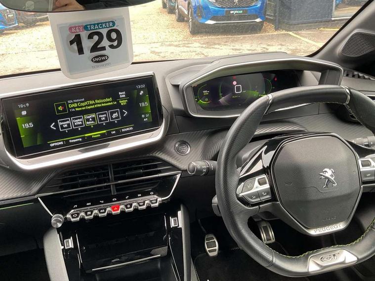10" Capacitive colour touchscreen with connected 3D navigation, Blind spot monitoring, Bluetooth telephone facility, Driver attention warning, Exterior temperature indicator with ice warning, Lane keep assist, Mirror screen with mirror link, apple carplay and android auto, Multi function trip computer, Peugeot connect SOS and assistance, PEUGEOT i-Cockpit with compact steering wheel, PEUGEOT i-Cockpit with configurable 3D headup instrument panel, Push button start, Smart phone docking station, Speed limit recognition and recommendation, Start/stop system, Visio park assist 180 with colour reversing camera + front and rear parking sensor, 2 front USB socket with USB-C, 2x USB sockets in rear, 6 speakers radio with mp3 compatible, DAB Digital radio, Voice recognition for radio, navigation and telephony features, 2 X Rear number plate lights, Automatic lights, Automatic windscreen wipers, Body coloured exterior door handles, Dark tinted Rear side and tailgate windows, Diamond black rear spoiler, Diamond Black roof, Electric front windows + one touch + anti-pinch, Electric rear windows with one touch/anti-pinch, Electrically adjustable, heated and power folding door mirrors, Follow me home headlights, Frameless electrochrome interior rear view mirror, Full LED headlights with smartbeam assist, Gloss black finish on B pillar, Gloss black rear cluster connecting strip, Gloss black wheel arch extensions, Gloss black window surround, GT model designation badging on C pillar, GT model designation badging on tailgate, Headlights left on audible warning, LED daytime running lights with 3 claw headlight with distinctive tooth design, LED side indicator lights integrated into door mirrors, LED third brake light, Model designation badges front and rear, Nera black door mirror shells, Peugeot scuff plates, Radiator grille - Dark chrome chequered and gloss black edge trim, Rear bumper with gloss black finish, Rear full LED 3D peugeot signature claw effect lights with daylight function, Rear lower bumper diffuser effect trim in gloss black, Rear reversing lights, Rear side wing doors, Rear windscreen wiper triggered automatically in reverse gear, Roof mounted aerial with fin design, Roof spoiler, Single exhaust tailpipe, Tailgate with heated rear windscreen and wiper blade, Variable front intermittent wipers, 1/3 to 2/3 split folding rear seats, 12V socket, 3 seat bench in 2nd row, 8 Colour personalisable ambient lighting, Aluminium pedals and foot rest, Automatic air conditioning, Driver and front passenger seat manual adjustment in longitudinal and back rest angle, Driver and front passenger seat mechanical height adjustment, Driver and front passenger sport seats, Electric power steering with reach and rake adjustable steering column, Front and rear carpet mats in black with lime green stitch detail, Front centre armrest with storage compartment, Front LED interior light with 2 reading spotlights and rear interior light with timer, Gear shift indicator, High centre console with 2 cup holders, ISOFIX child seat mounting points on passenger seat, Lime green contrast stitching to armrest, front centre console, door panels and dashboard facia, Map pockets on the backs of the front seats, Mistral full grain perforated leather steering wheel with aikinite stitch detail and satin chrome 'GT' emblem, Piano keys gloss black plated toggle switches to access main functions of the vehicle, Piano keys gloss black plated toggle switches to access touchscreen functions, Rear centre headrest, Roof lining - Mistral black, Satin chrome gear lever, Seatbelt unfastened on the move audible and visual alert for front and rear seats, Single front passenger seat, Drive assist pack - 208, 3 rear 3 point seatbelts, ABS (Anti-lock Braking System) with EBD (Electronic Braking Distribution) and EBA (Emergency Braking Assistance), Active safety brake with night function/cyclists/pedestrians, Adaptive driver and front passenger airbags with passenger airbag deactivation function, Child locking functionality on rear doors, Driver/front passenger side airbags, Electric parking brake, ESP with Hill Assist, Front and rear curtain airbags, Front and rear disc brakes, Front optimised safety headrests and 3 x rear retractable headrests with height adjustable, Front three point retractable seatbelts with force limiters, Tyre pressure sensor, Acoustic vehicle alert system (AVAS), Automatic door locking when moving off, Automatic hazard light activation upon heavy brake application, Deadlock, Electronic code immobiliser, Peugeot Open and Go System, Remote central locking, Thatcham cat. 1 alarm with anti lift sensor, Carbon effect Dashboard, front and rear door panel finish, 17" Bronx two-tone alloy wheels, Space saver spare wheel,