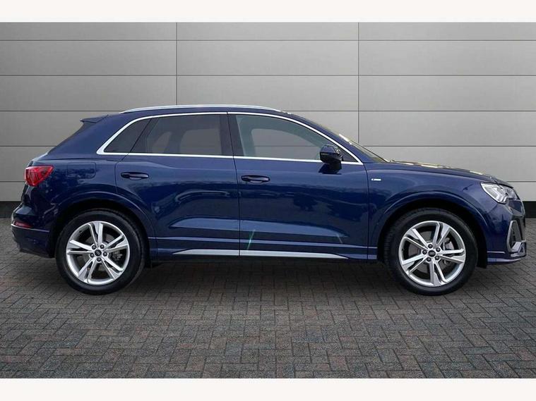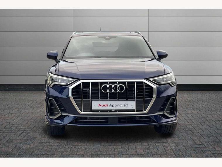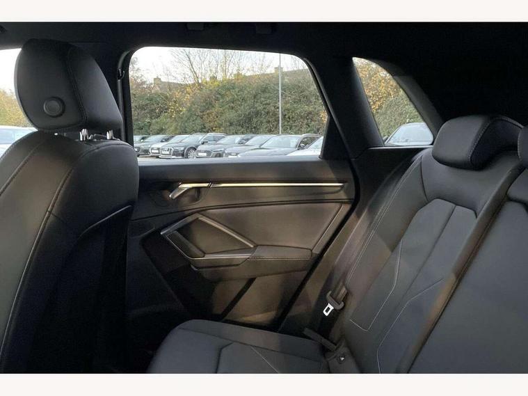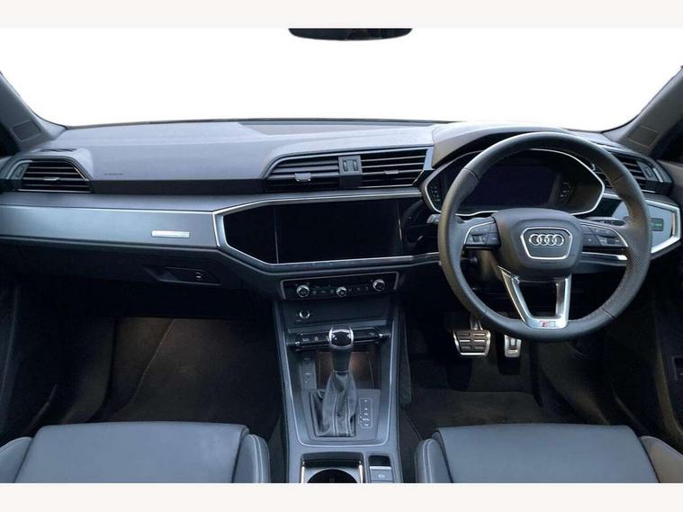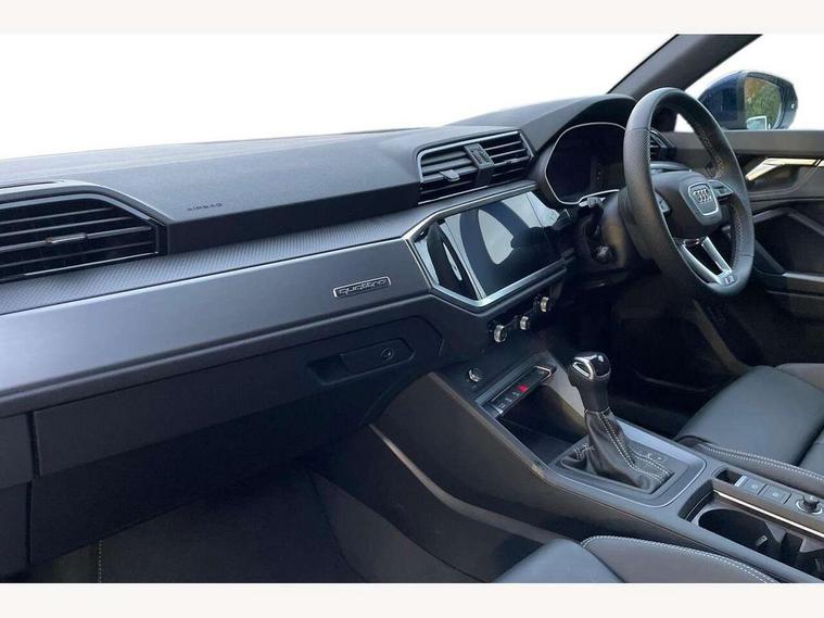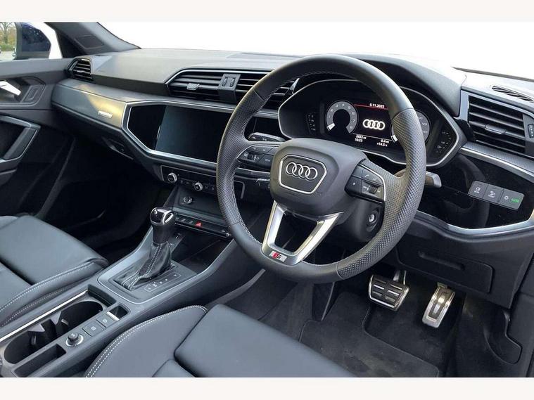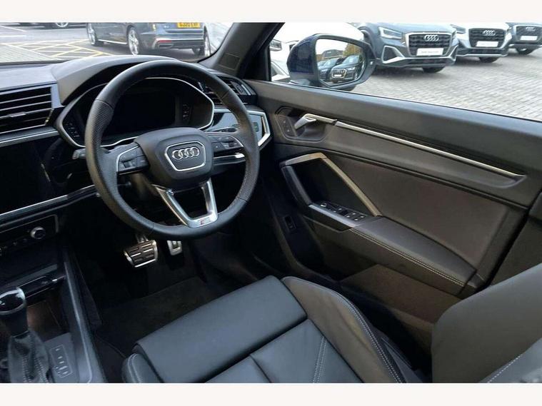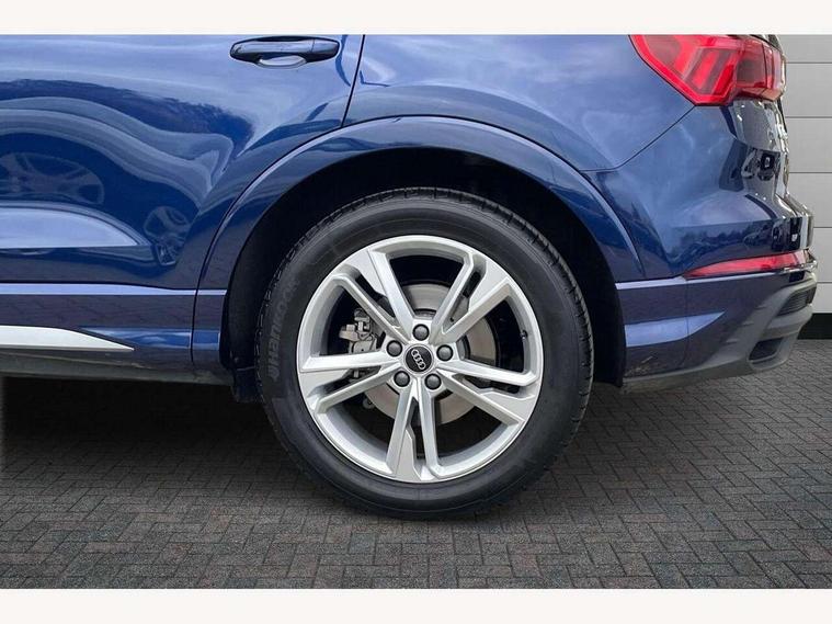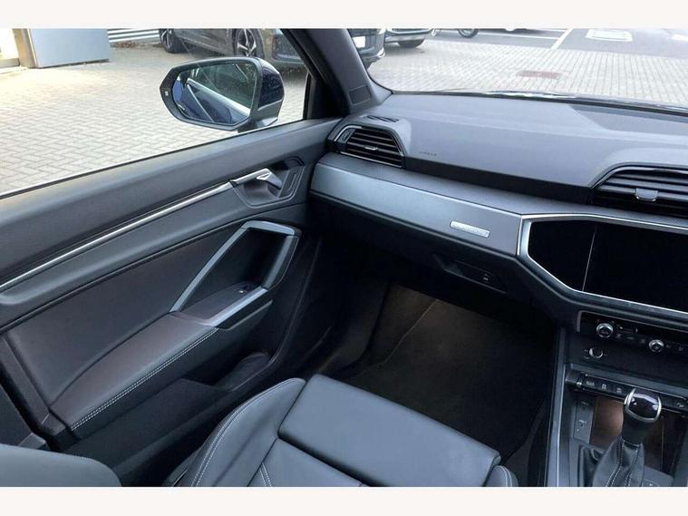 Amazon alexa Integration, Audi connect safety and service, Audi drive select, Audi lane departure warning, Audi Virtual Cockpit - 10.25" display, Bluetooth interface, Camera based traffic sign recognition, Distraction and Fatigue warning, Legal emergency call, MMI Navigation Plus with high resolution 10.1 inch touchscreen colour display, Power operated tailgate, Progressive steering, Service interval indicator, Smartphone interface includes wireless Apple carplay/Android Auto, Start stop system with recuperation, Voice control system with natural language interaction, Sports suspension, 2 USB-C ports with charge and data functions, 6 passive loudspeakers, DAB digital radio module, Acoustic windscreen, Aluminium roof rails, Aluminium window trim, Anthracite black radiator grille, Auto dimming door mirrors, Auto dimming frameless rear view mirror, Body colour front spoiler blade, Electrically folding, adjustable and heated door mirrors with integrated LED side indicators and kerb view function for passenger side, Front and rear electric windows, Front fog lights, Front side air inlets in matt platinum grey, Grille vertical bars in aluminium silver/Matt, High gloss black finish B and C pillars, LED Dynamic rear indicators, LED headlights with LED daytime running lights, LED rear lights, LED third brake light, Privacy glass dark tinted rear and rear-side windows (from B-pillar backwards), Rain and light sensors, Rear diffuser grille in grained matt black, Rear diffuser strip in matt anthracite black, Rear side wing doors, Rear wiper, S line badges on front wings, S Line front and rear bumpers and side skirts, Side skirt insert in matt Platinium grey, Variable front intermittent wipers, 12V socket in rear centre console, 3 seat bench in 2nd row, 3 spoke leather multifunction steering wheel features S badging and grips in perforated leather with contrast stitching, 40:20:40 folding with manual adjustment for 60:40 forwards/backwards position and backrest angle, Adjustable rear seat bench/backrest with centre armrest and cupholder, Black carpet mats, Black cloth headlining, Dual zone electronic climate control, Electric lumbar support, Front and rear black floor mats with contrast stitching in rock grey, Front and rear headrests, Front centre armrest, Height and reach adjustable steering wheel, Horizontal trim strip in matt platinum grey, Illuminated door sill trims with S logo, ISOFIX child seat mounting for front passenger with airbag deactivation and outer rear seat including top tether attachment point for outer rear seats, Luggage compartment sill protection in stainless steel, Manual front seats with height adjustment, Perforated leather gearknob, Single front passenger seat, Stainless steel pedals, Twin leather upholstery with front sport seats + S embossing, Non smoking pack - Q3, 3x3 point rear seatbelts, 6 airbags - Driver, front passenger, curtain and side windows, Audi pre-sense front with pedestrain and cyclist recognition, Electrically operated child locks on rear doors, Electromechanical parking brake, Electronic stabilisation control including ABS, ASR and EDL, Front seatbelt reminder, Hill descent control, Hill hold assist, Pre sense basic, Seatbelt monitoring, Tyre pressure warning, Warning triangle and first aid kit, Anti theft wheel bolts, Immobiliser, Remote central locking, Thatcham approved category 1 anti theft alarm, Aluminium look interior elements, Dark matt brushed aluminium inlay, Detail dashboard around MMI touch colour display in glass look, black with surround in aluminium look, Leatherette door armrest,