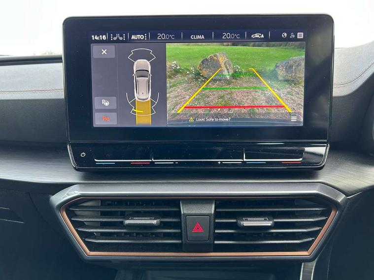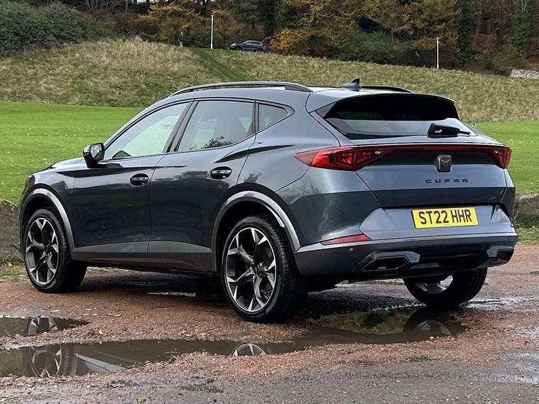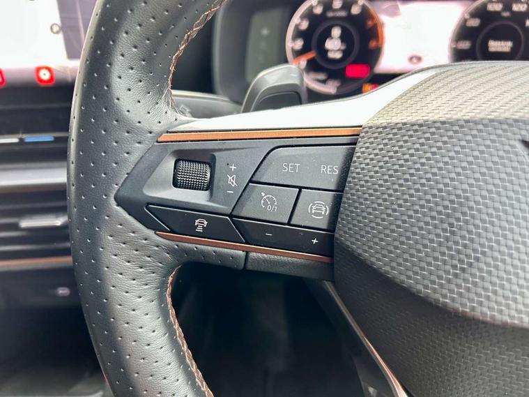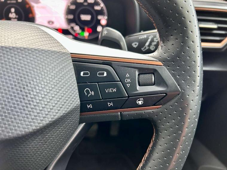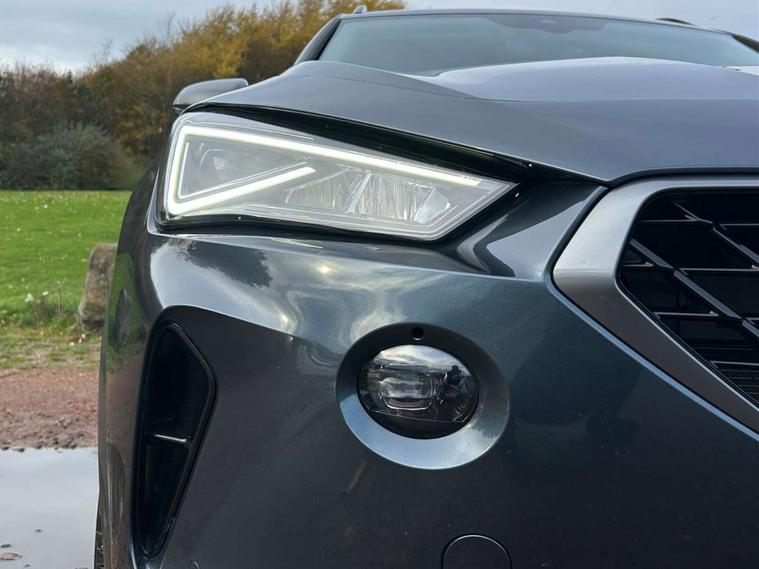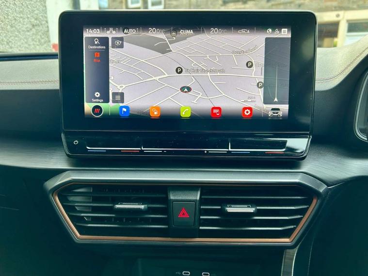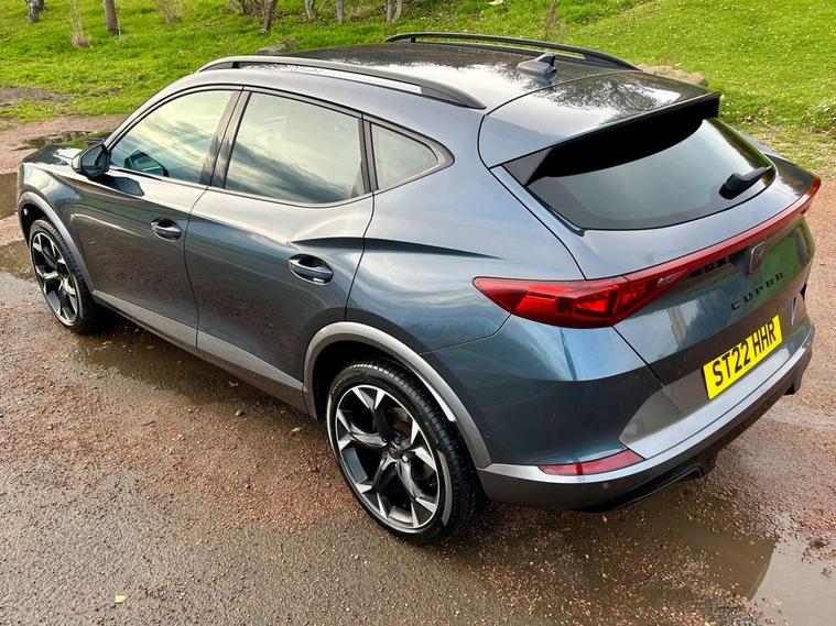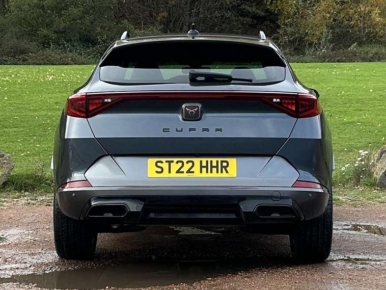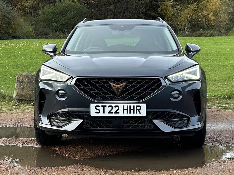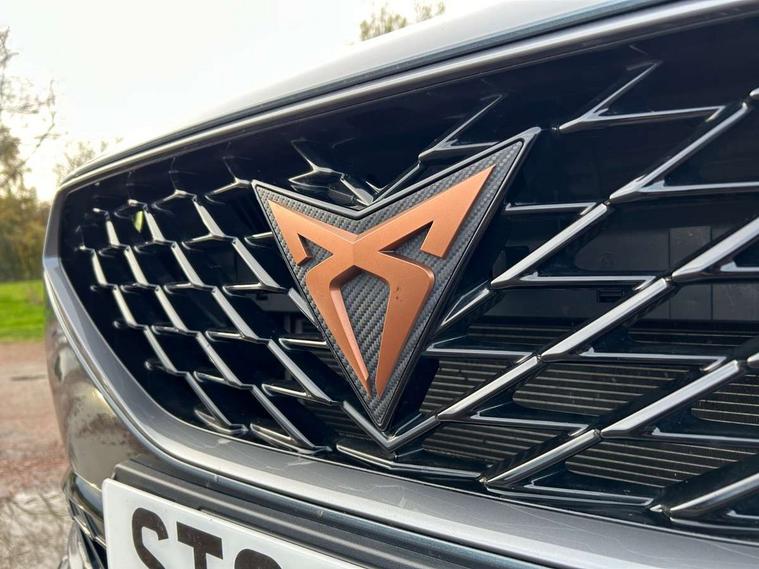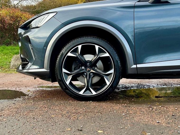Digital cockpit and configurable dashboard, Driver alert system, Driving profile selection, E-call, Forward collision warning with automatic braking, Lane assist, Park assist (inc front/rear parking sensors), PAS, Predictive adaptive cruise control with speed limiter, Rear view camera, RPM, trip computer, outside temp gauge, instrument light brightness, low fuel warning light, lights on reminder, gearshift indicator, Service interval indicator, Start/stop system with regenerative braking, Wireless apple carplay, Wireless phone charger, Electronic locking differential and dynamic traction support, Standard suspension, 2 front and 2 rear USB type C sockets, Auxiliary input socket, DAB radio, Auto dimming rear view mirror, Body colour door handles, Body coloured bumpers, Dark grey wing mirror, Daytime running light with automatic headlight control and coming home feature, Dynamic headlight range control, Electric front/rear windows, Electrically adjustable heated and folding door mirrors with memory function, Front fog lamps with cornering function, Gloss black roof rails and window surrounds, LED Headlights, LED Taillights with dynamic indicator, Rain sensing wipers, Rear diffuser with black simulated exhaust pipes, Rear side wing doors, Rear wash/wipe, Third brake light, Tinted rear windows, Welcome lights, 12v power supply in centre console, 12V socket, 12v socket in loadspace, 2 front and 2 rear reading lights, 230V socket, 3 seat bench in 2nd row, 60/40 split rear bench seat with armrest and mechanical seat release, Dust/pollen filter, Front and rear head restraints, Front centre armrest, Height/reach adjust steering wheel, Illuminated interior front door sills, Illuminated sunvisor with mirror, Isofix, Leather multi function heated steering wheel with gear shift paddles, Luggage tie-down hooks, Single front passenger seat, Three zone climate control with control panel in rear, Variable luggage/load compartment floor, Wraparound lighting, Genuine Nappa leather Pack - Cupra, Navigation system pack with 10" navigation system - Formentor, 3 point seatbelts on all rear seats, ABS, Brake control system - ESC and brake booster, Child proof door locks, Driver and front passenger airbags with front passenger airbag de-activation, Electronic parking brake, Front and rear disc brakes, Front side curtain airbags, Hill hold control, Seat belt reminder for front and rear seats, Tyre pressure monitoring system, Anti theft alarm system, Keyless entry and start system (KESSY), Locking wheel bolts, Copper and aluminium interior detailing, 19" 'Exclusive' machined sport matte black and silver alloy wheels,