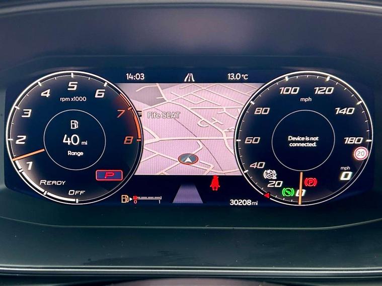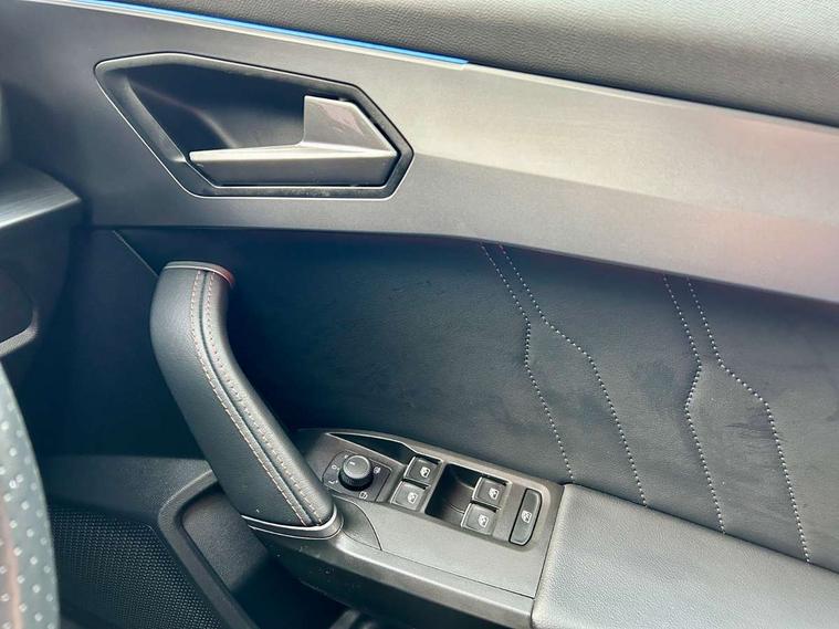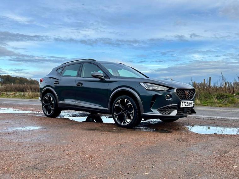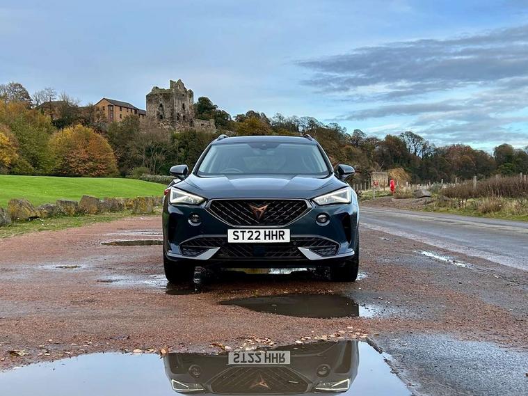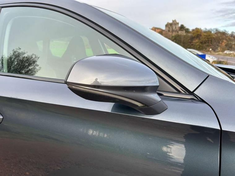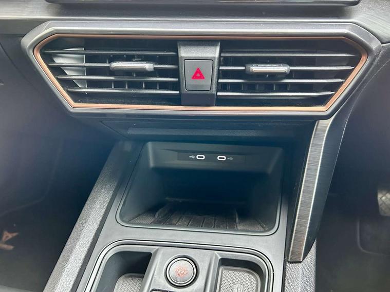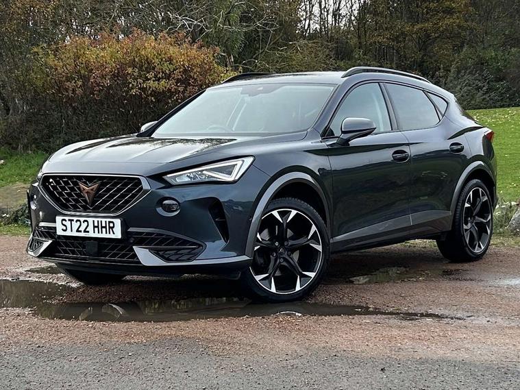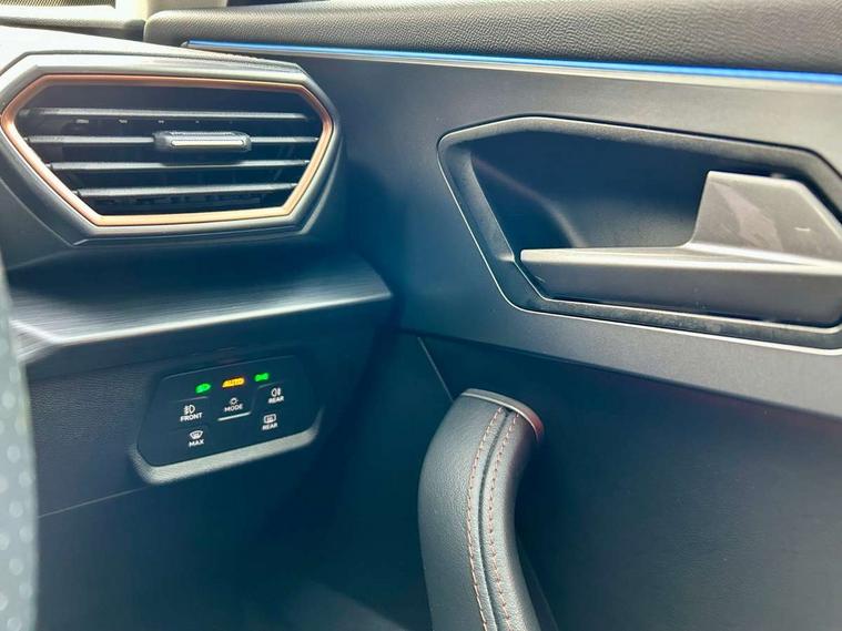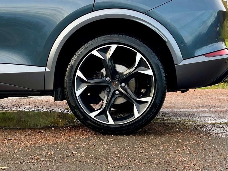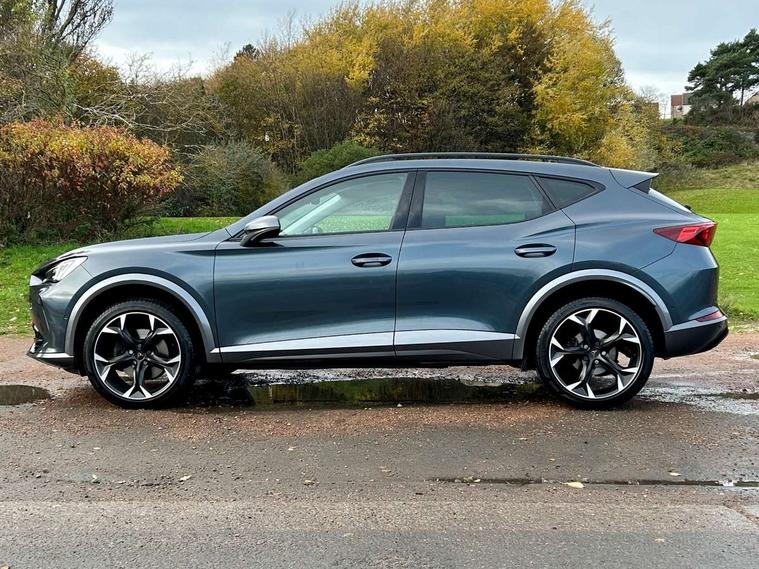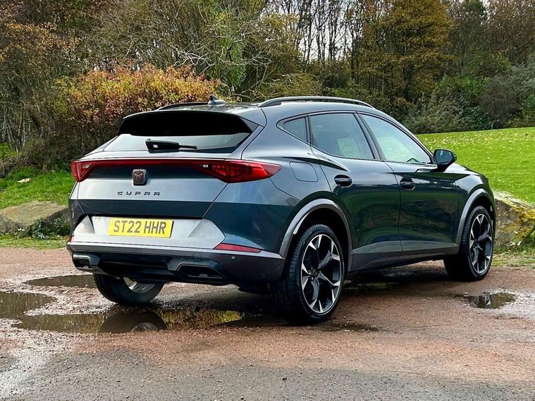 Digital cockpit and configurable dashboard, Driver alert system, Driving profile selection, E-call, Forward collision warning with automatic braking, Lane assist, Park assist (inc front/rear parking sensors), PAS, Predictive adaptive cruise control with speed limiter, Rear view camera, RPM, trip computer, outside temp gauge, instrument light brightness, low fuel warning light, lights on reminder, gearshift indicator, Service interval indicator, Start/stop system with regenerative braking, Wireless apple carplay, Wireless phone charger, Electronic locking differential and dynamic traction support, Standard suspension, 2 front and 2 rear USB type C sockets, Auxiliary input socket, DAB radio, Auto dimming rear view mirror, Body colour door handles, Body coloured bumpers, Dark grey wing mirror, Daytime running light with automatic headlight control and coming home feature, Dynamic headlight range control, Electric front/rear windows, Electrically adjustable heated and folding door mirrors with memory function, Front fog lamps with cornering function, Gloss black roof rails and window surrounds, LED Headlights, LED Taillights with dynamic indicator, Rain sensing wipers, Rear diffuser with black simulated exhaust pipes, Rear side wing doors, Rear wash/wipe, Third brake light, Tinted rear windows, Welcome lights, 12v power supply in centre console, 12V socket, 12v socket in loadspace, 2 front and 2 rear reading lights, 230V socket, 3 seat bench in 2nd row, 60/40 split rear bench seat with armrest and mechanical seat release, Dust/pollen filter, Front and rear head restraints, Front centre armrest, Height/reach adjust steering wheel, Illuminated interior front door sills, Illuminated sunvisor with mirror, Isofix, Leather multi function heated steering wheel with gear shift paddles, Luggage tie-down hooks, Single front passenger seat, Three zone climate control with control panel in rear, Variable luggage/load compartment floor, Wraparound lighting, Genuine Nappa leather Pack - Cupra, Navigation system pack with 10" navigation system - Formentor, 3 point seatbelts on all rear seats, ABS, Brake control system - ESC and brake booster, Child proof door locks, Driver and front passenger airbags with front passenger airbag de-activation, Electronic parking brake, Front and rear disc brakes, Front side curtain airbags, Hill hold control, Seat belt reminder for front and rear seats, Tyre pressure monitoring system, Anti theft alarm system, Keyless entry and start system (KESSY), Locking wheel bolts, Copper and aluminium interior detailing, 19" 'Exclusive' machined sport matte black and silver alloy wheels,