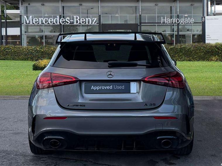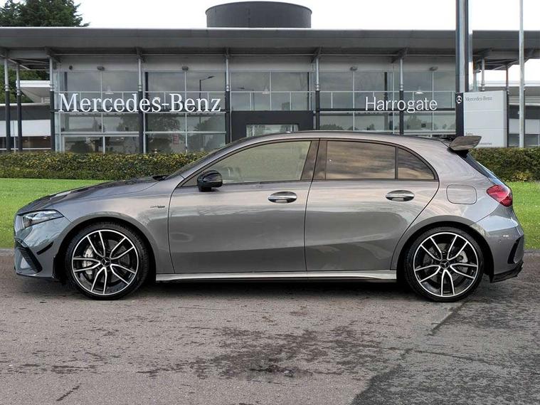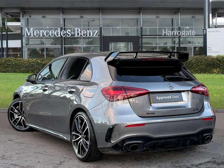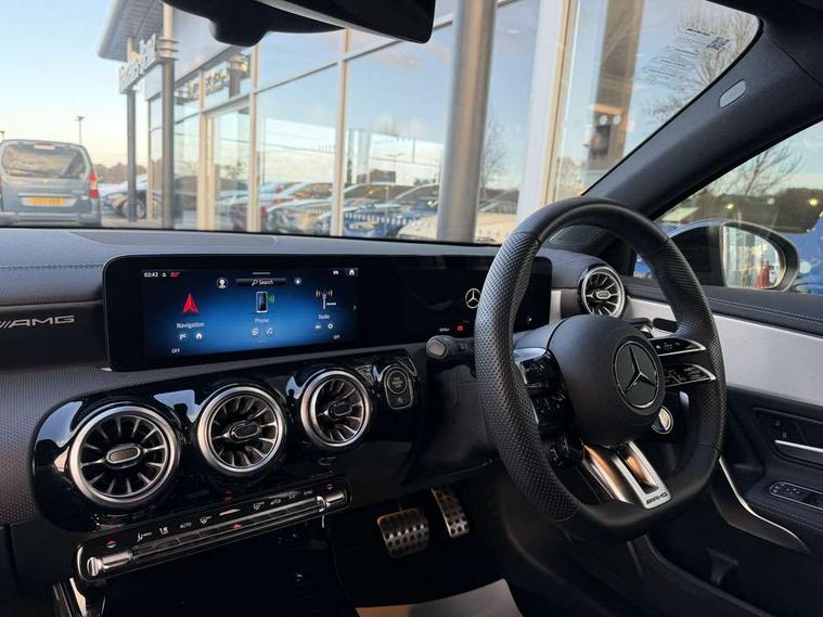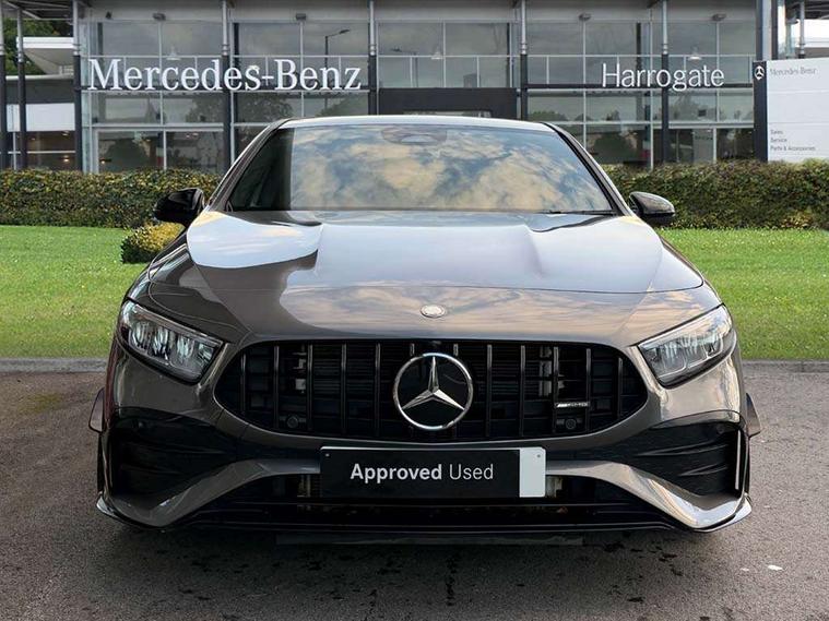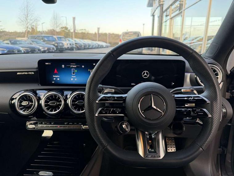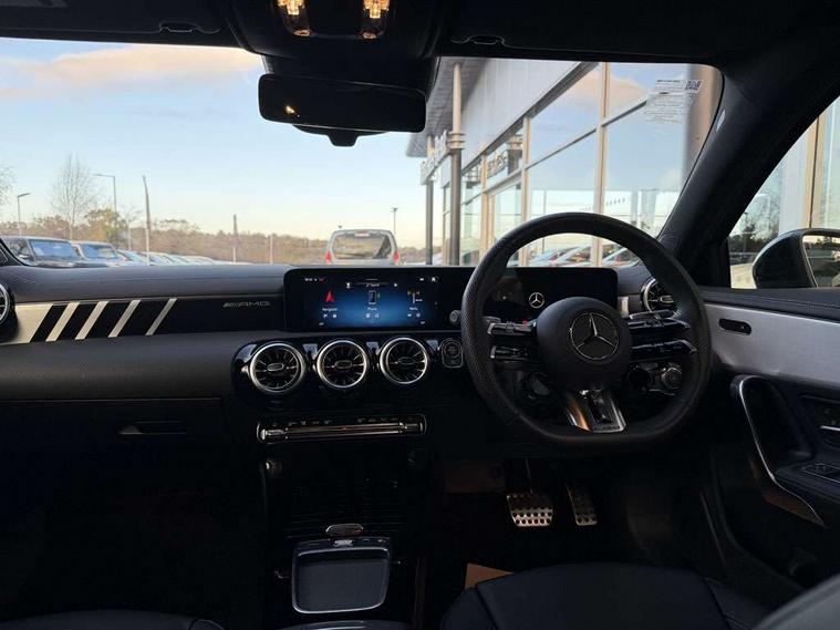 10.25 inch touchscreen central media display, 10.25" Digital instrument cluster display screen, Attention assist, Blind spot assist, Brake pad wear indicator warning light, Car wash mode, Cruise control + speed limiter, Direct steering, Direction indicators with lane change function, Dual bluetooth interfaces, DYNAMIC SELECT with driving programs (Slippery, Comfort, Sport, Sport+ and Individual), ECO start/stop function, Engine start/stop button, Fingerprint scanner, Fluid level warning indicator for fuel, oil, coolant and washer fluid, Fluorescent jacket for driver, Hard-disk navigation, Hey Mercedes Voice activation, Lamp failure indicator, Lane keeping system, MBUX augmented reality for navigation, Mercedes me connect including emergency call system, accident recovery, breakdown and maintenance management, Mercedes me remote services, Outside temperature gauge, Owners manual in English, Pre-installation of private car share, Remote boot closing, Service indicator (ASSYST), Smartphone integration with Apple CarPlay and Android auto, Speed limit assist, Speed sensitive power steering, Tailgate, Trip computer in multifunction display with current consumption indicator, Wireless charging, AMG suspension, DAB Digital radio, MBUX multimedia system, Mercedes Benz sound system (100 W) with 6 speakers, 4 Electric Front and Rear windows, Adaptive brake lights, AMG body styling - AMG front apron with front splitter and AMG rear apron and visible exhaust tailpipe trim elements, AMG Front apron with flics as air deflector elements on the outer air intakes, AMG Rear apron with specific diffuser look with four vertical fins and two round chrome plated tailpipe trim elements with a diameter of 90 mm, AMG spoiler lip on roof, AMG sports exhaust system with two round tailpipes attached to the rear apron, Beltline strips in High gloss Black, Body colour bumpers, Body colour door handles with chrome inserts, Body colour side skirt, Electric adjustable and heated door mirrors with integrated LED side indicators, Front splitter and trim elements on the louvres in the outer air inlets, Front wings wheel arches with TURBO 4MATIC lettering, Headlamp assist automatic headlamp activation, Heated glass rear windscreen + timer control, LED High level third brake light, LED High Performance headlamps including integral LED daytime running lamps and adaptive highbeam assist, LED tail lamp, Privacy glass, Radio aerial, Rain sensing windscreen wipers with two sensitivity settings, Rear fog lights, Rear side wing doors, Rear windscreen wiper, Wider wheel arches for AMG wheels, Window line trim strip in black, 3 seat bench in 2nd row, 4 way lumbar support, 40:20:40 split folding rear seats, Air conditioning - Two zone thermotronic luxury automatic climate control with display, AMG floor mats, AMG Performance steering wheel in nappa leather, Automatic child seat recognition sensor, Black air vents with surround in silver chrome, Black roof lining, Brushed stainless steel sports pedals with rubber studs, Front centre armrest with stowage, Front door sills with AMG lettering, Front seat backs luggage nets, Heated front seats, Height/reach adjustable steering column, Interior lighting - 64 colour Ambient lighting, Interior mirror with reading lamps in black and frameless, Rear armrest with 2 cupholders, Rear head restraints, Seat occupancy sensor for front passenger seat, Silver coloured aluminium gear shift paddles on steering wheel, Single front passenger seat, Sports seats with integrated headrests, Stowage compartment in centre console with retractable cover, Sunvisors with illuminated vanity mirrors, Twin front cupholders, Aerodynamic pack - A Class, AMG night pack - A Class, AMG night pack II - A Class, Light and sight package - A Class, Mirror package - A Class, Parking pack with 180 degree view - A Class, Seat comfort pack - A Class, USB pack plus - A Class, 3 rear 3 point seatbelts, ABS with Brake Assist, Active bonnet, Active brake assist includes forward collision warning system with autonomous braking, Adaptive brake assist with hold function and hill start assist, Black seatbelts, Bonnet with power domes, Childproof locks manually operated for rear doors and electrically operated for rear power windows, Crash responsive emergency lighting, Driver and passenger head and side airbags, Drivers knee airbag, Dual stage driver/passenger airbags, Electronic parking brake, ESP curve dynamic assist, ESP with ASR, Front and rear seatbelt reminder, Front brake calipers with AMG lettering, ISOFIX and top tether child seat fixing points in two outer rear seats, Tyre pressure monitoring system, Warning triangle and first aid kit, Window airbags, Alarm system/interior protection/immobiliser, Guard 360 degree vehicle protection, Keyless entry lock/unlock, Keyless Go, Remote central locking and crash sensor with emergency opening function, Aluminium AMG design black/silver interior trim, 19" AMG 5 twin spoke light alloy wheels painted in high gloss black with high sheen finish, Summer tyres, Tirefit sealant kit,