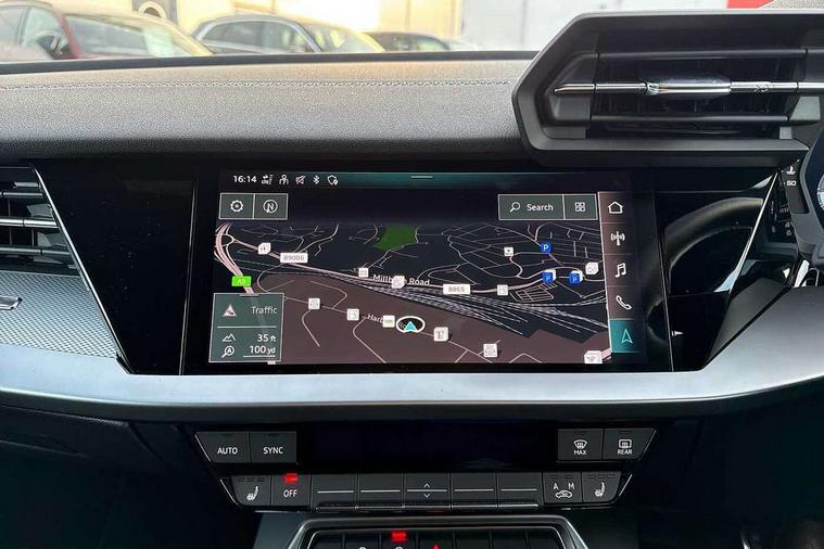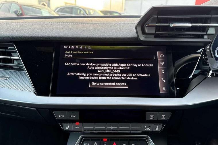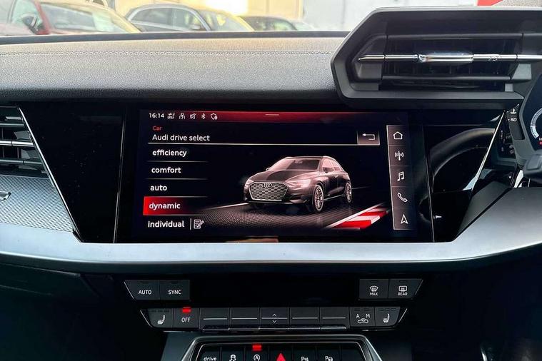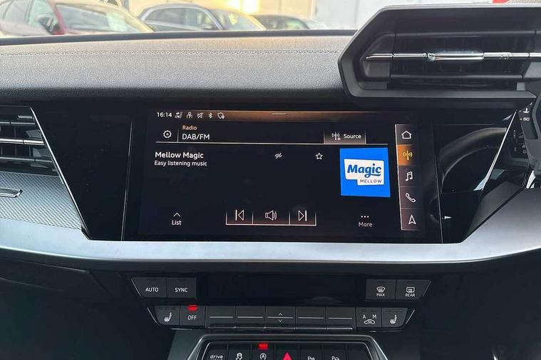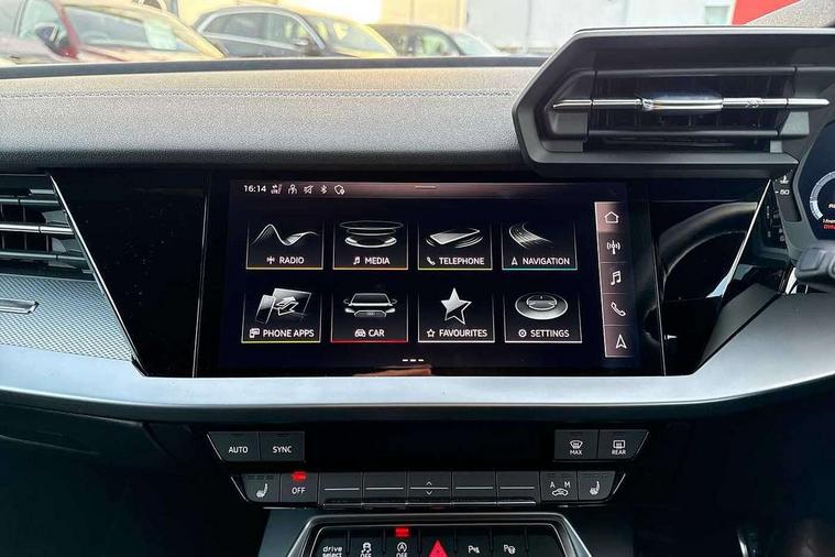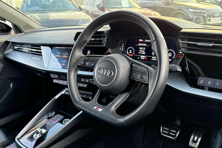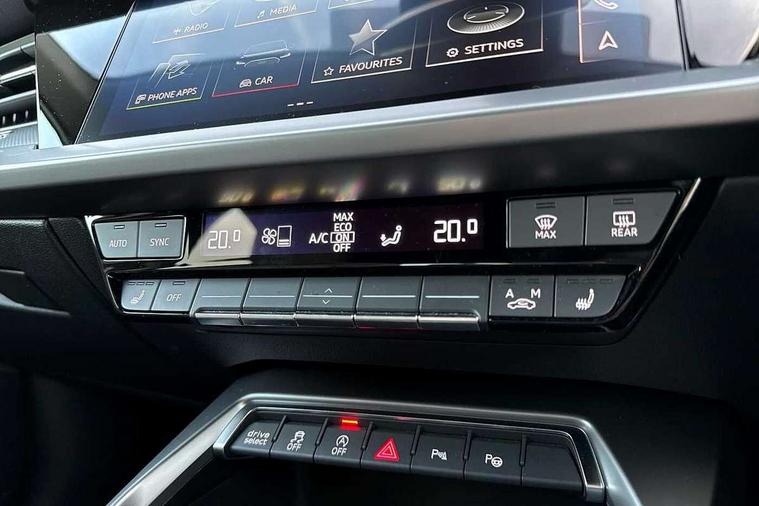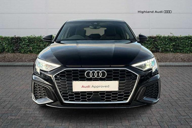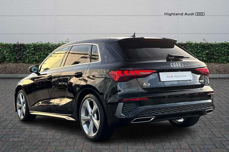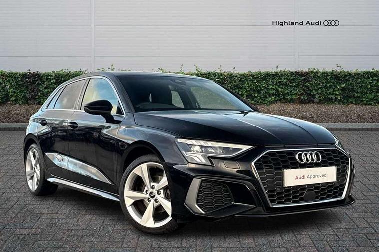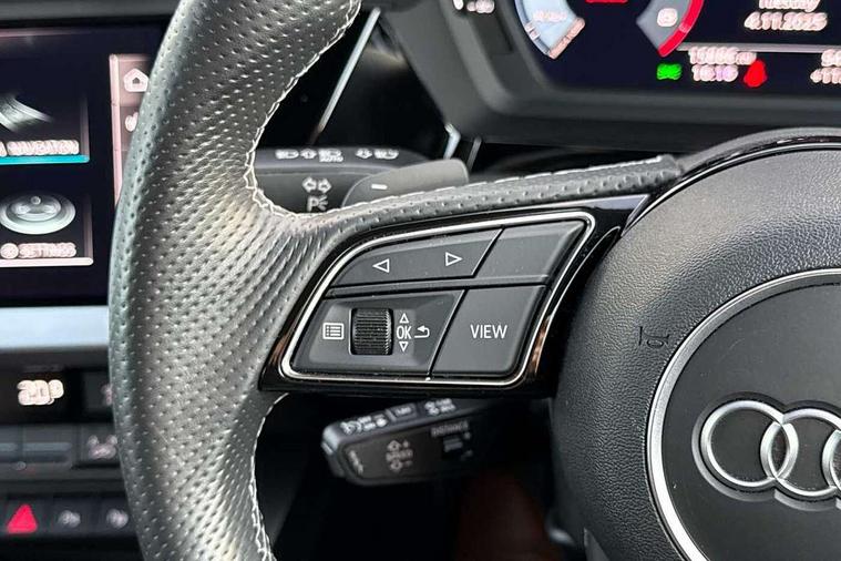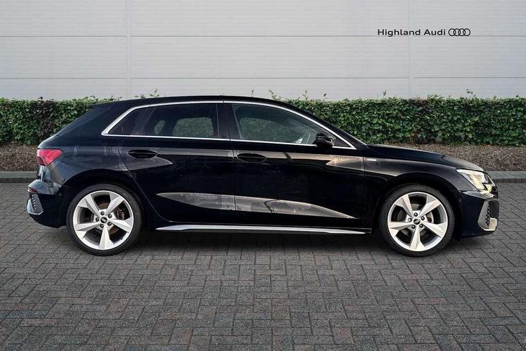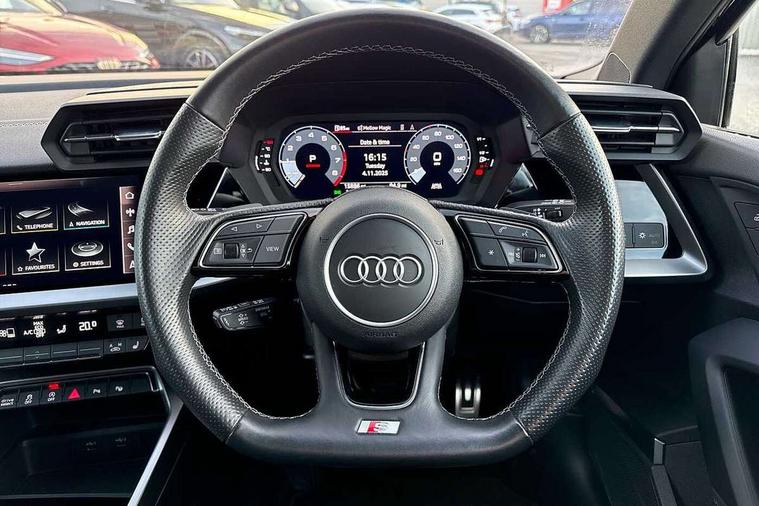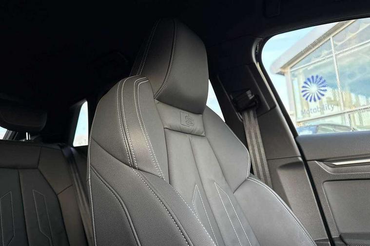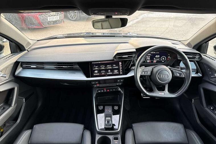 Audi connect emergency call and service, Audi drive select (Auto, Comfort, Dynamic, Efficiency and Individual), Audi smartphone interface, Audi Virtual Cockpit - 10.25" digital and colour instrument cluster, Automatic start/stop system with recuperation, Bluetooth interface, Collision avoidance assistant, Electromechanical power speed sensitive steering, Lane departure warning system, MMI Navigation Plus with high resolution 10.1" colour touch screen display, Service indicator, Trip computer, Voice control system with natural language interaction, 2xUSB-C connection with data and charging functions, 6 passive loudspeakers, DAB Digital radio, 3rd brake light, Acoustic glass windscreen, Aluminium window trim, Auto dimming frameless rear view mirror, Electrically adjustable/heated/folding/auto dimming door mirrors with integrated LED indications + kerb view function for passenger side, Front electric windows, Illuminated aluminium inserts front door sills with S logo, LED daytime running lights, LED headlights with LED rear lights and dynamic rear indicators, Light and rain sensors, Privacy glass - dark tinted rear window, rear door and side windows, Rear electric windows, Rear side air outlets in grained matt black, Rear wiper, S line bumpers, S roof spoiler, 12V socket and storage compartment in front centre console, 40/20/40 split folding rear seat bench with cupholder, Black cloth headlining, Dual zone electronic climate control, Front and rear centre armrest in leather, Front and rear headrests, Front/rear floor mats, Height and reach adjustable steering wheel, Interior lighting - glove compartment light and right hand side, Luggage compartment floor covering, Manual boot compartment lid, Manually adjustable front seats, Seat side bolsters, Stainless steel pedals and front footrest, Twin leather upholstery with front sports seats S embossed logo, Aluminium interior elements pack - A3 Sportback, S line styling pack - A3 Sportback, 3x3 point rear seat belts, Driver and front passenger airbag with passenger airbag deactivation, Electronic Stabilisation Control (ESC) including ABS, ASR and EDL, First aid kit with warning triangle and 2 safety vests, Front side airbags with head airbags and interaction airbag, Hill hold assist, Pre-sense front with pedestrian and cyclist detection, Seatbelt monitoring, Tyre pressure loss indicator, Anti theft alarm, Anti-theft wheel bolts, Electronically operated child lock, Immobiliser, Remote control central locking, Accent surfaces in the dashboard and centre console in platinum grey silk effect paint finish, Dark spectrum aluminium inlays,