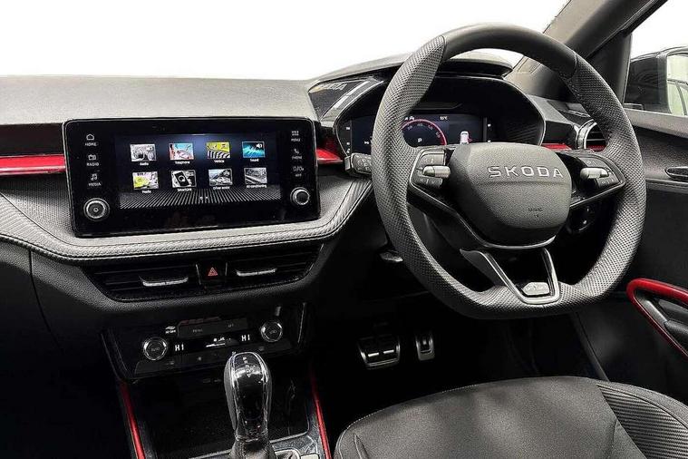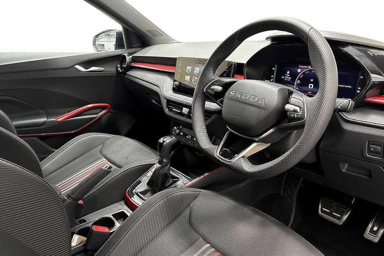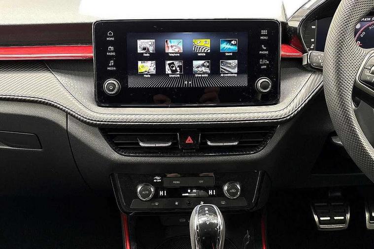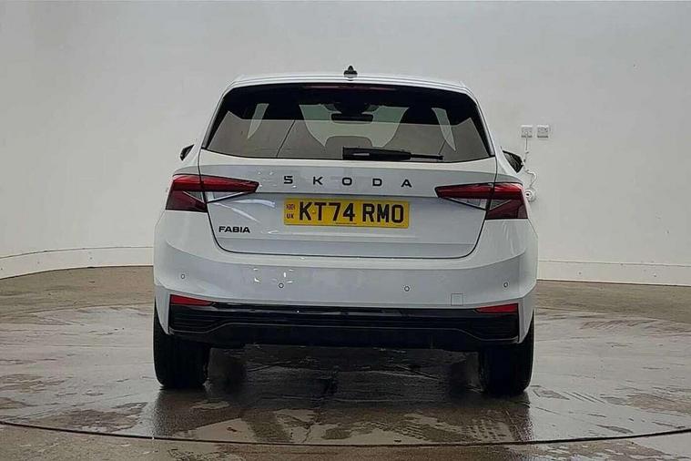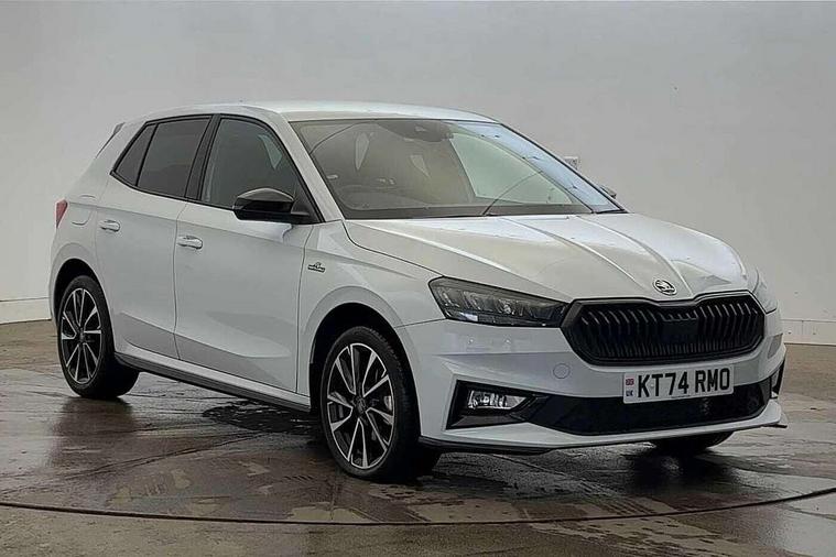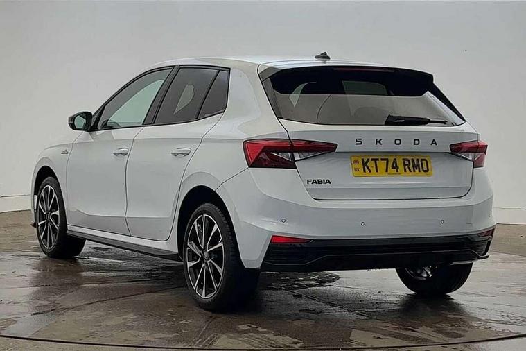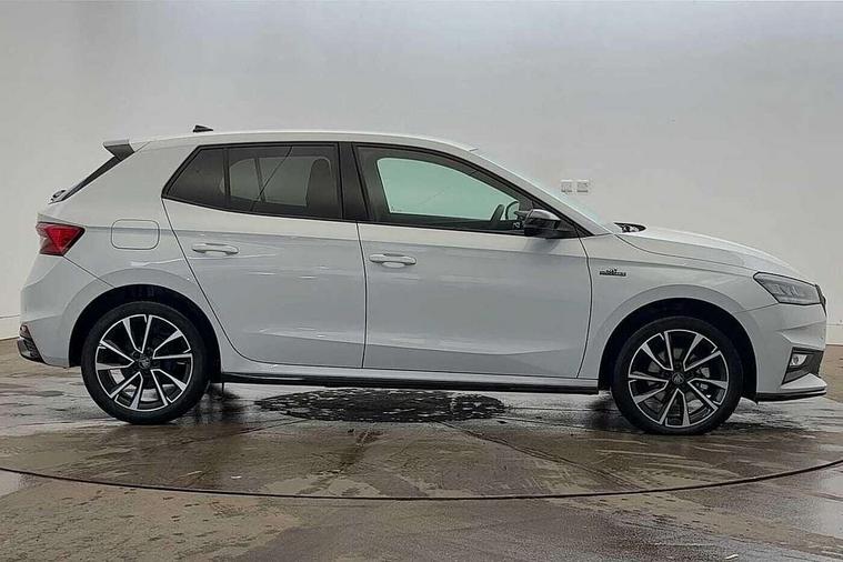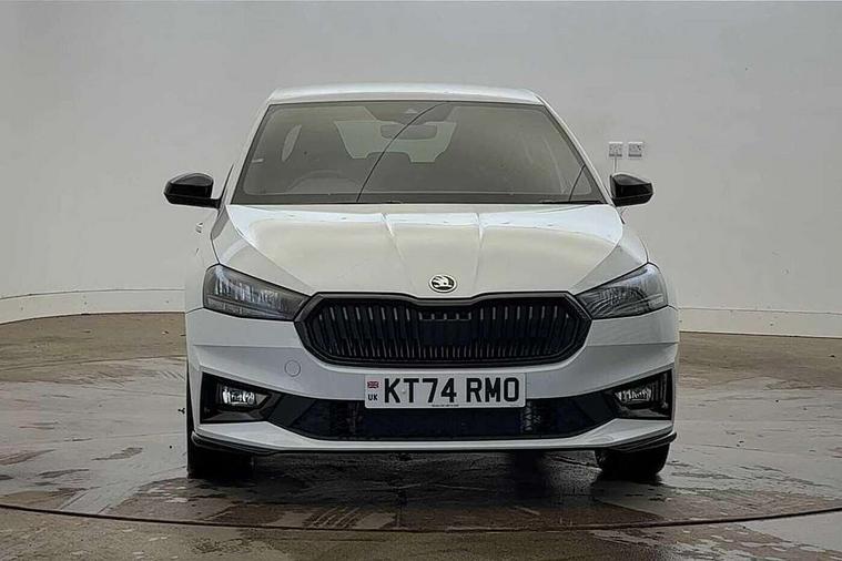 Advanced driver attention and drowsiness monitor, Bluetooth connection, Electromechanical power steering, Exterior temperature gauge, Service interval indicator, Traffic sign recognition, Virtual cockpit with 10.25" colour display, Wireless SmartLink for Apple CarPlay and Android Auto, 6 Speakers (4 in front and 2 in rear), Auxiliary socket for external MP3 player, DAB digital radio reception, Auto dimming rear view mirror, Black radiator grille, Body coloured bumpers, Door mirror integrated indicators, Front and rear electric windows, Front window wiper intermittent control, Headlight range control - Automatic, Ice scraper in fuel cap, LED daytime running lights with coming and leaving home feature, LED rear lights, Monte Carlo badging, Privacy glass, Rear LED fog light, Rear side wing doors, Rear window wiper with washing nozzles, Roof mounted spoiler, SKODA tailgate lettering in black, Sports bumpers, Third brake light, 2 reading lights in front and 2 reading lights in rear, 3 rear headrests, Aluminium pedals, Backrest split and folding, Black headlining, Central console with removable cup holder and storage box, Chrome handbrake release button, Door sills with fabia badging, Dual zone air conditioning with climatronic electronic control, Fabric/artificial leather upholstery, Front centre armrest, Front sports seats, Gearshift knob/handle in leather, Hand brake lever handle in leather, Height adjustable front headrests, Height adjustable front seats, Height adjustable steering wheel, ISOFIX and TopTether anchorage points to the outer rear seats, ISOFIX and TopTether on the front passenger seat, Luggage compartment lighting, Manually adjustable lumbar support in front seats, Metallic painted red central console cover, Metallic red interior door handles, Pollen filter, Rear seat bench unsplit, Single front passenger seat, Sun visors with mirror and airbag label on passenger side, Textile floor mats, Ticket holder, Umbrella in drivers door, 3-point height adjustable front seats belts with pretensioner and force limiter, Automatic warning lights in case of crash, Driver and passengers airbag with switch off function, e-Call+, ESC including ABS, MSR, ASR, EDS, HBA and XDS, Front and rear seat belt warning, FRONT ASSIST (AEB City and AEB Inter Urban), Front side airbags, Head airbags, Hill hold control, One tone horn, Pedestrian protection, Three rear 3-points safety seat belts with pretensioner and force limiter including stop function for outer rear seat belts, Tyre pressure monitoring system, Anti-theft alarm system including immobiliser, interior monitoring, backup horn, and towing protection, Central locking with radio remote control, interior controls, SAFE function and 2 foldable keys, Carbon effect door and side trim panels, Carbon effect lower decorative trim with white stitching, Monte carlo air vents, Red metallic upper decorative trim, Anti-theft wheel bolts protection, Super-low rolling resistance tyres,