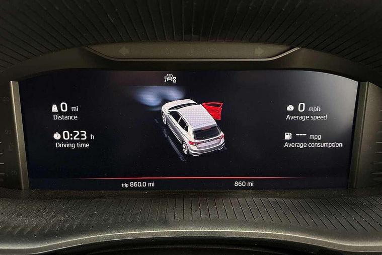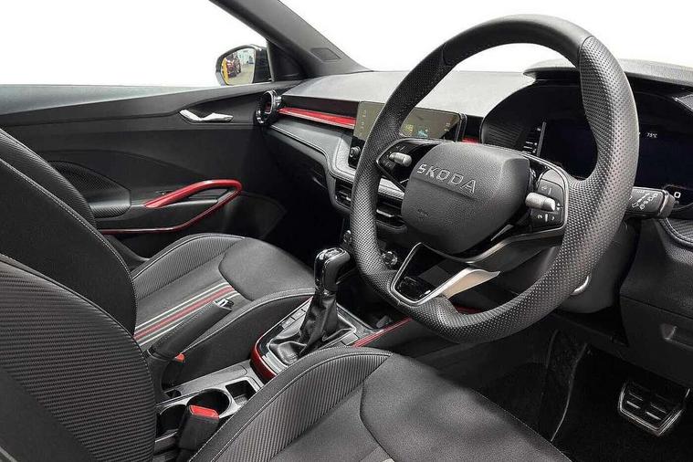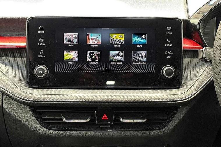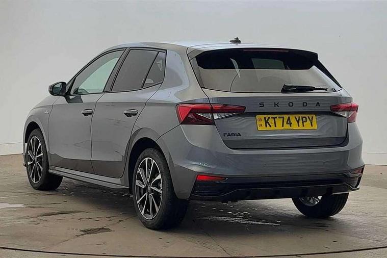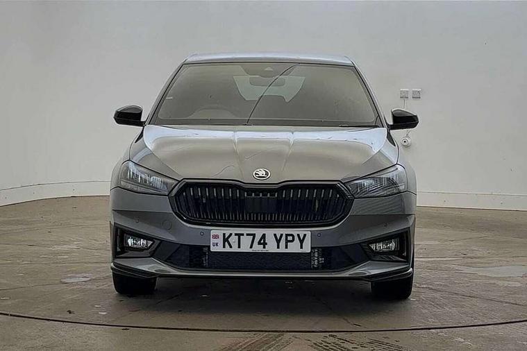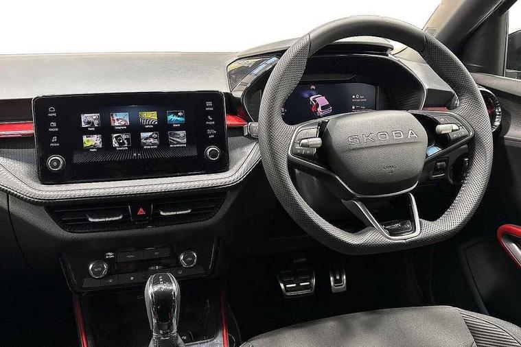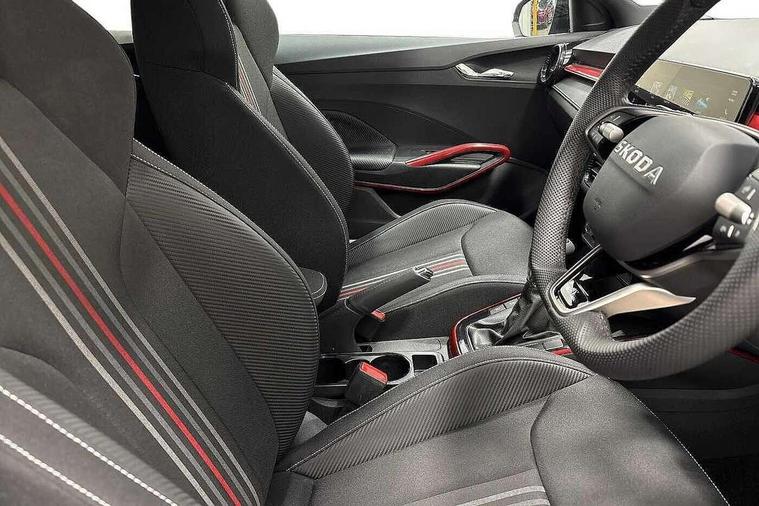 Advanced driver attention and drowsiness monitor, Bluetooth connection, Electromechanical power steering, Exterior temperature gauge, Service interval indicator, Traffic sign recognition, Virtual cockpit with 10.25" colour display, Wireless SmartLink for Apple CarPlay and Android Auto, 6 Speakers (4 in front and 2 in rear), Auxiliary socket for external MP3 player, DAB digital radio reception, Auto dimming rear view mirror, Black radiator grille, Body coloured bumpers, Door mirror integrated indicators, Front and rear electric windows, Front window wiper intermittent control, Headlight range control - Automatic, Ice scraper in fuel cap, LED daytime running lights with coming and leaving home feature, LED rear lights, Monte Carlo badging, Privacy glass, Rear LED fog light, Rear side wing doors, Rear window wiper with washing nozzles, Roof mounted spoiler, SKODA tailgate lettering in black, Sports bumpers, Third brake light, 2 reading lights in front and 2 reading lights in rear, 3 rear headrests, Aluminium pedals, Backrest split and folding, Black headlining, Central console with removable cup holder and storage box, Chrome handbrake release button, Door sills with fabia badging, Dual zone air conditioning with climatronic electronic control, Fabric/artificial leather upholstery, Front centre armrest, Front sports seats, Gearshift knob/handle in leather, Hand brake lever handle in leather, Height adjustable front headrests, Height adjustable front seats, Height adjustable steering wheel, ISOFIX and TopTether anchorage points to the outer rear seats, ISOFIX and TopTether on the front passenger seat, Luggage compartment lighting, Manually adjustable lumbar support in front seats, Metallic painted red central console cover, Metallic red interior door handles, Pollen filter, Rear seat bench unsplit, Single front passenger seat, Sun visors with mirror and airbag label on passenger side, Textile floor mats, Ticket holder, Umbrella in drivers door, 3-point height adjustable front seats belts with pretensioner and force limiter, Automatic warning lights in case of crash, Driver and passengers airbag with switch off function, e-Call+, ESC including ABS, MSR, ASR, EDS, HBA and XDS, Front and rear seat belt warning, FRONT ASSIST (AEB City and AEB Inter Urban), Front side airbags, Head airbags, Hill hold control, One tone horn, Pedestrian protection, Three rear 3-points safety seat belts with pretensioner and force limiter including stop function for outer rear seat belts, Tyre pressure monitoring system, Anti-theft alarm system including immobiliser, interior monitoring, backup horn, and towing protection, Central locking with radio remote control, interior controls, SAFE function and 2 foldable keys, Carbon effect door and side trim panels, Carbon effect lower decorative trim with white stitching, Monte carlo air vents, Red metallic upper decorative trim, Anti-theft wheel bolts protection, Super-low rolling resistance tyres,