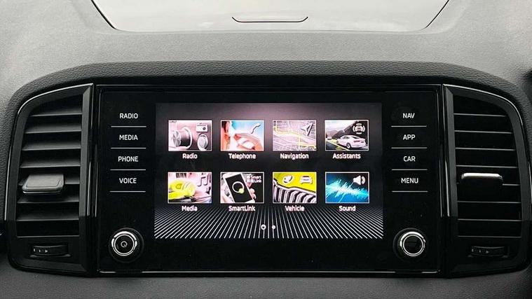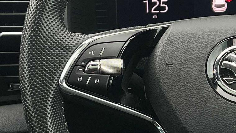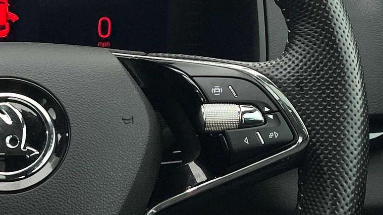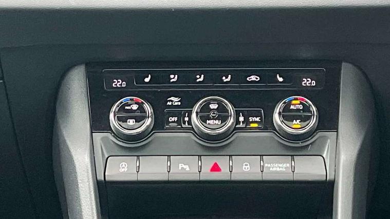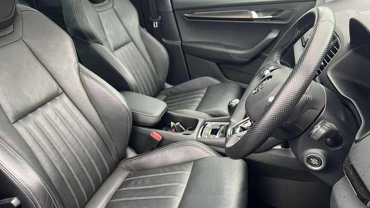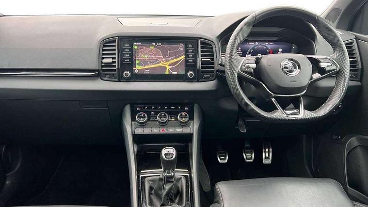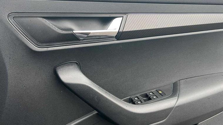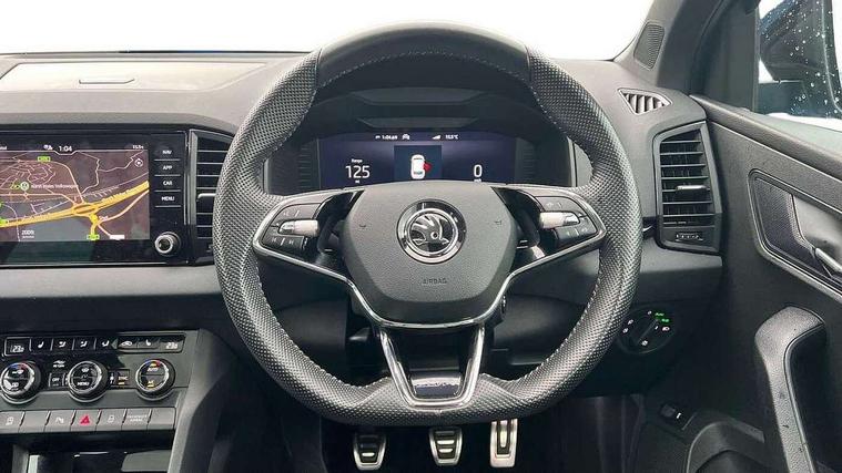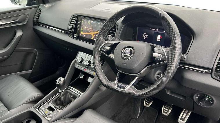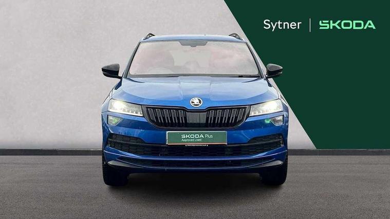 Care connect, Drive mode selector, Driver fatigue sensor, Multifunction colour trip computer, Outside temperature gauge, Service interval indicator, SmartLink wireless for Apple and wired for Android, Start/stop system with regenerative braking, USB C Port x 2 in front centre console, DAB radio with Bluetooth, USB connection, Wireless charging without wireless aerial connection, Acoustic glass, Aero front windscreen wipers with intermittent function, Automatic headlight control system, Black door mirrors, Black electric window control buttons, Black radiator grille, Black roof rails, Body colour door handles, Body coloured bumpers, Electric front and rear windows with child proof lock, Front door steps with SportLine logo, Full LED headlights + adaptive front light system + LED daytime running lights and front cornering fog lights, Headlight washers, Heated rear windscreen, LED rear lights with high functionality, Light assistant (coming/leaving home/tunnel light), Panoramic sliding sunroof, Privacy glass, Protective door side sills in body colour, Rear diffuser, Safety reflectors on front doors, Skoda lettering on tailgate in black, Sportline badge on front fender, Sportline decorative inserts with badging, Sports front and rear bumpers, Third brake light, 1.5 litre bottle holders in driver and front passenger door panels, 12V socket in boot, 12v socket in front centre armrest with storage compartment and rear air vents, 2 Folding hooks and nets in boot, 2 Front readings lights for driver and passenger, 3 rear height adjustable headrests, 4 foldable roof handles with rear coat hooks, Aluminium pedals, Black roof headlining, Cargo elements in boot, Chrome inner door handles, Door sill scuff plates, Driver and passenger seats height adjust, Front head restraints, Height adjustable front three point seats belts with tensioners, Height/reach adjust steering wheel, Ice scraper, Illuminated and cooled glovebox, Illuminated luggage compartment, Isofix child seat preparation outer rear, Manual lumbar support for front seats, Net programme in boot, Pen holder, Pollen filter, Rear reading lights, Rear seats fixed folding and divided 60:40, Retractable parcel shelf attachable to tailgate, Safety vest holder, Solid rear boot cover, Storage box in upper central dashboard closed, Storage compartment below the passenger seat, Sunvisors with illuminated vanity mirrors, Textile floor mats, Umbrella under passenger seat, Welcome animation with sportline logo, LED Interior lighting pack with Skoda welcome logo - Karoq, Airbags - Front side, head, knee and curtain, Automatic door unlocking in case of crash, Automatic fuel cut off in case of crash, Driver airbag, Electronic parking brake with auto hold function, Emergency rear braking signal, ESC including ABS, MSR, ASR, EDS, HBA, DSR, RBS, MKB and traction control, Front assist radar scanning of the space in front of the car with automatic braking, Hill hold control, Passenger airbag with switch-off function, Pedestrian monitor, Seatbelt reminder signalisation and pretensioner for all seats, Three point seatbelts rear, Two tone horn, Tyre pressure display, Tyre pressure monitor, Alarm with interior monitoring, back up horn and tilt sensor with safe function, Electronic engine immobiliser, Keyless entry and keyless start with safe system, Remote central locking with 2 remote folding keys, Black air vent surround, 19" Vega anthracite alloy wheels, Anti-theft wheel bolts protection, Storage on wheel cover,